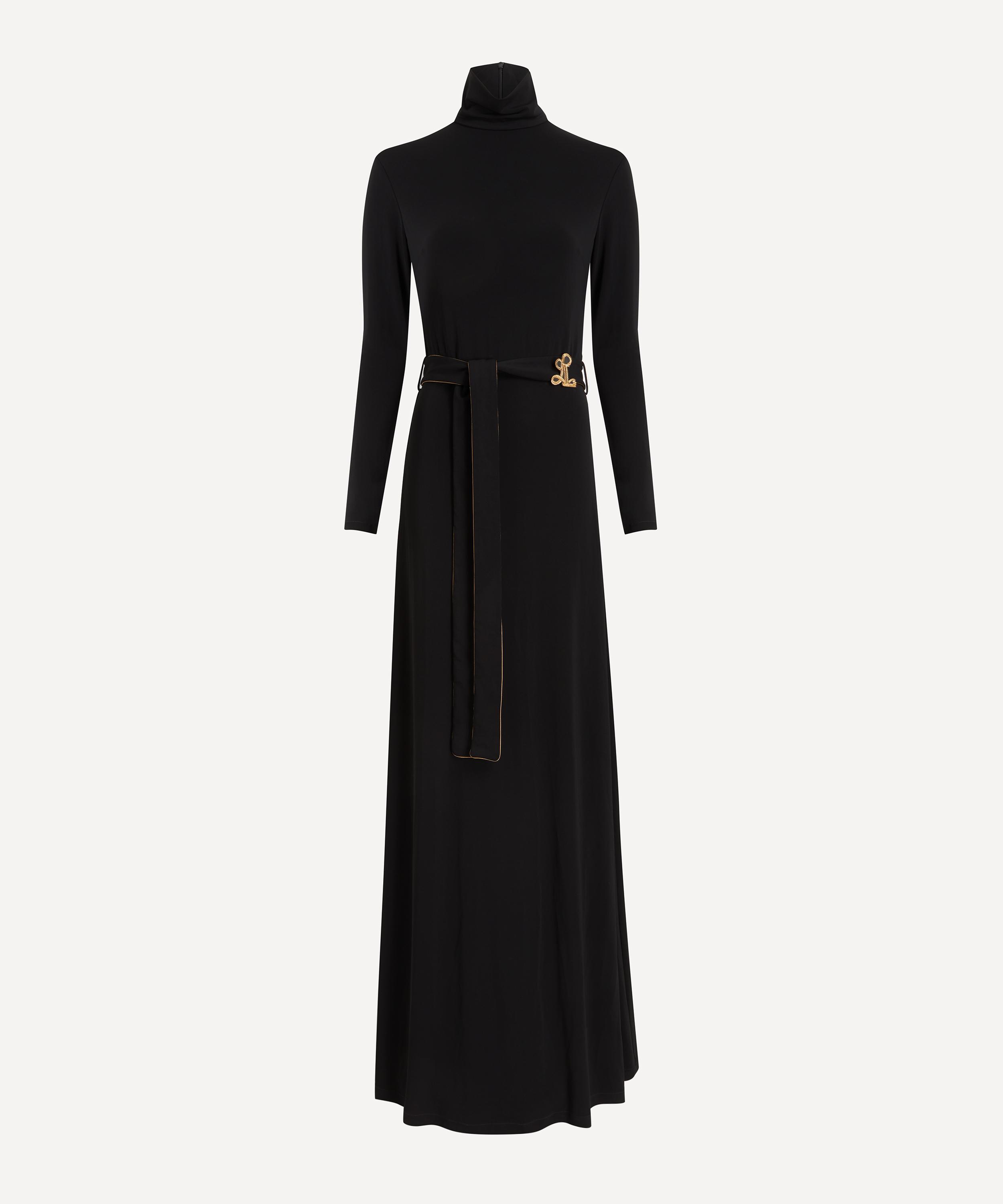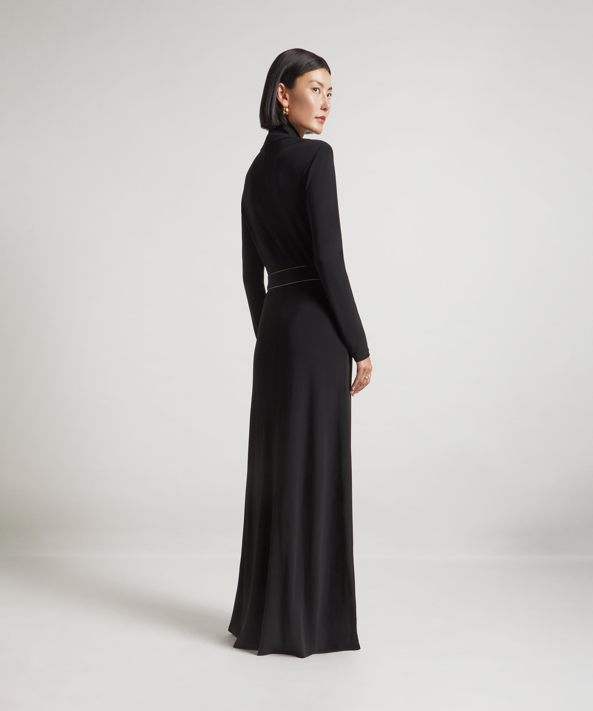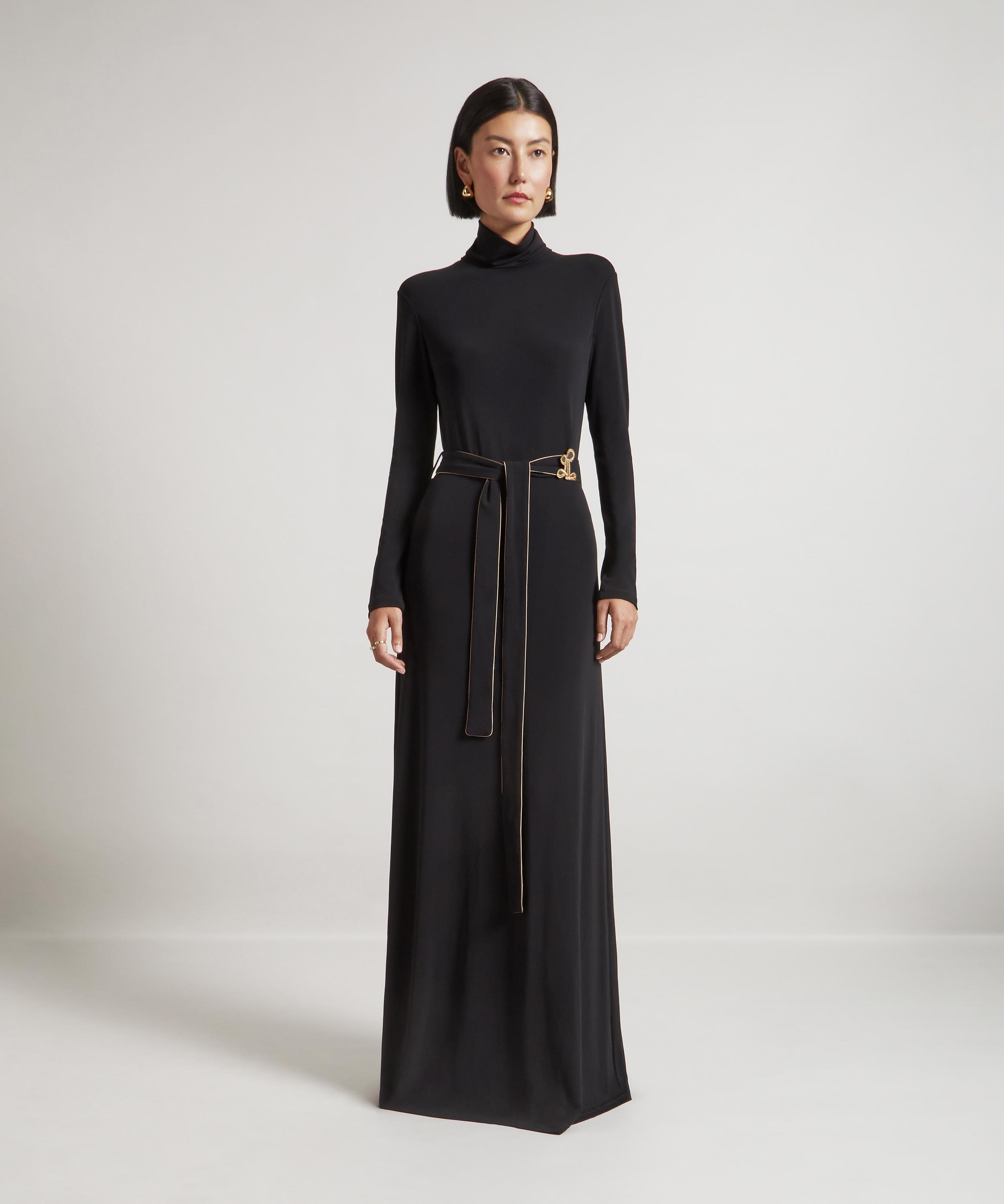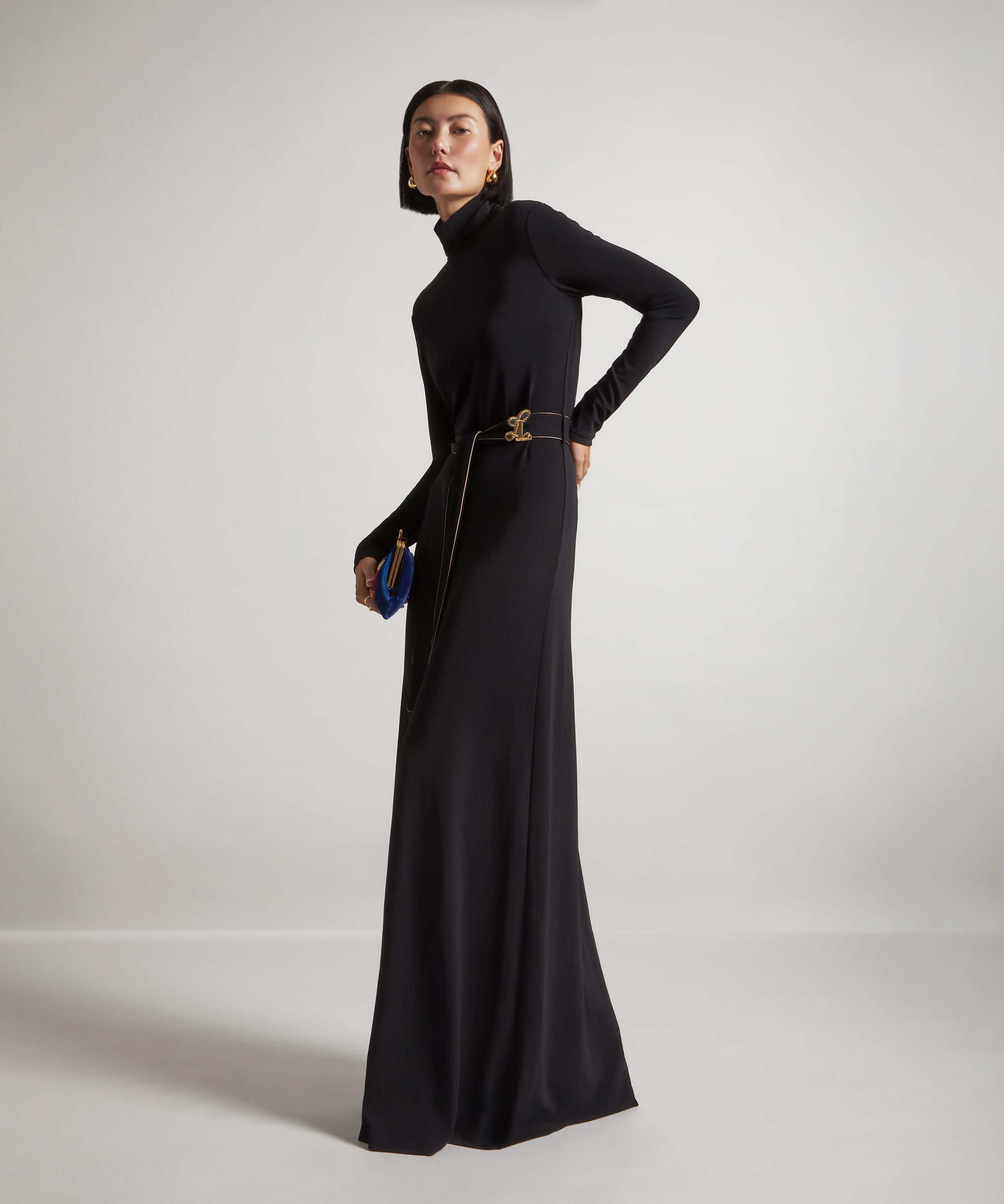 Expertly crafted in Italy from heavy jersey crepe, this longline dress is the embodiment of understated sophistication. Designed with a modest turtleneck, long sleeves, and a flattering A-line silhouette, it’s cinched at the waist with a matching belt - detailed with intricate bronze piping and finished with a gold, hand-embroidered Double L belt loop for a subtle signature touch.