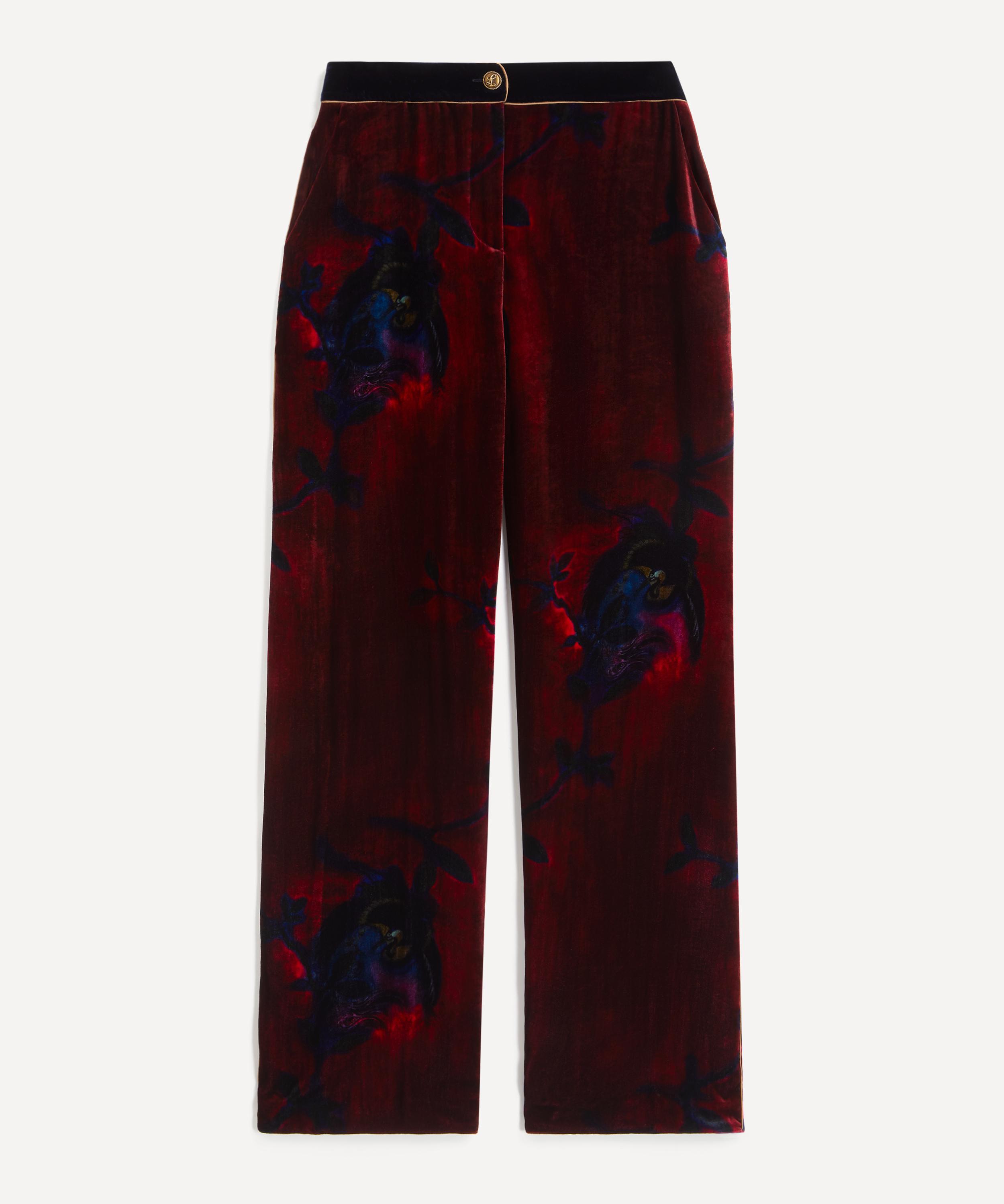 Expertly crafted in Italy from sumptuous silk velvet, these trousers are adorned with the painterly Heron print, sourced from the Liberty Archive - a reimagined scarf motif, hand-selected from the Liberty Archive and reinterpreted by Frida Giannini. Cut to a loose, straight-leg silhouette, they embody refined sophistication - elevated by intricate bronze piping and finished with hand-crafted Double L bronze buttons.