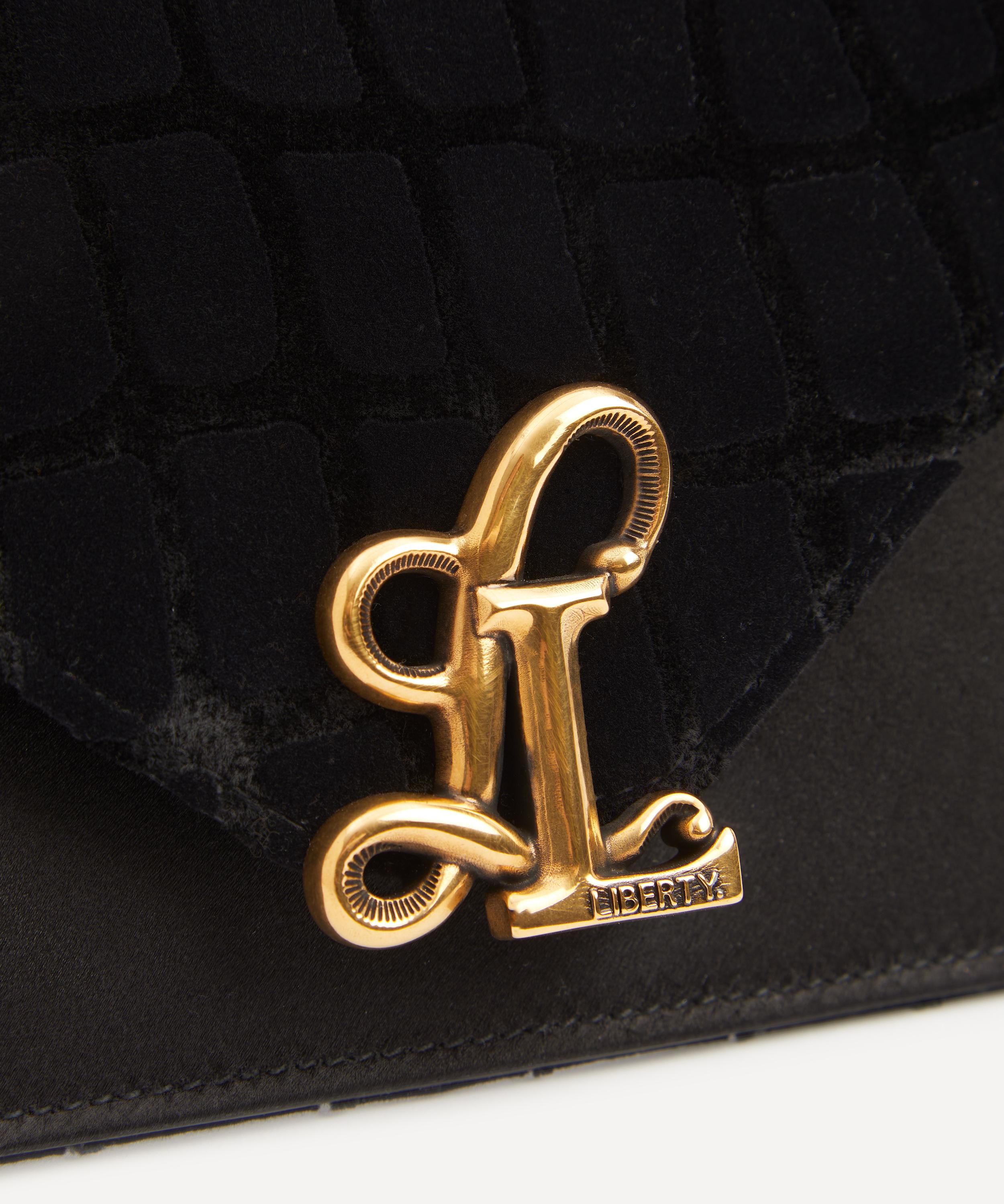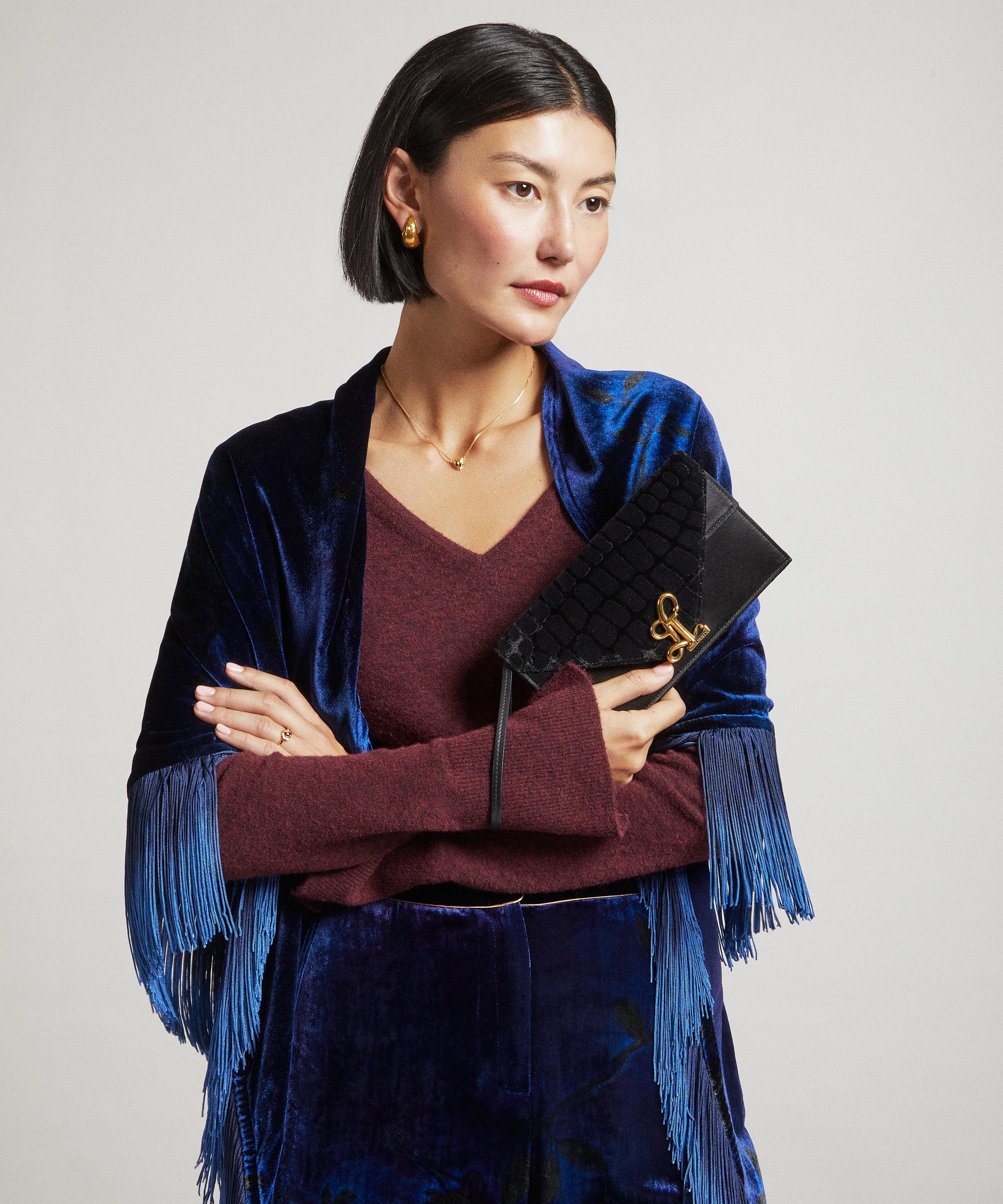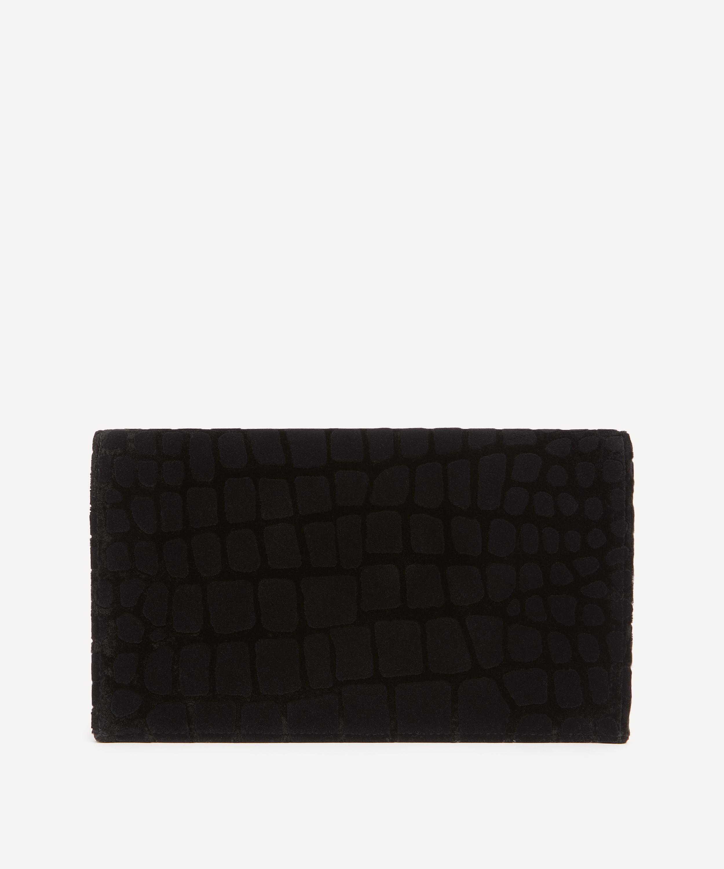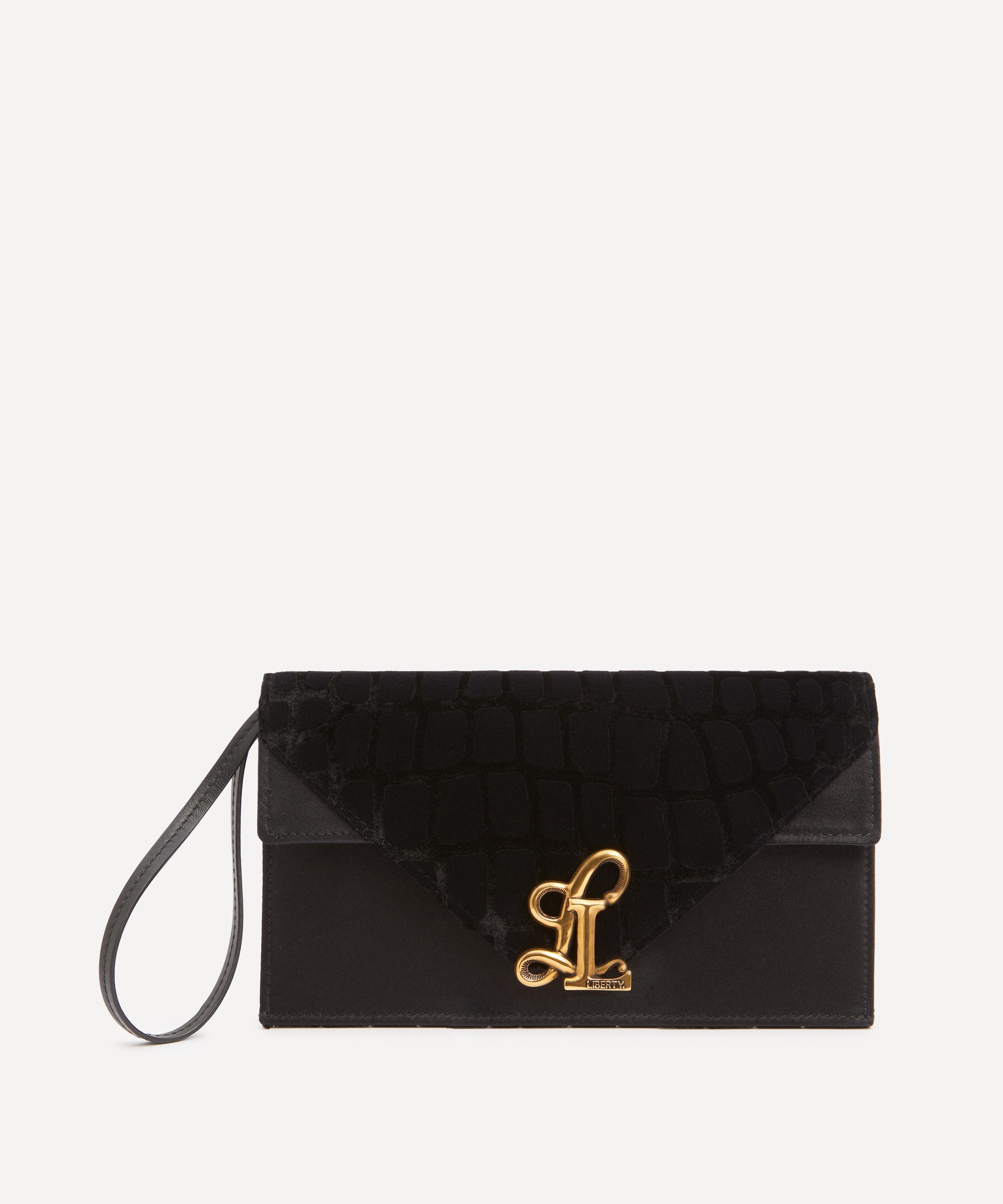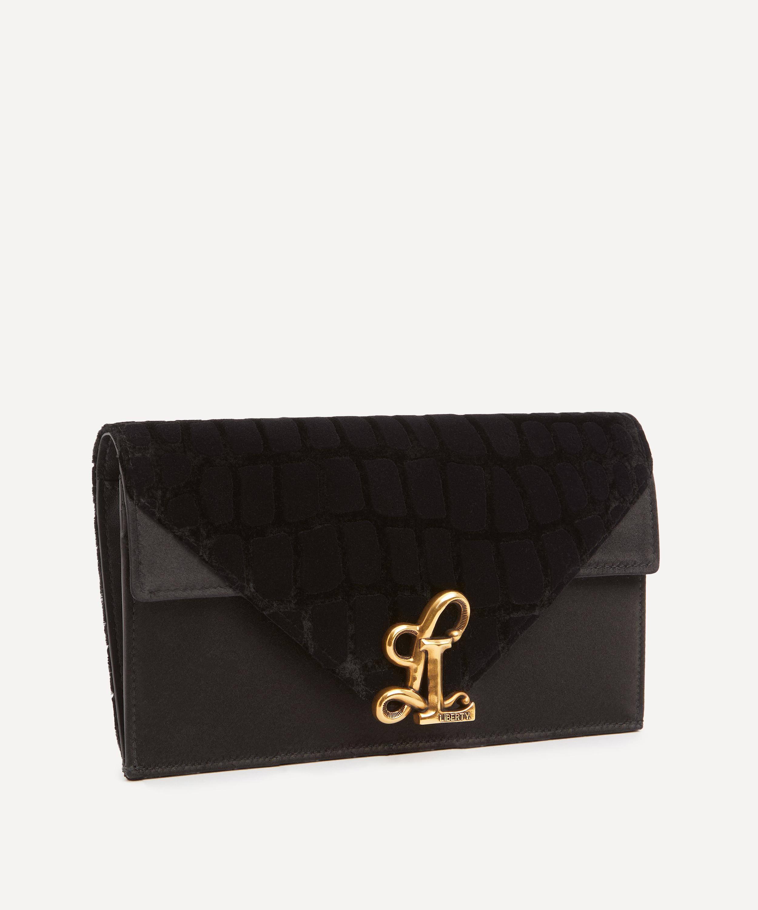 Masterfully crafted in Italy from luxurious satin, The Regent Wristlet Bag features an envelope-shaped silhouette with our custom Hypernova printed lining and a croc-embossed velvet front flap. Defined by a magnetic, deco-inspired double L closure – an emblematic signature of the collection, it blends functionality with a refined edge through precision topstitching and internal card pockets. Complete with a wristlet strap, it can be secured around the wrist or tucked neatly under your arm as a clutch.