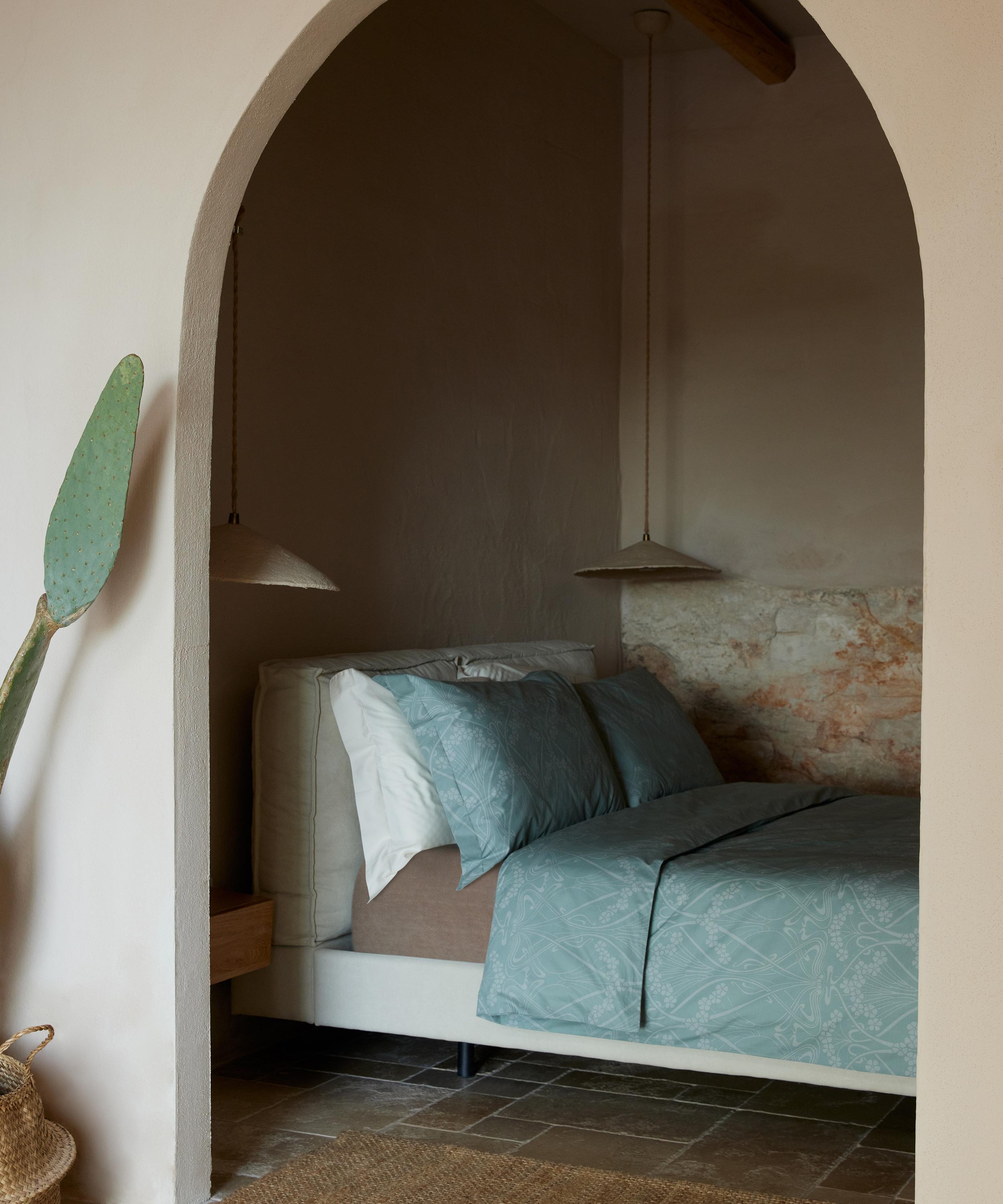 Liberty’s Ianthe Bloom duvet set features two standard pillowcases and a king duvet cover, all crafted from luxurious cotton bonneville – a silky-smooth and soft material with a lightweight finish. Printed at our very own Italian fabric mill, Ianthe was originally devised as a wallpaper border in c.1902 by French artist René Beauclair and reimagined for the ‘swinging London’ market by the Haward Studio, a family textile firm who sold designs to Liberty for three generations, from the Edwardian era to the 1980s. Use the set as a pop of vibrancy within a pared-down bedroom set-up, or go all out with jewel-toned velvet lampshades and clashing curtains to embrace the trend for full-blown maximalism.
