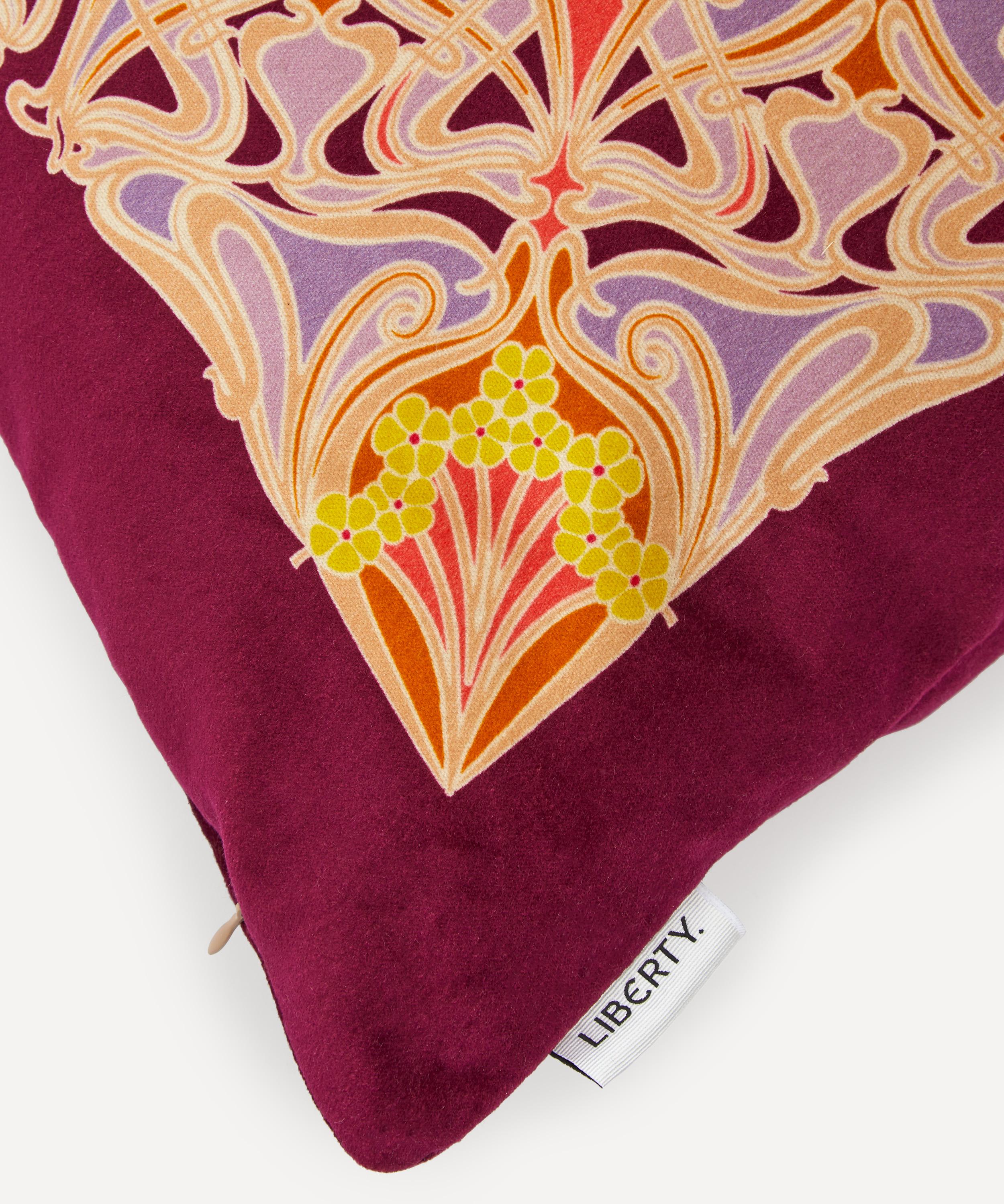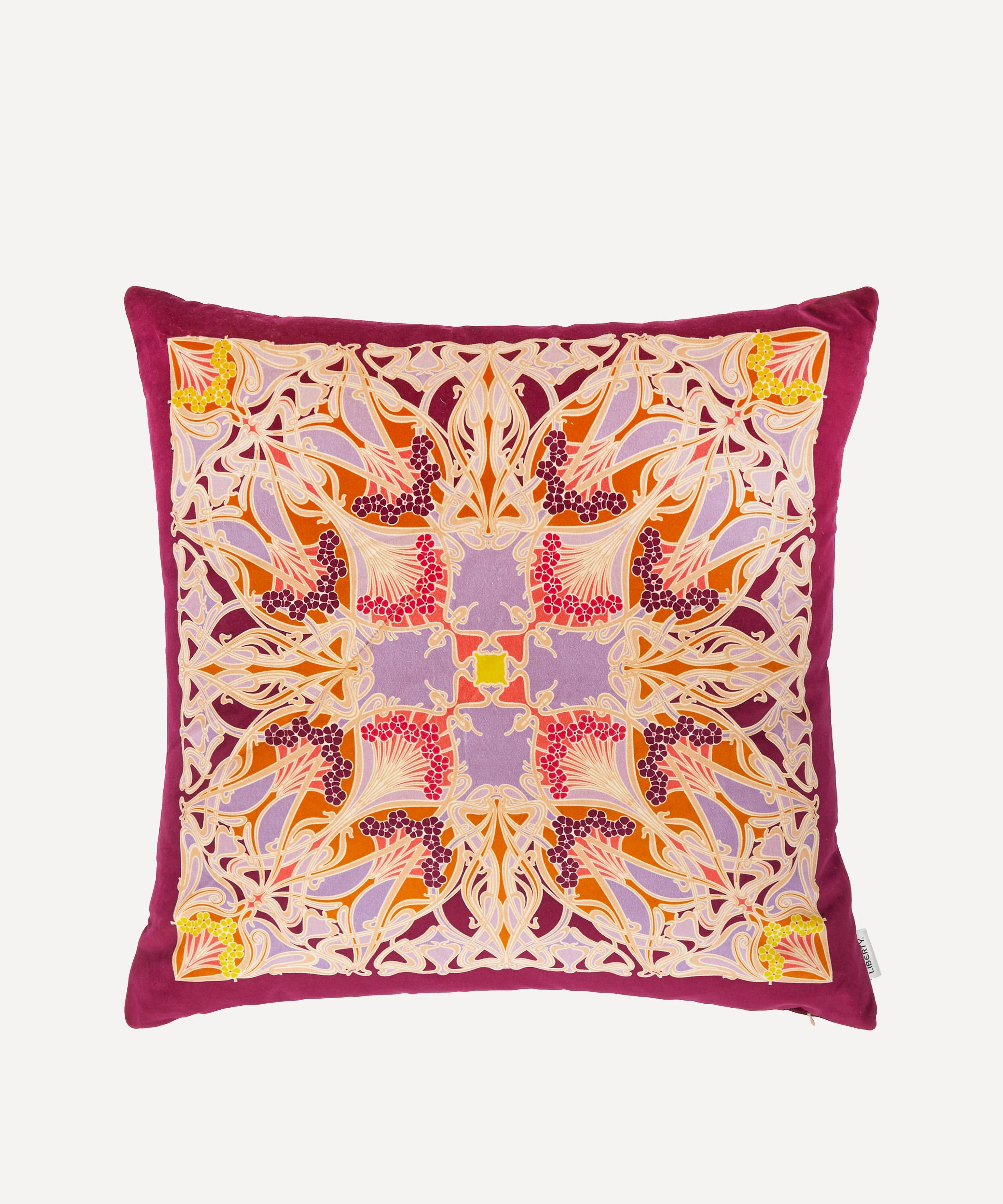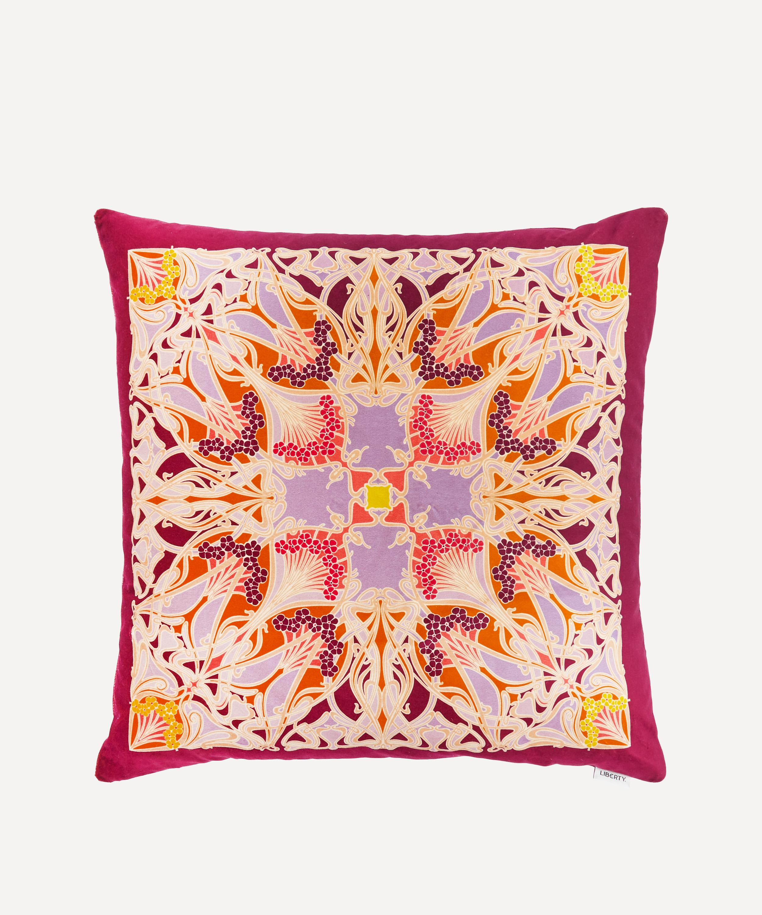 Liberty’s square velvet cushion is crafted in England from rich velvet with a plump duck feather filling, its kaleidoscopic Ianthe placement design printed by experts in Italy.