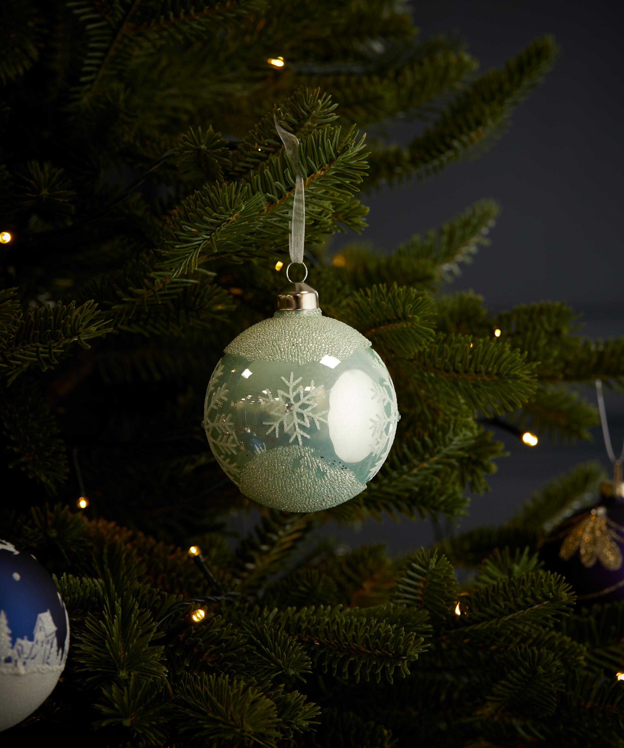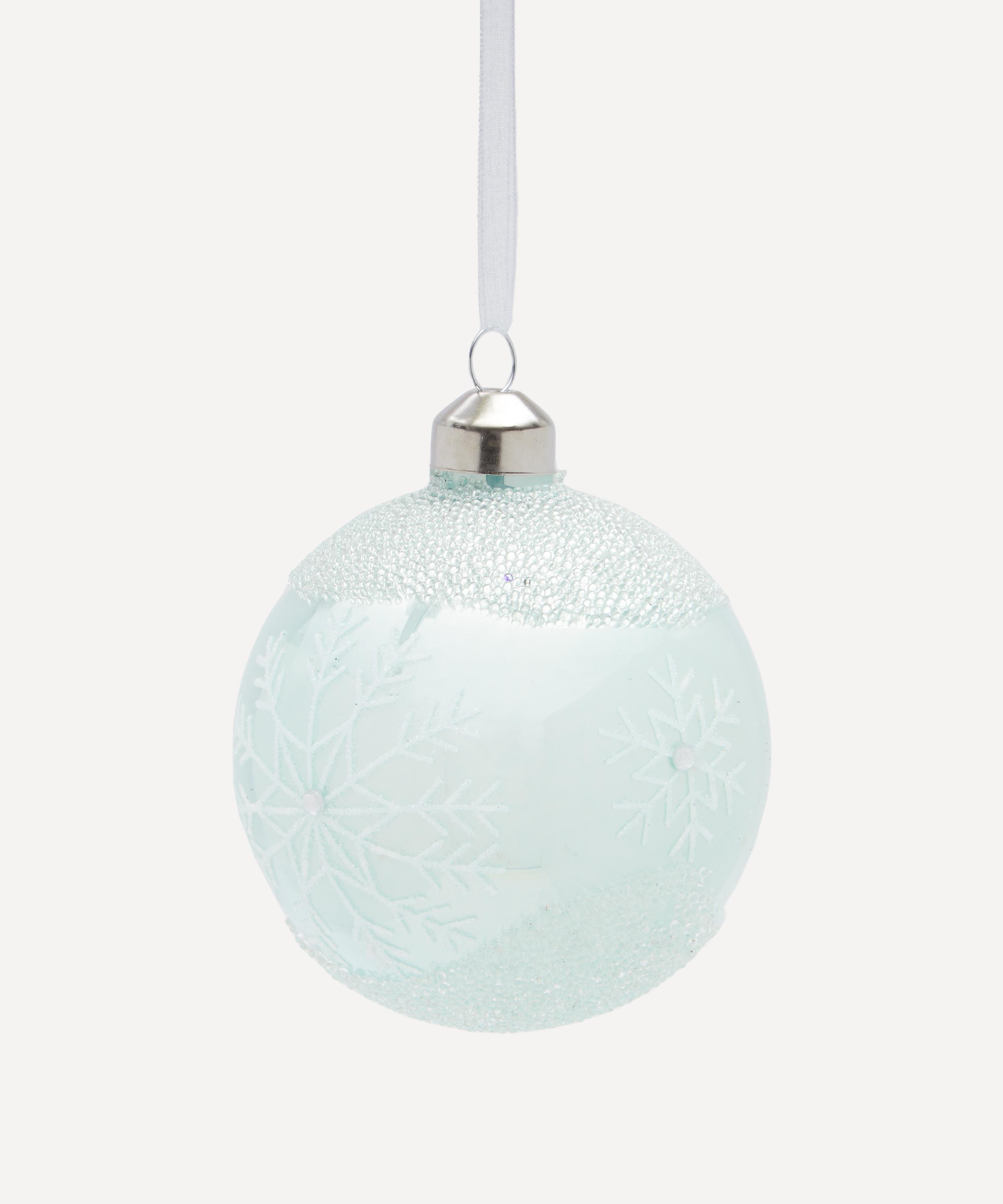 Designed in a classic spherical form, it’s meticulously embellished with white snowflakes, glitter, beads and gem detailing, ready to take pride of place on your seasonal pine. Bound to become a permanent addition in your Christmas collection, pair it with a mix of silver, icy blue, sparkling and clear glass ornaments to create your take on a white Christmas theme.