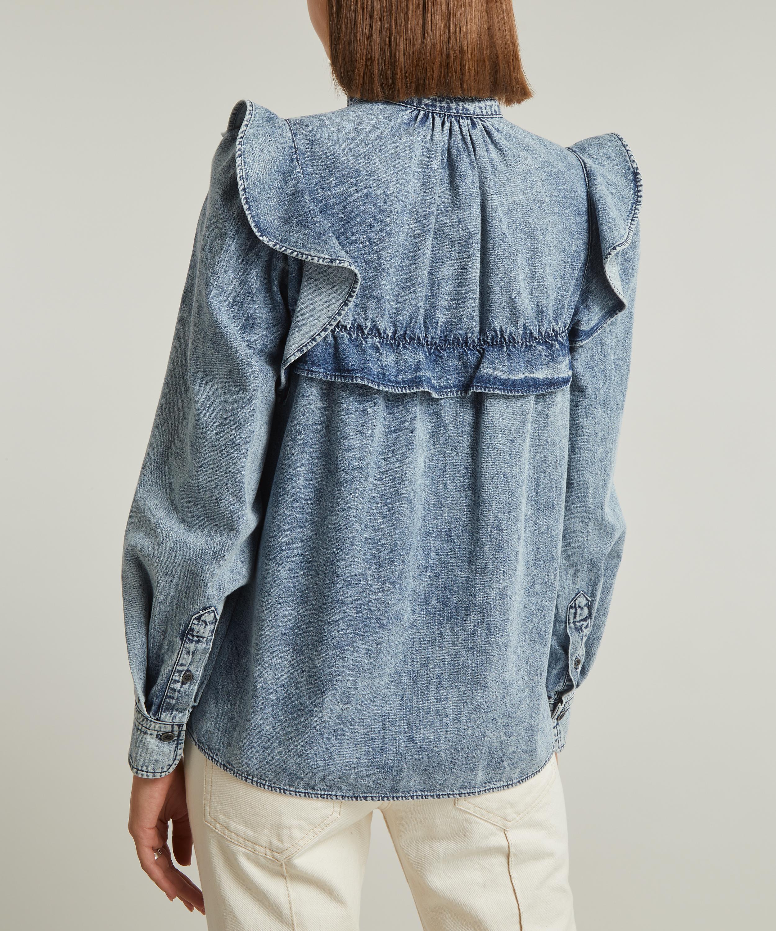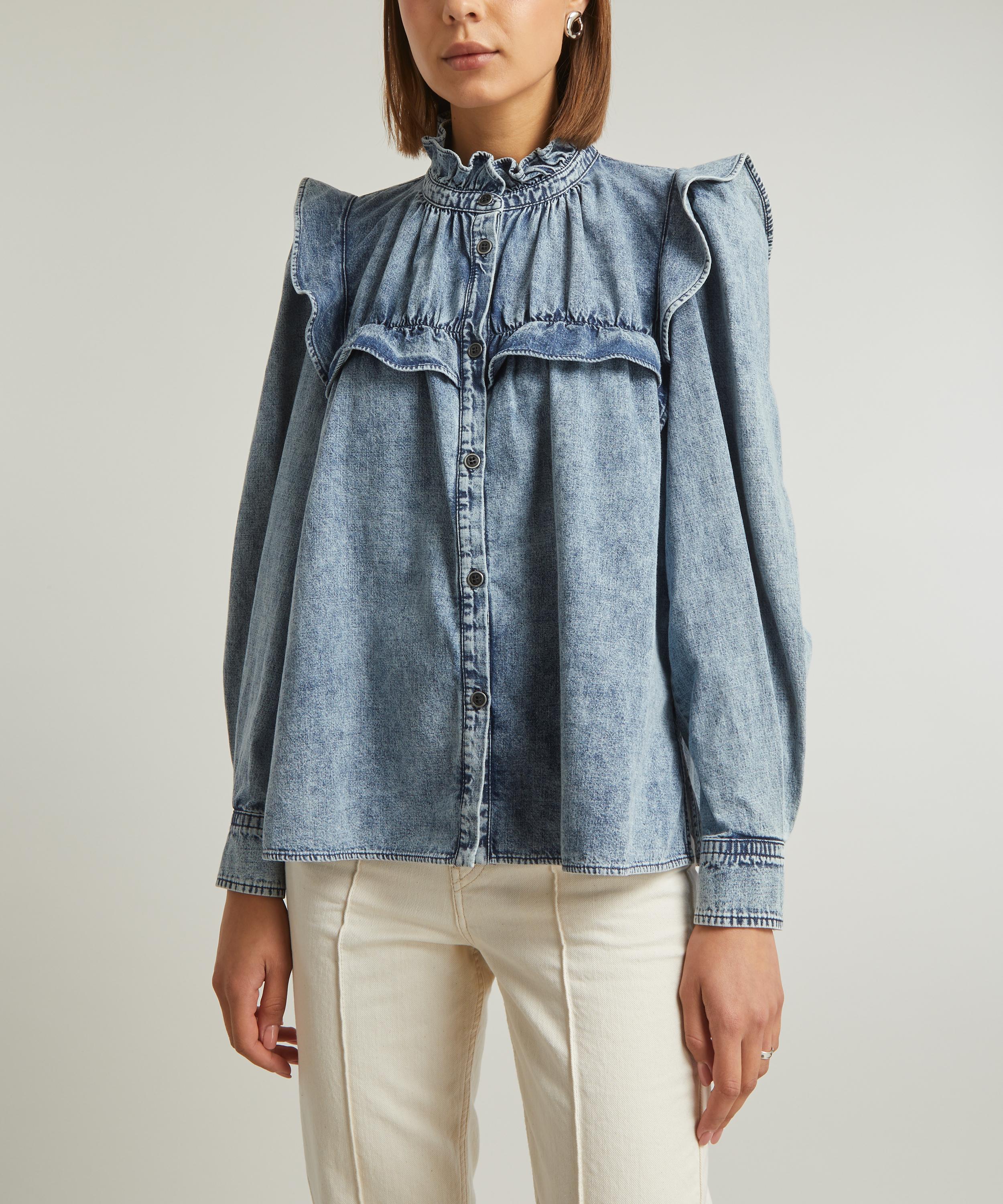 Crafted from lightweight cotton chambray for a loose fit with long puffed sleeves, this feminine frilled shirt is adorned with ruffles along its high-neckline, yoke and shoulders.