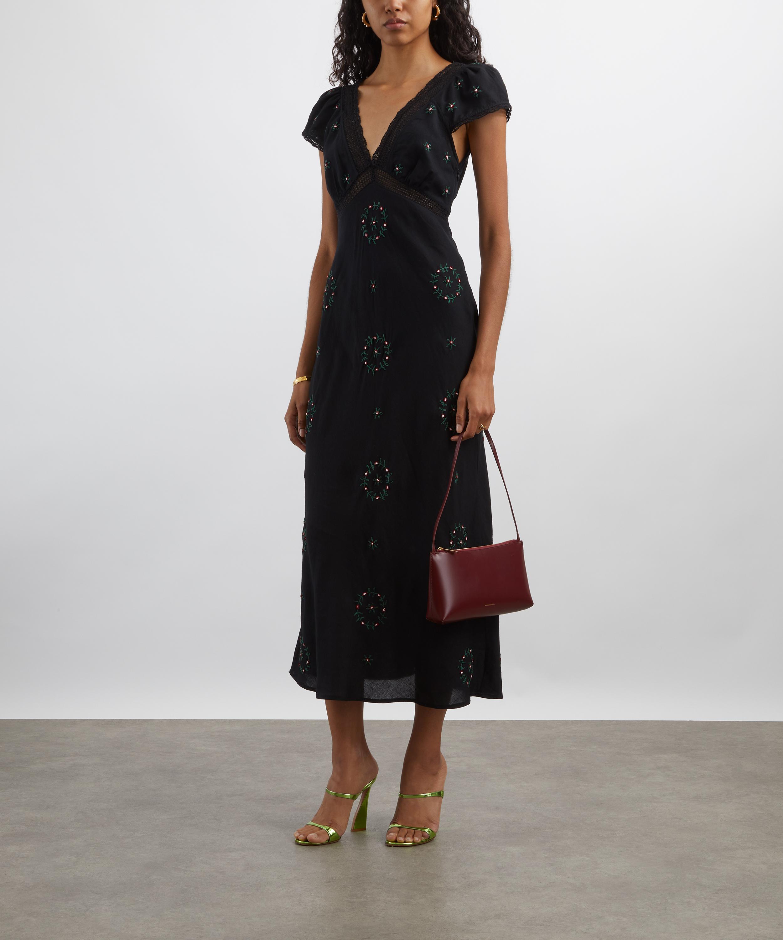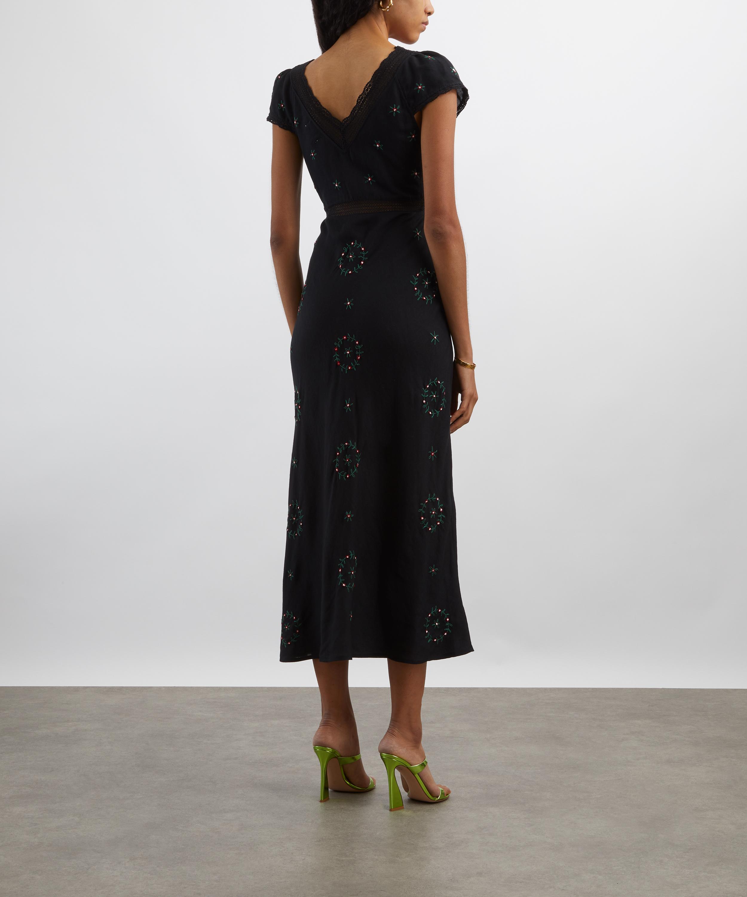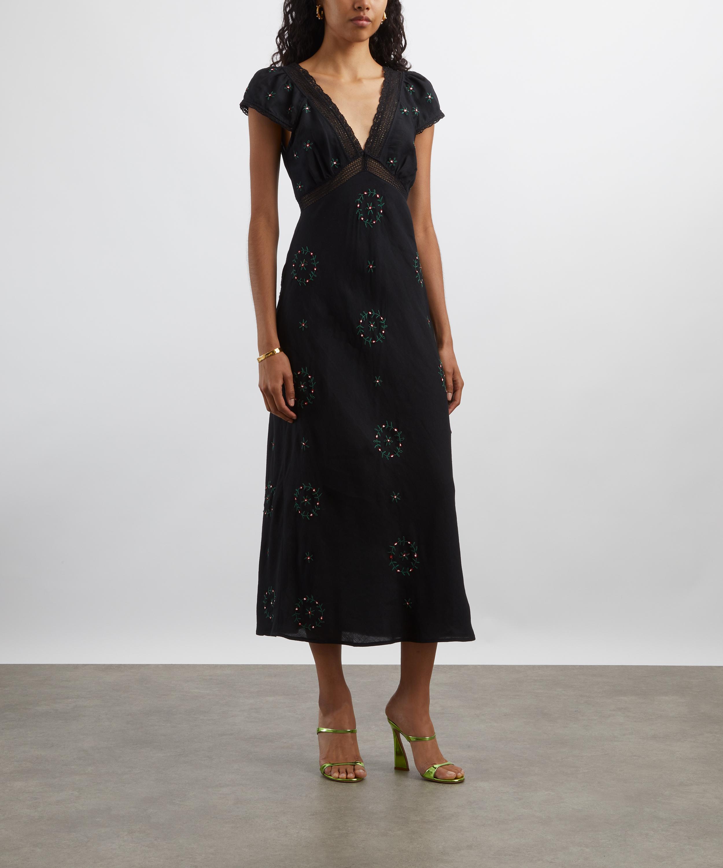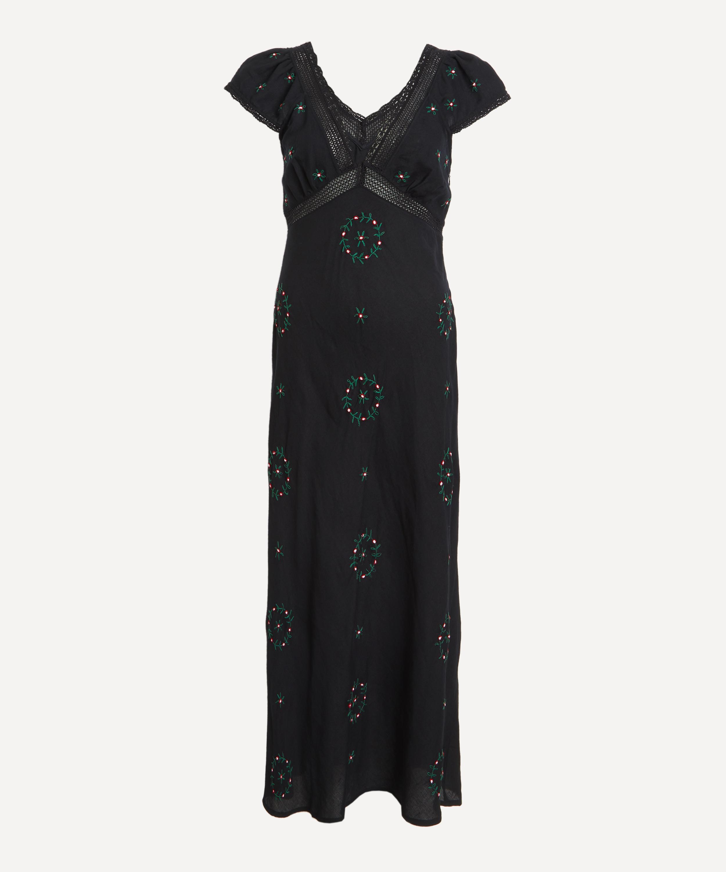 Crafted from a soft, breathable viscose-linen blend and detailed with delicate embroidered florals, this midi dress exudes effortless refinement. A classic V-neckline, empire waist, and signature bias cut create a flowing, graceful silhouette, while cap sleeves and fine lace trims lend a softly romantic finish.