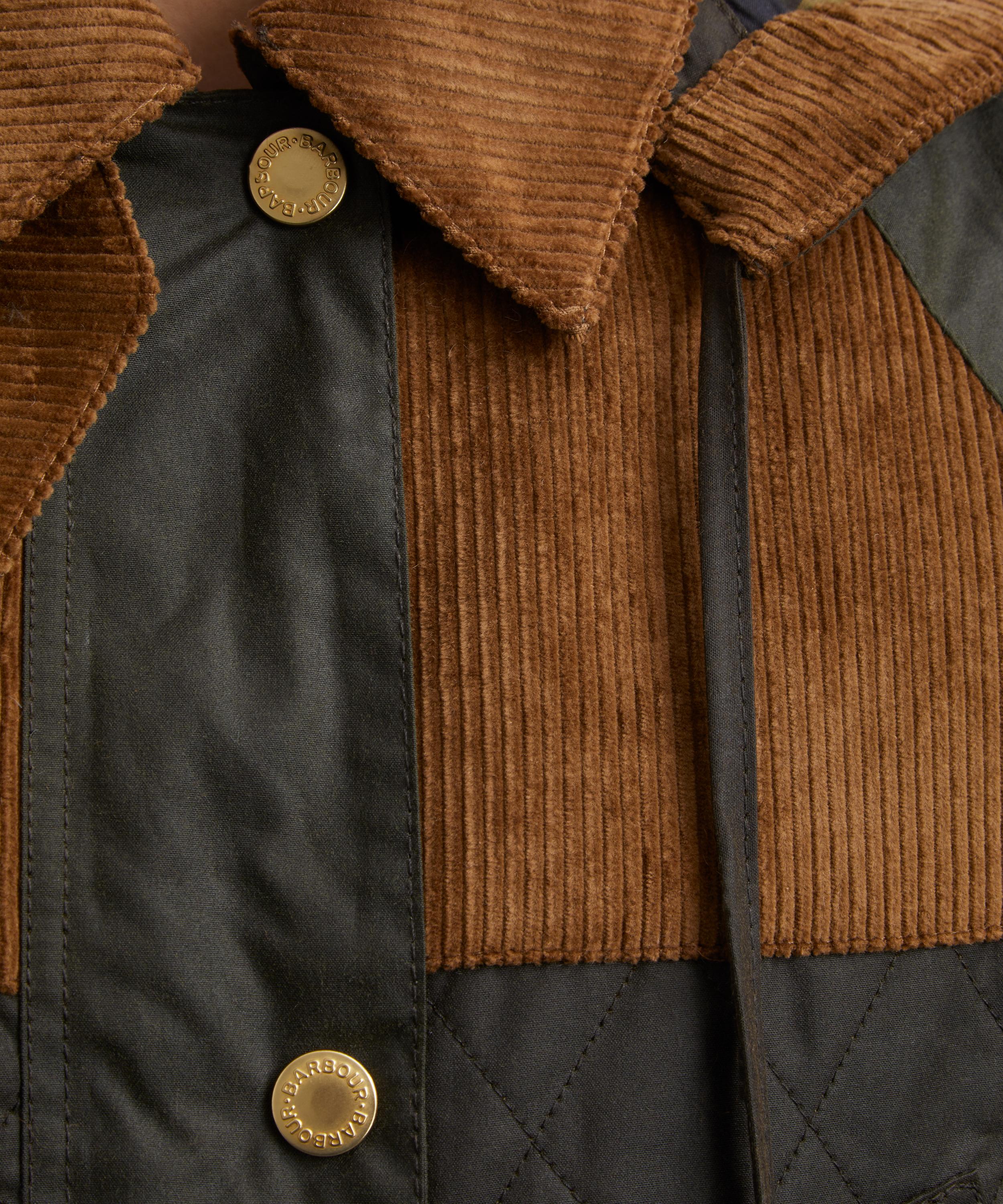 - Patchwork waxed cotton, diamond quilting, corduroy, and tartan construction