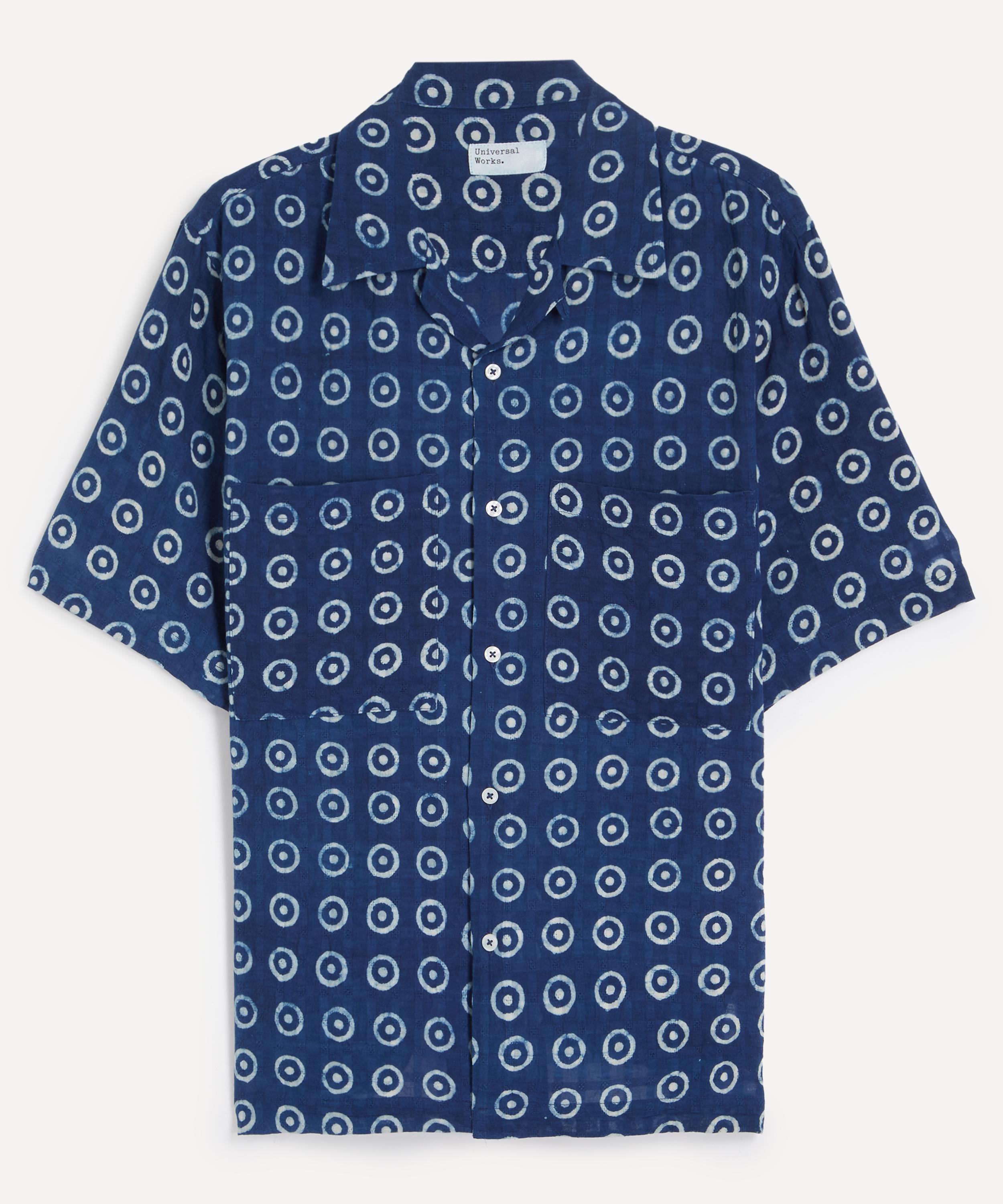 Crafted from a lightweight self‑check cotton woven in India and garment‑dyed indigo with a bold circle block print, this short‑sleeve shirt is cut for a wide fit and finished with a one‑piece collar, button placket, and dual chest patch pockets.