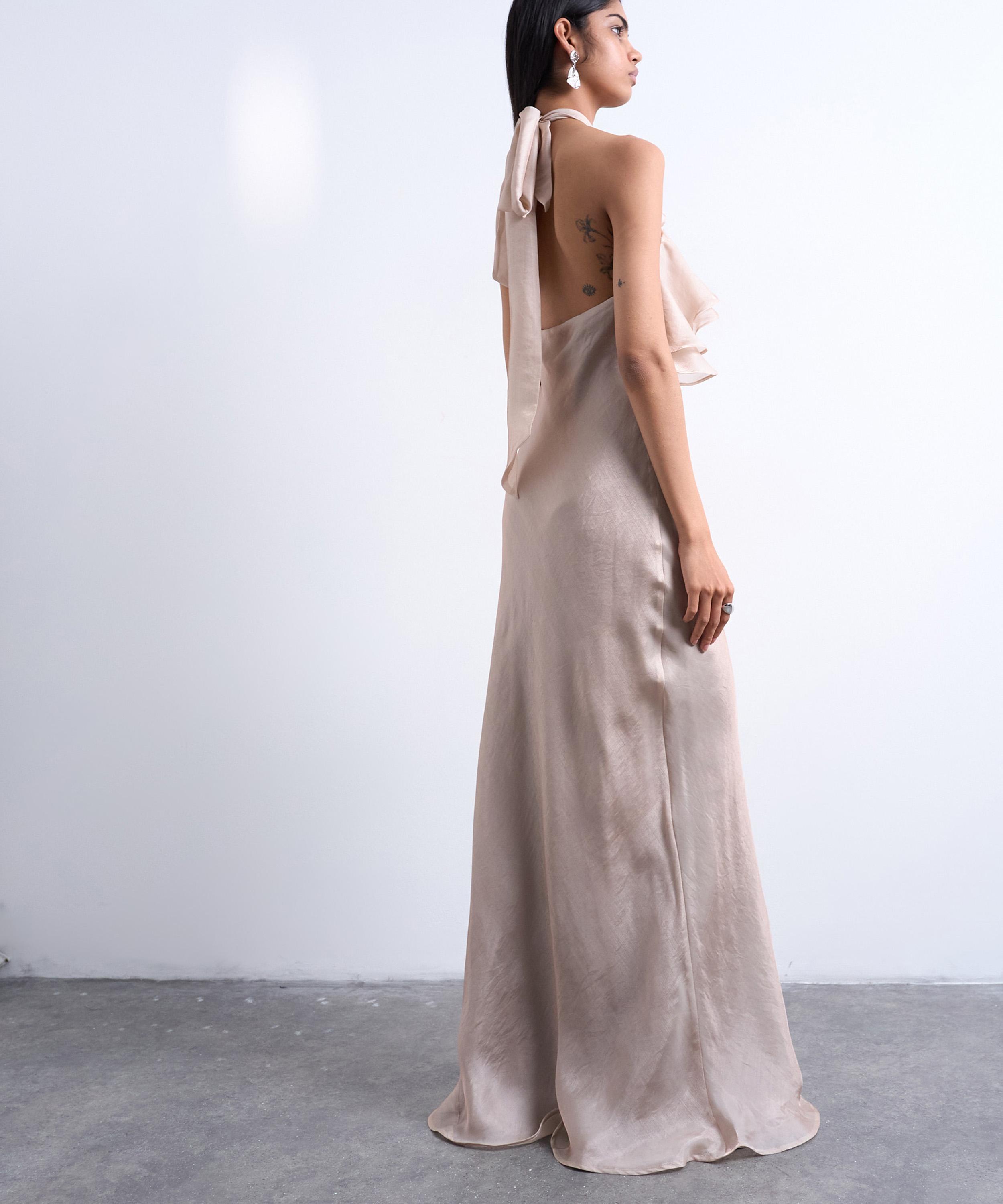 Crafted from iridescent taupe chiffon, this elegant gown embodies femininity. Cut on the bias to a floor-grazing hem, it features a whimsical frilled halter neckline and a delicate tie-back fastening for an effortlessly romantic finish.
