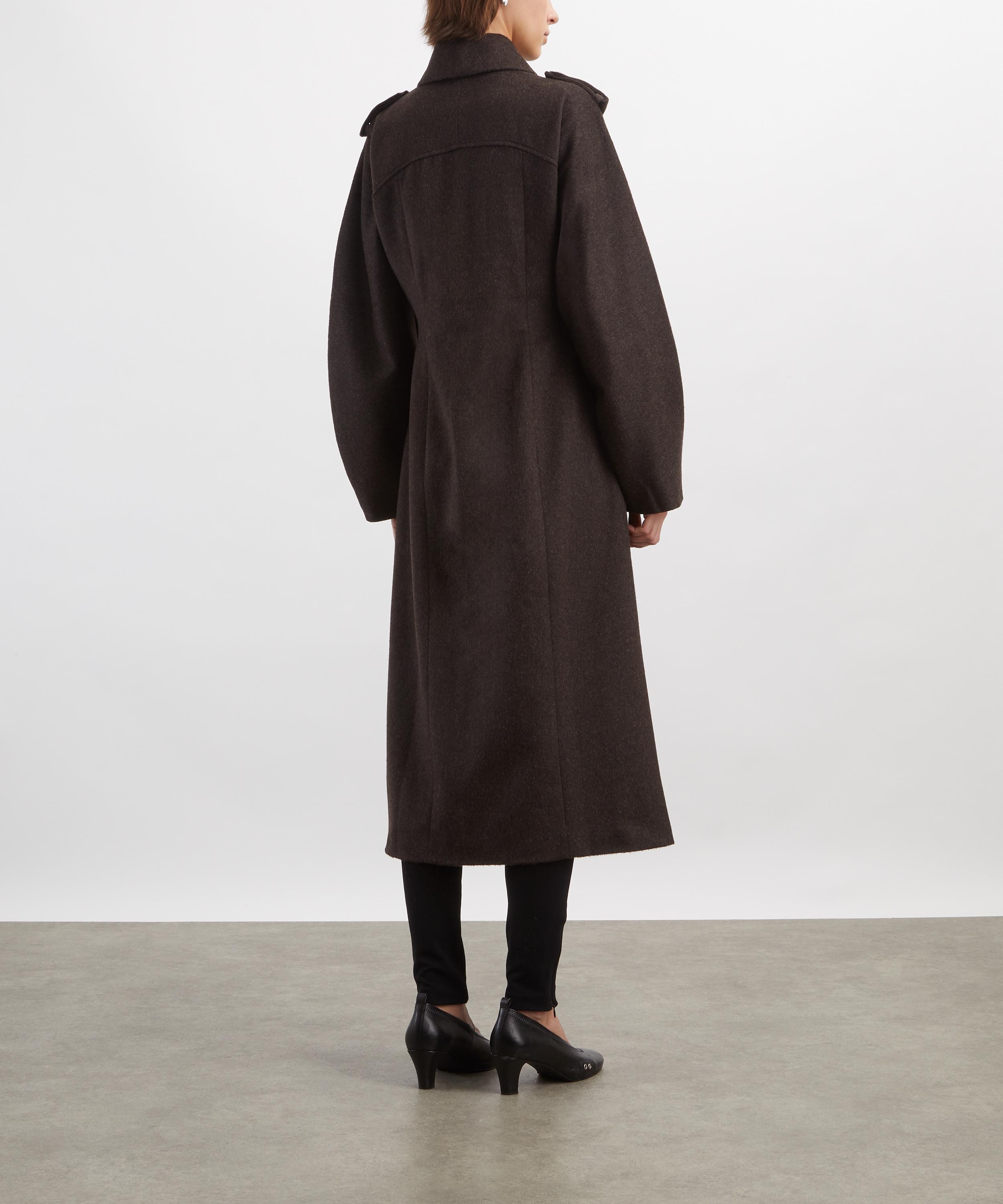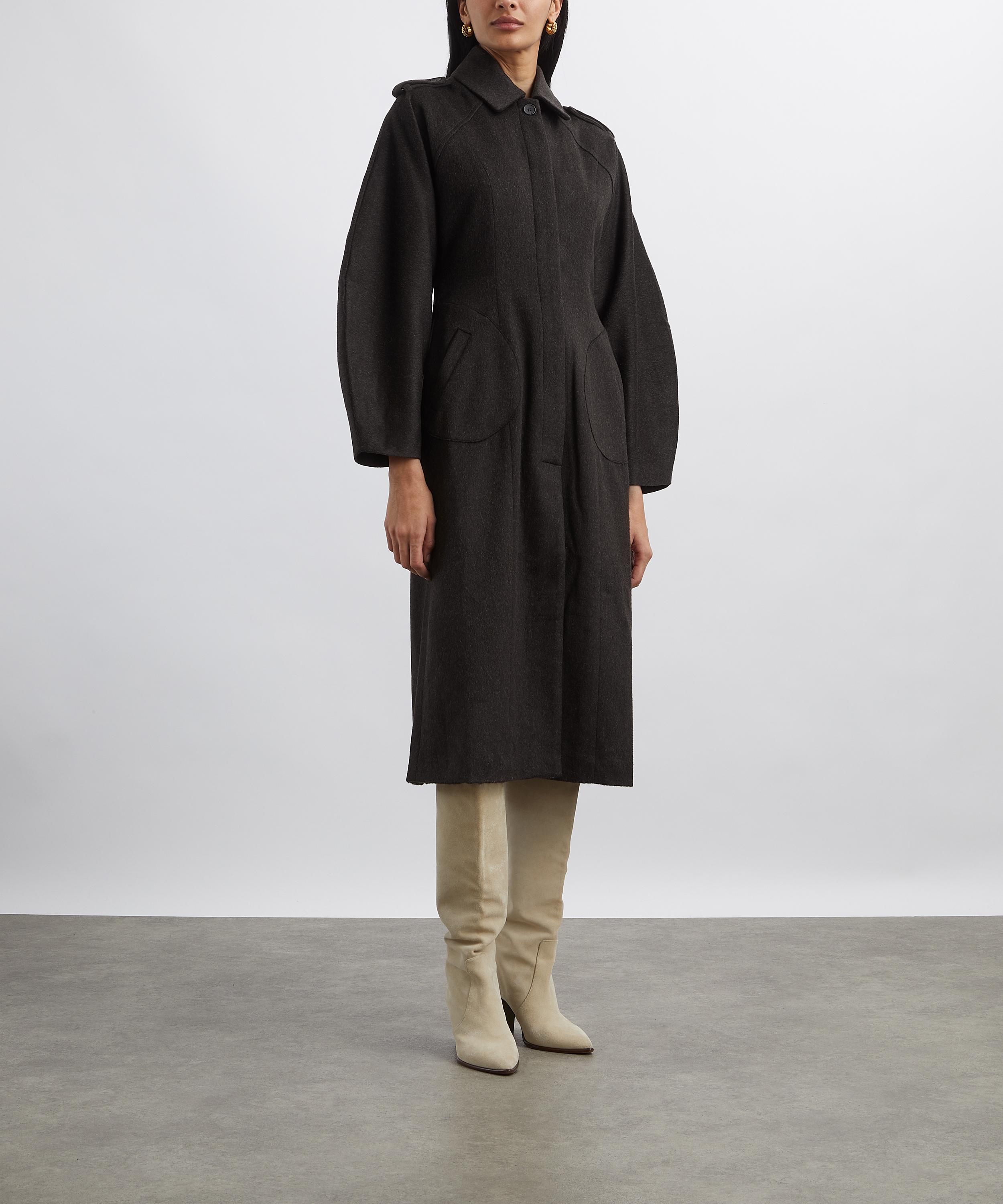Constructed from felted wool, this fitted coat is defined by structured shoulders and voluminous raglan sleeves, lending sculptural elegance to its streamlined silhouette. A concealed button placket, shoulder epaulettes, and circular pockets complete the design with a tailored finish.