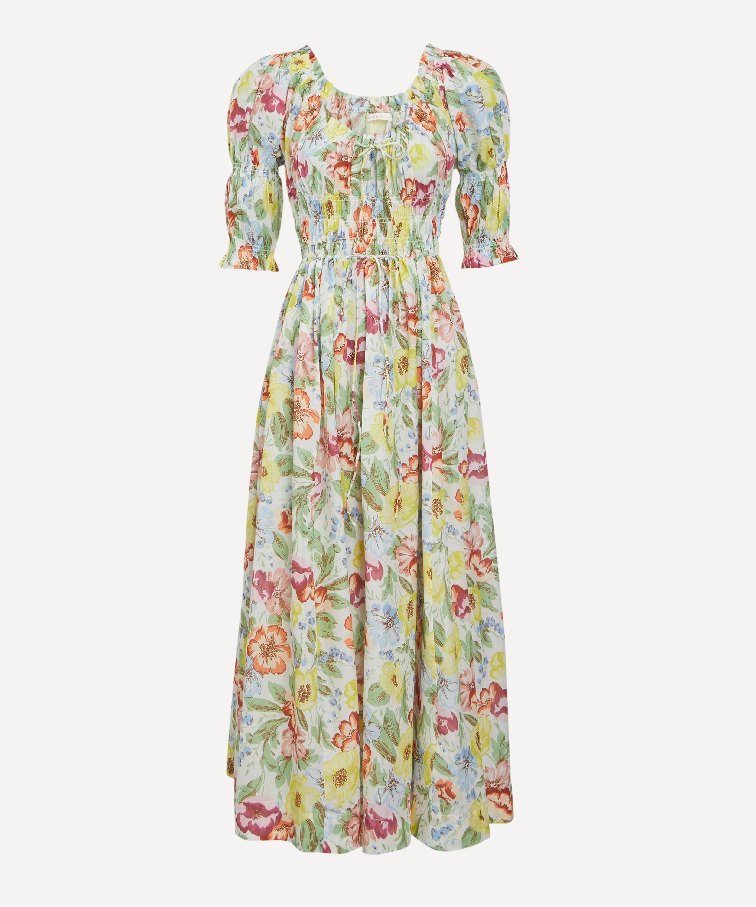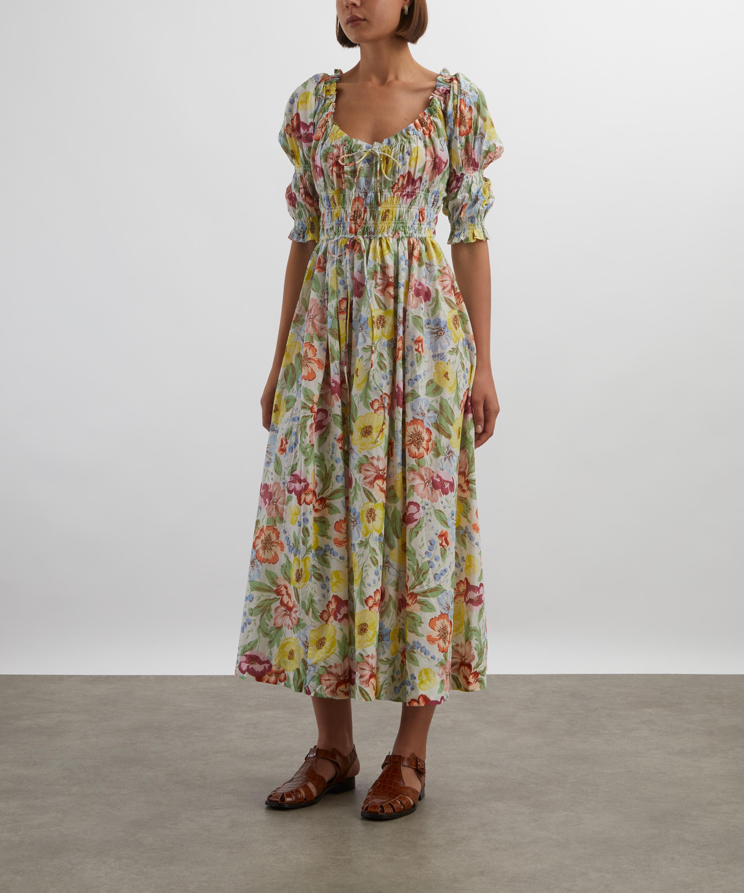 Crafted from soft, lightweight cotton voile adorned with a colourful floral print, the Ischia features a scoop neckline, double-puffed sleeves, and a smocked bodice that flows into a full, ankle-grazing skirt.