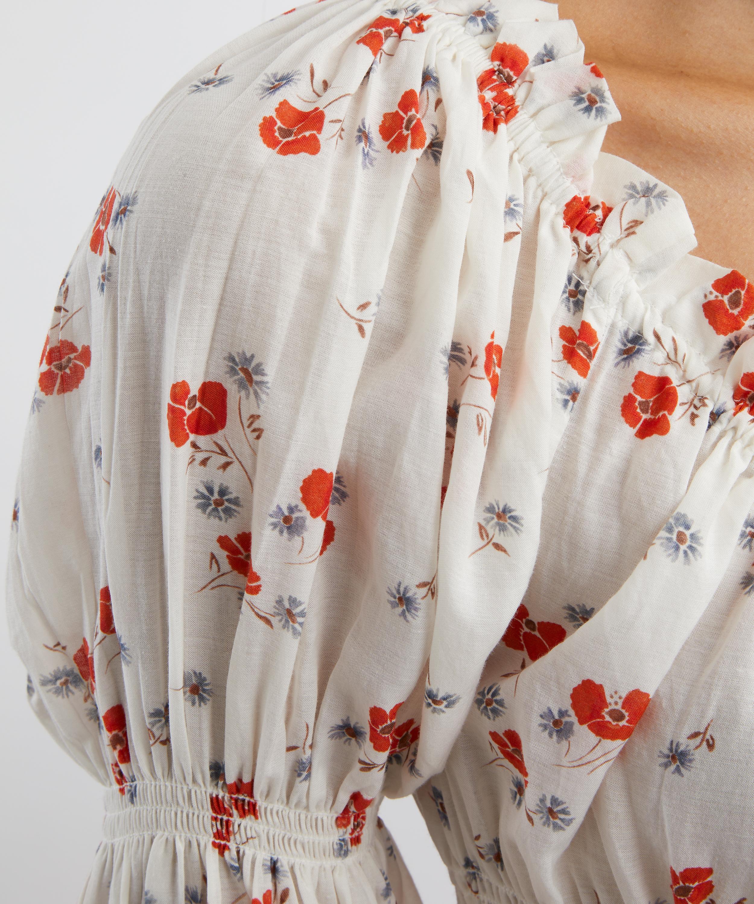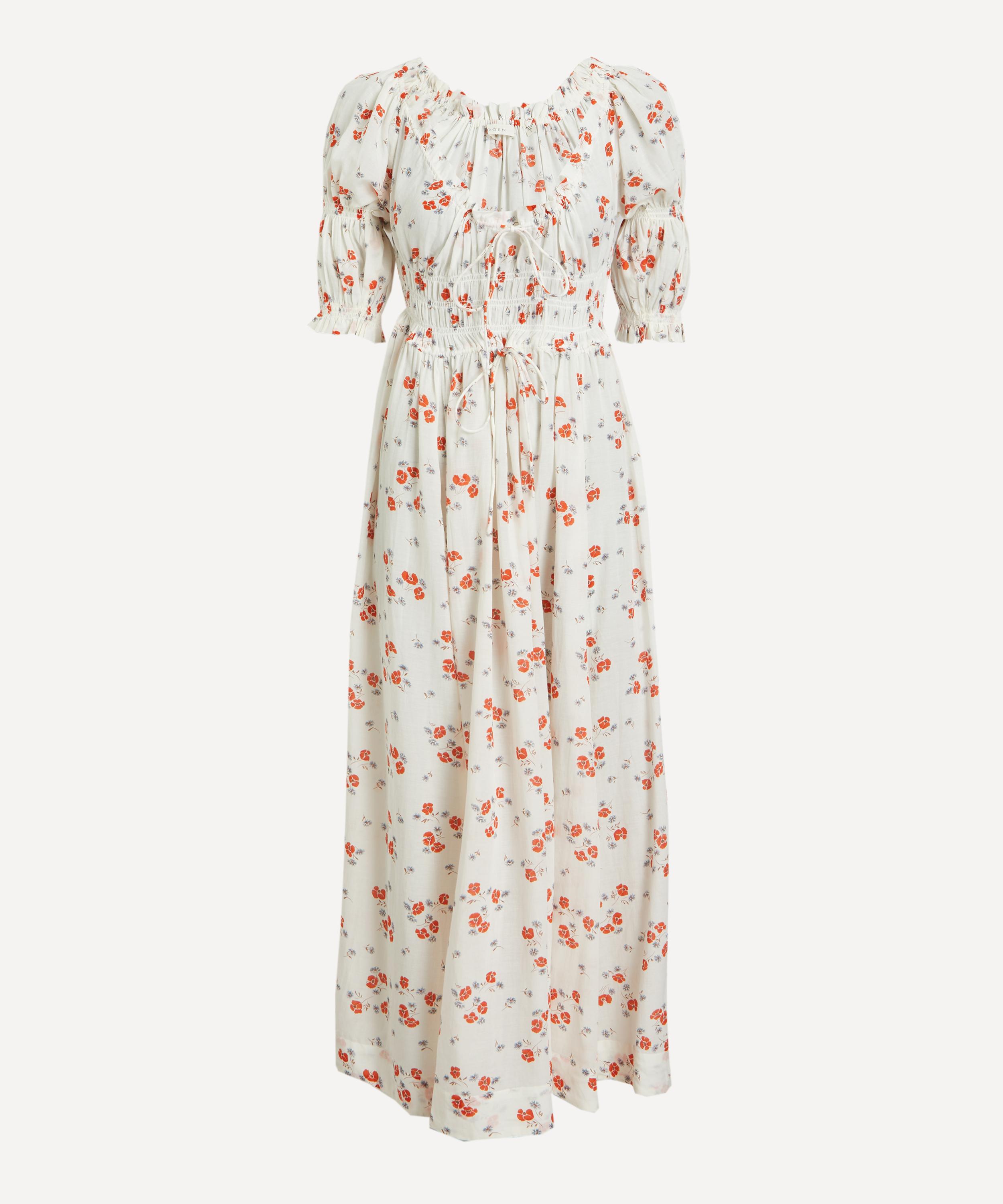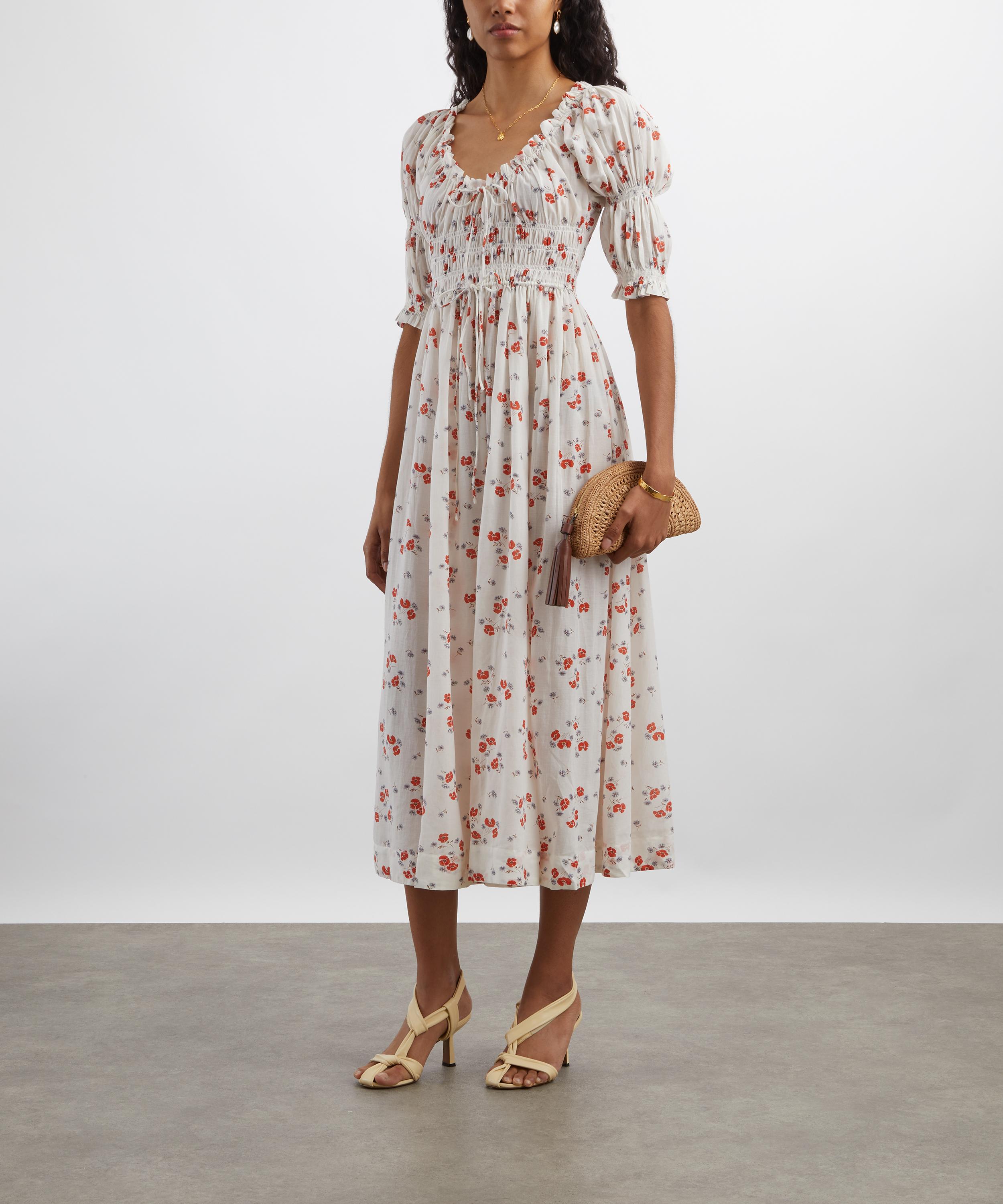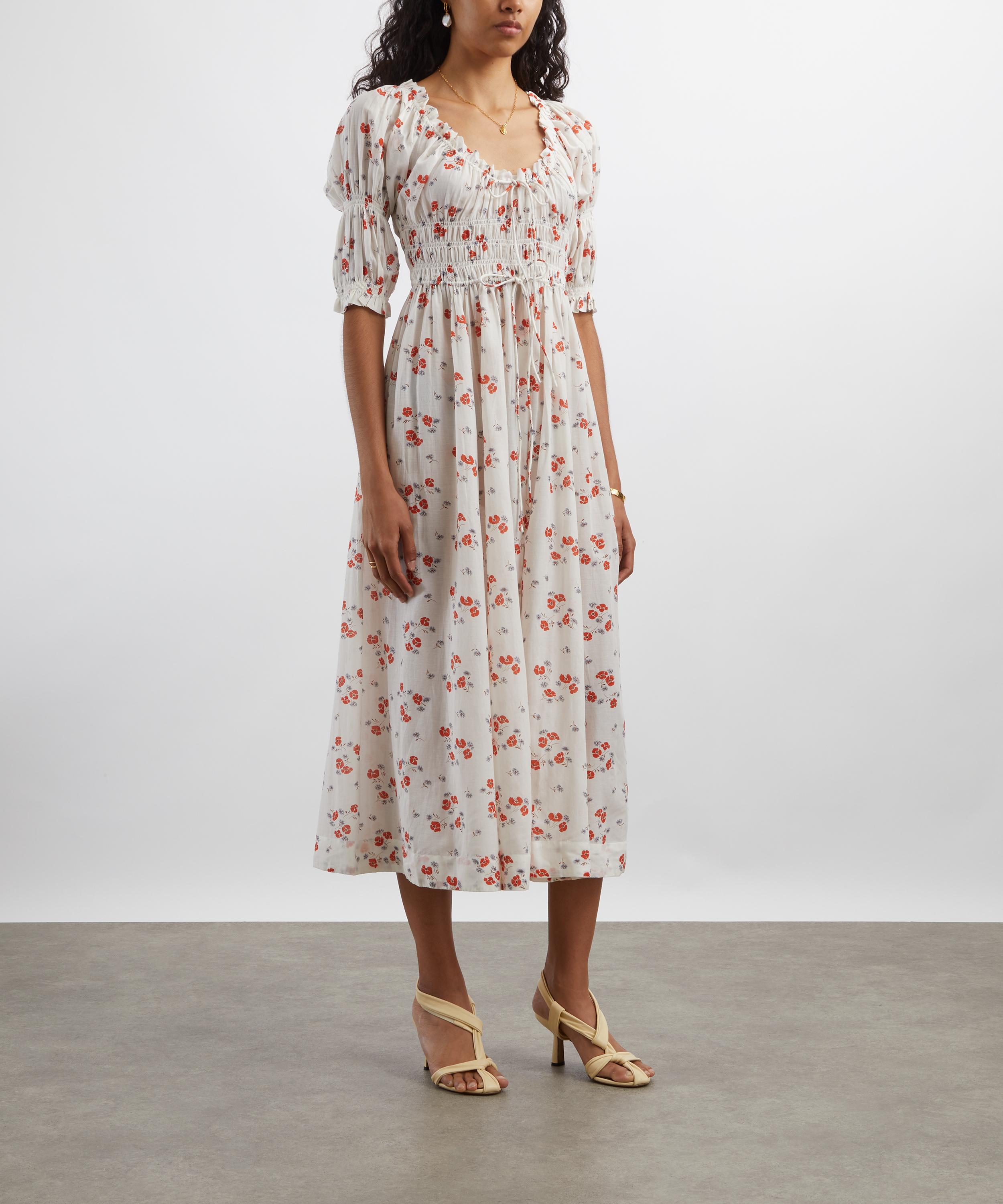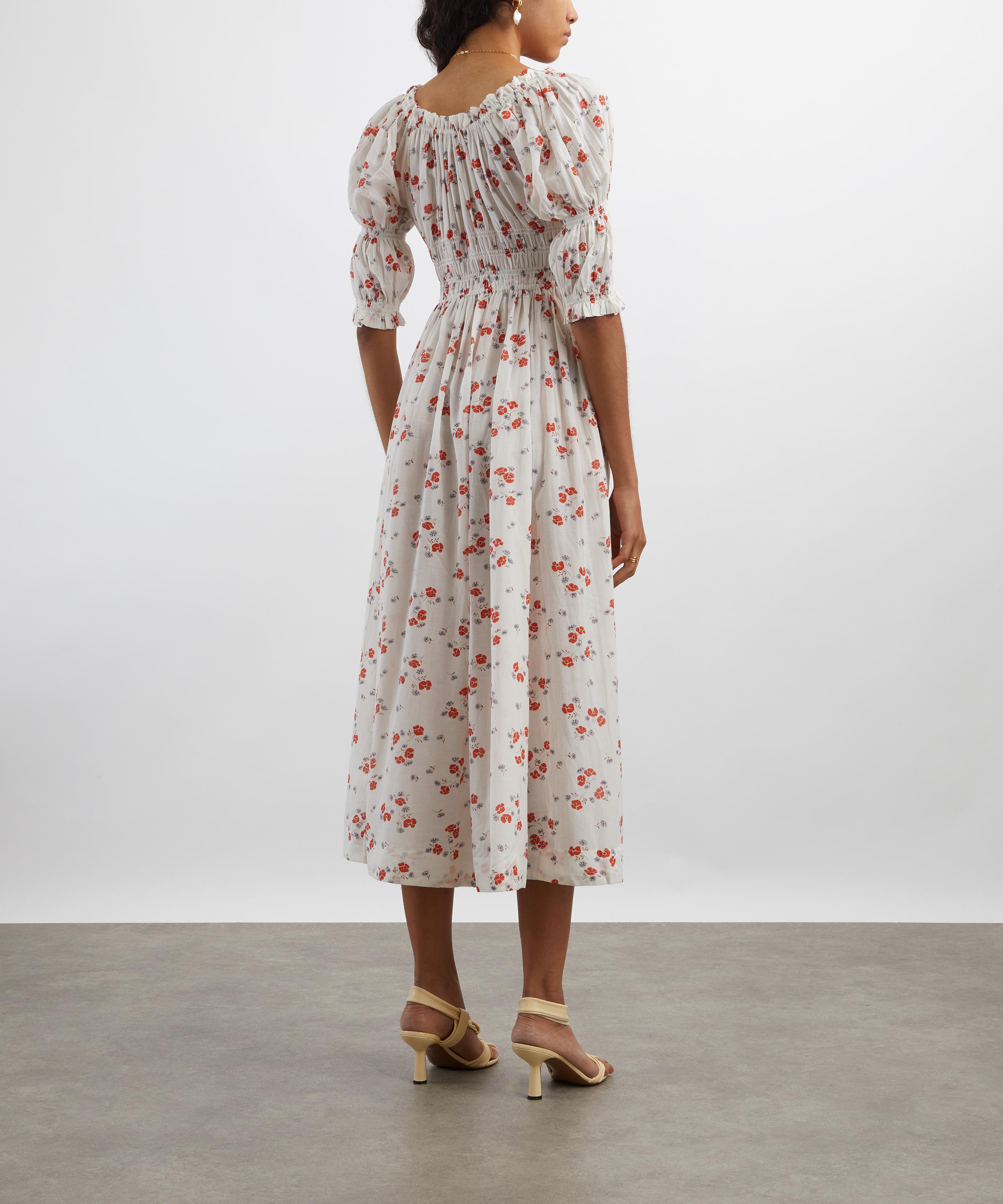 Crafted from soft, lightweight cotton voile adorned with a colourful poppy print, the Ischia features a scoop neckline, double-puffed sleeves, and a smocked bodice that flows into a full, ankle-grazing skirt.
