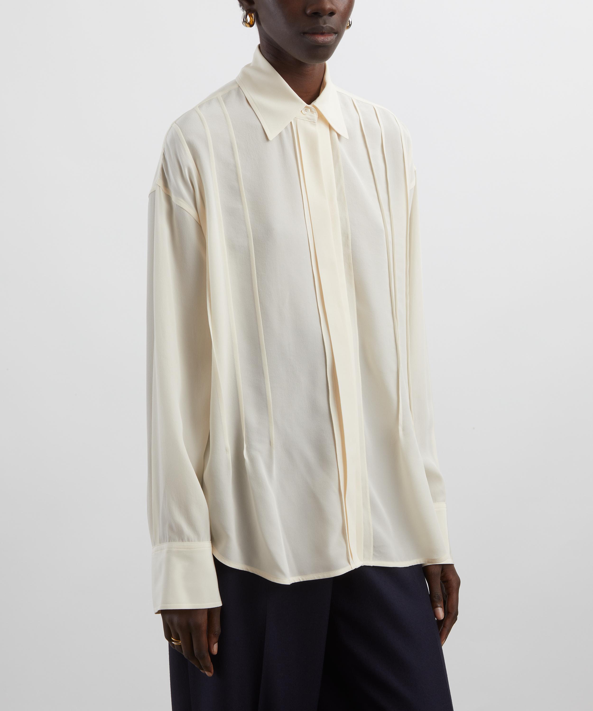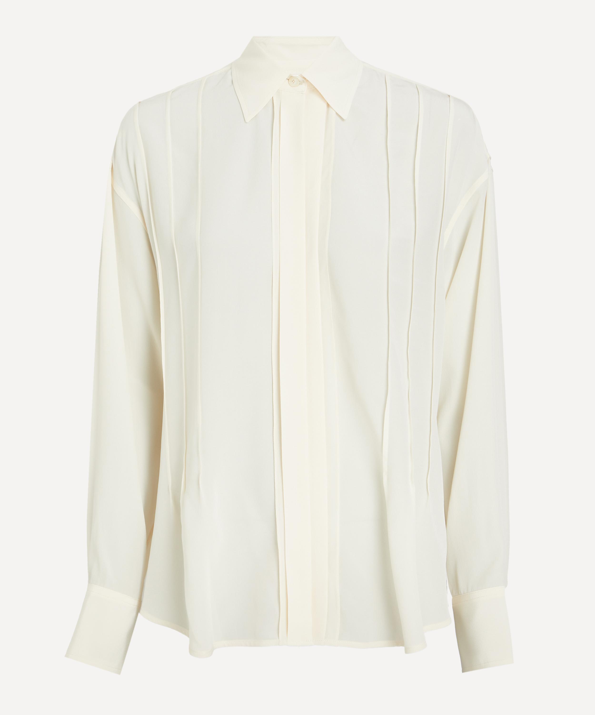 A timeless addition to any wardrobe, the Pintuck Pleated Blouse features a loosely tailored silhouette with dropped shoulders. Crafted from pure silk in versatile ivory, it’s detailed with delicate vertical pleats and a concealed button placket for a look that’s both minimal and sophisticated.