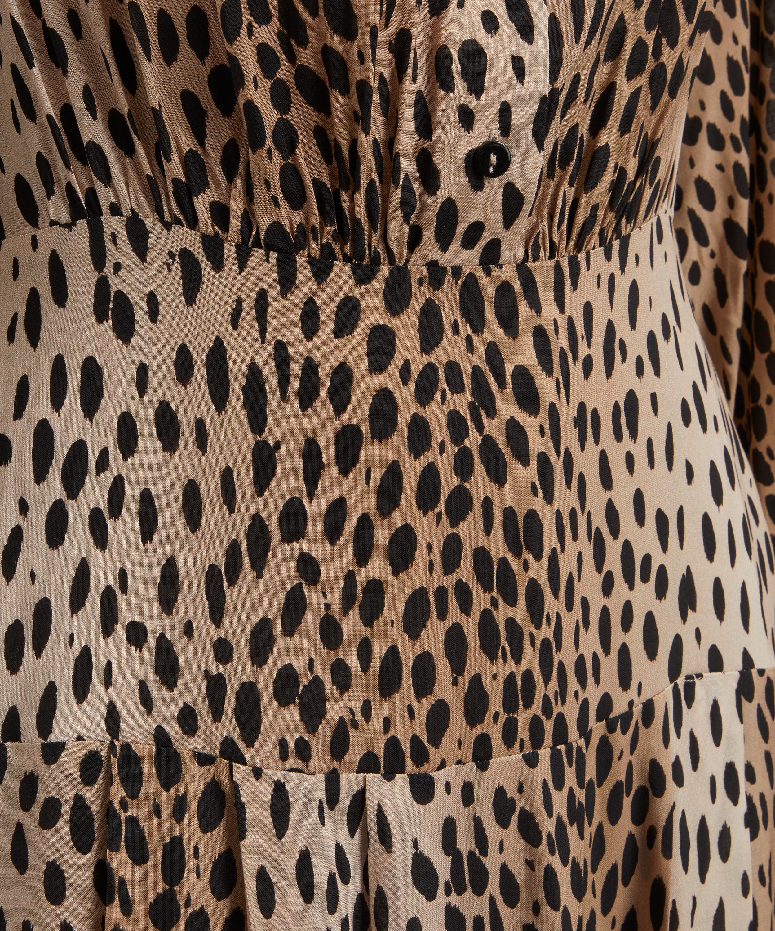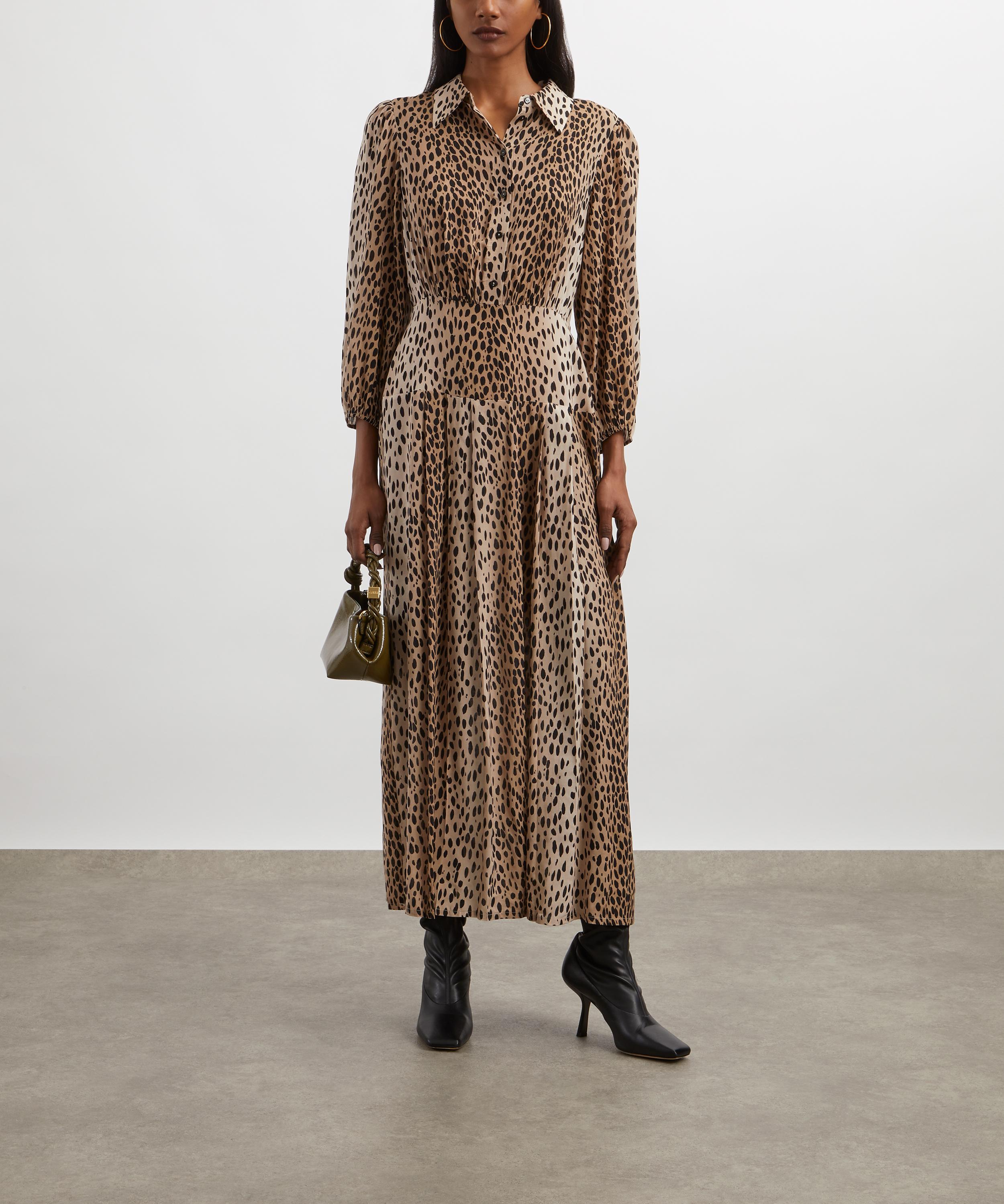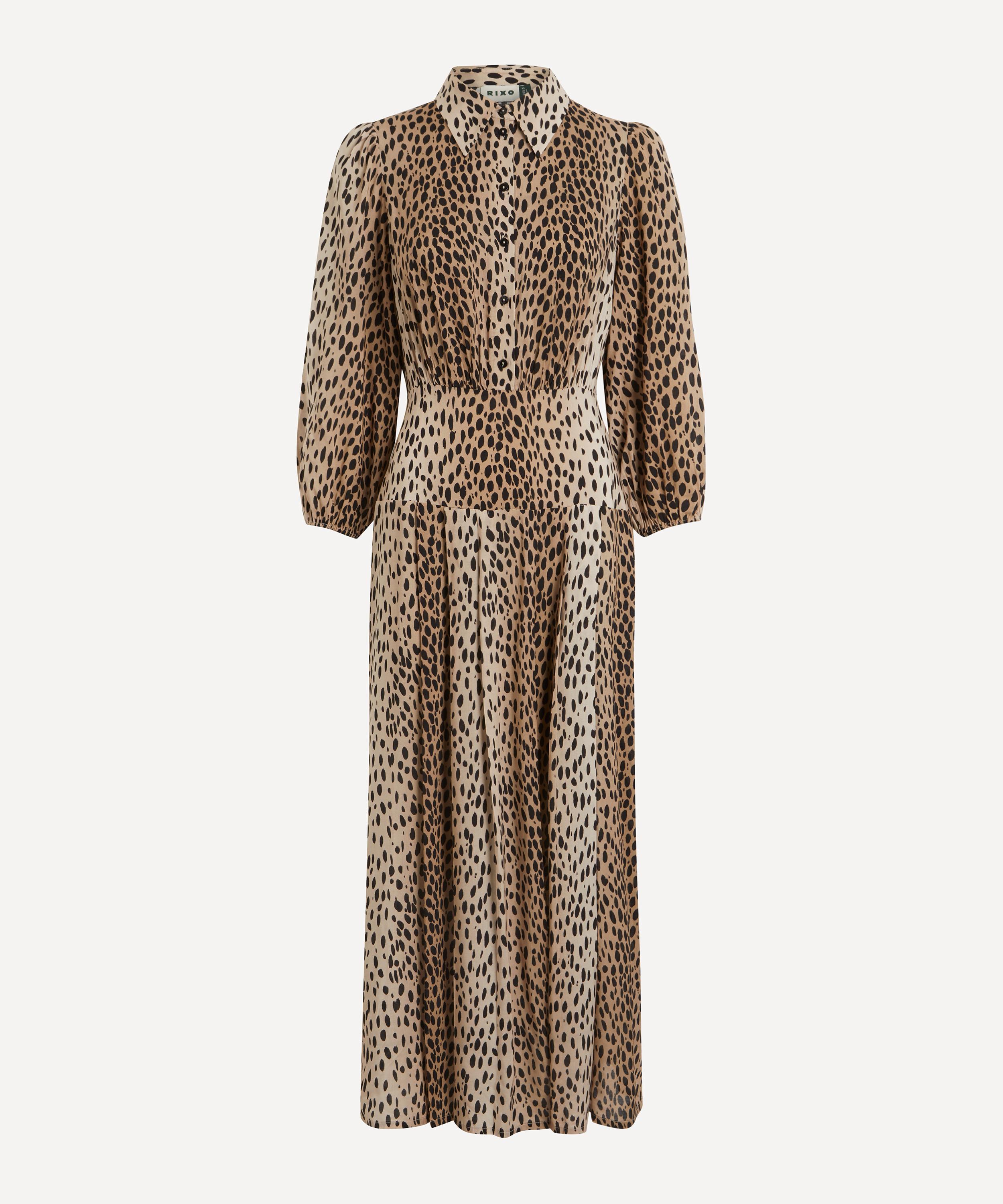 Every piece by RIXO is a bold statement rooted in timeless design. Crafted from a silky smooth viscose-crepe in a antelope spot print, the Izzy dress is elegantly shaped to a flattering straight fit with pleated detailing below the waist for a bit of volume. A classic button-down design with long sleeves and elasticated cuffs, it has a fitted waist and a crew neck collar that looks great buttoned up or left open. Simply pair it with simple heels for an eclectic evening edit, or team it with trainers for work and everyday wear.