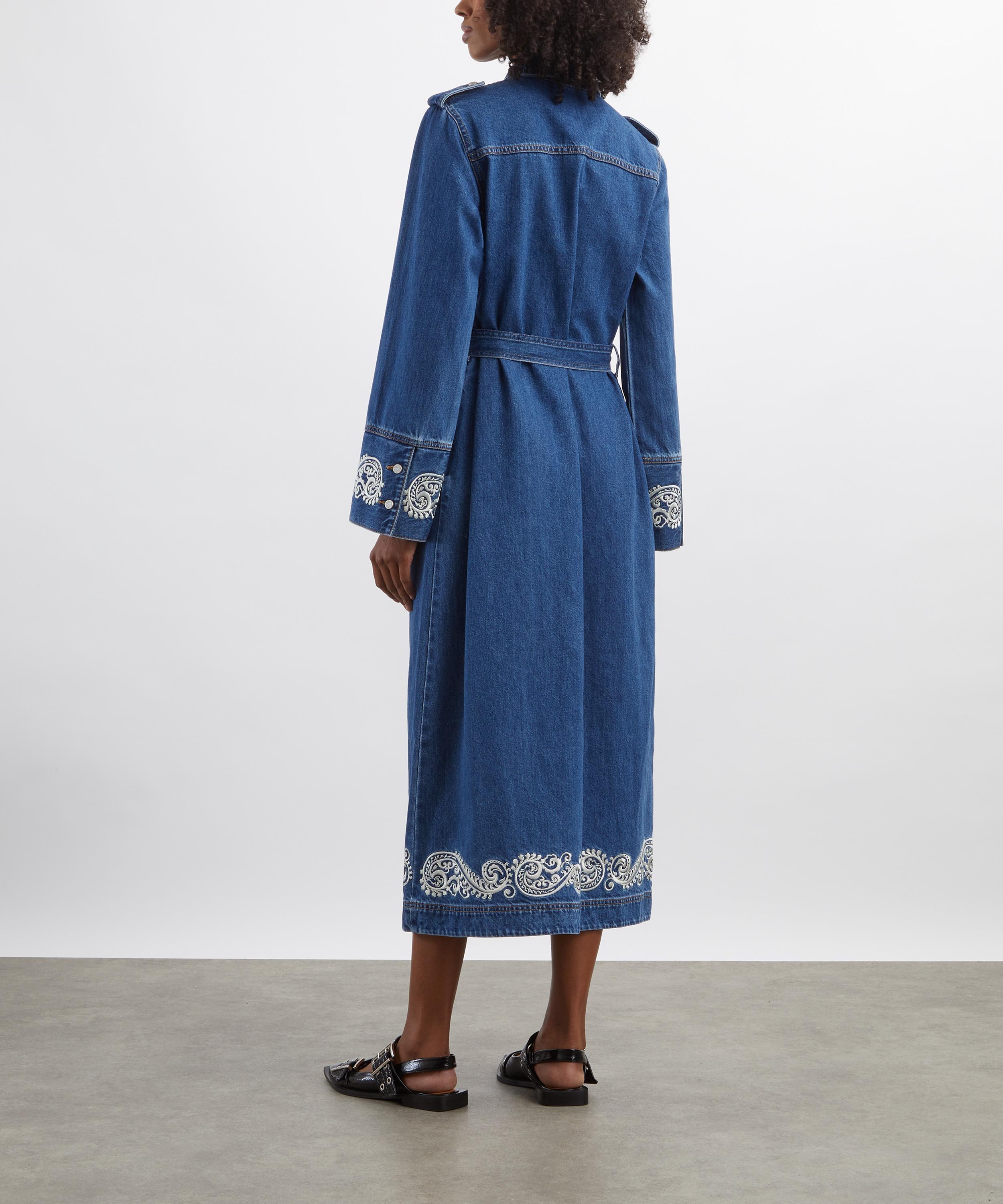Cut from soft, high-quality denim and rich in detail, this shirt dress is adorned with delicate floral embroidery, a belted waist and a midi hem. Ideal for garden parties, it also pairs effortlessly with tights and winter boots as the seasons change.