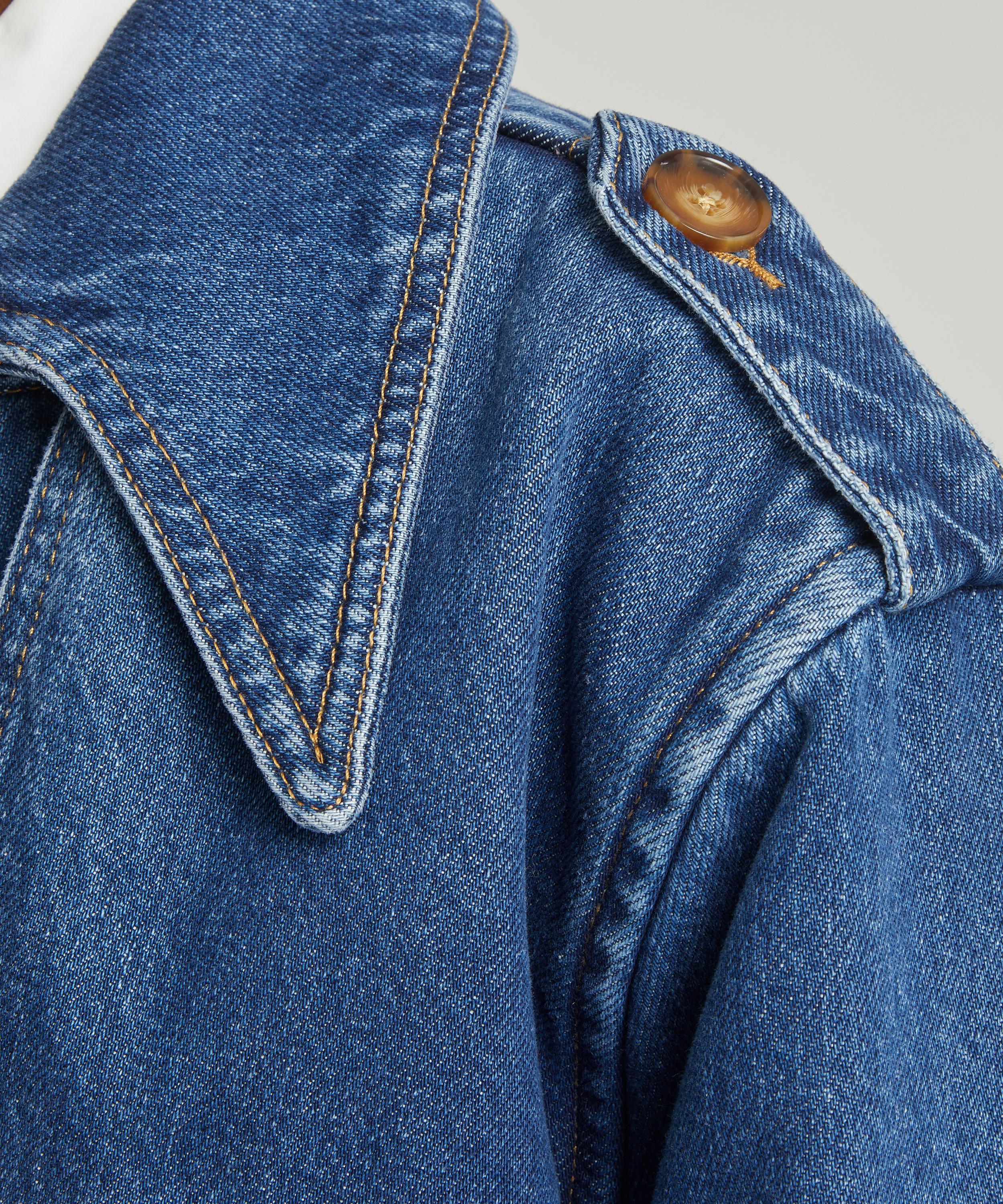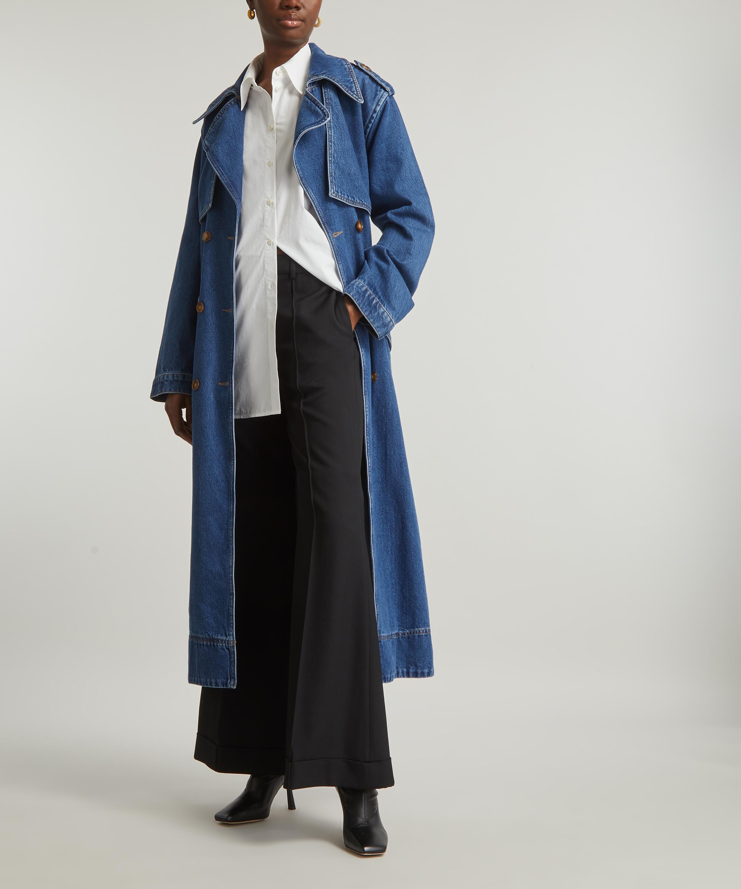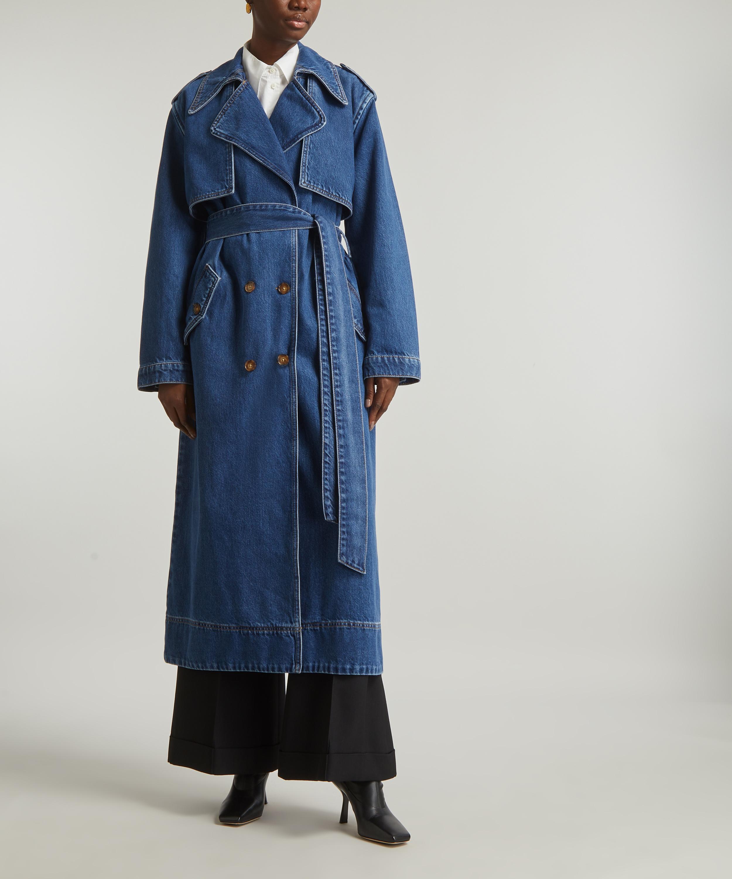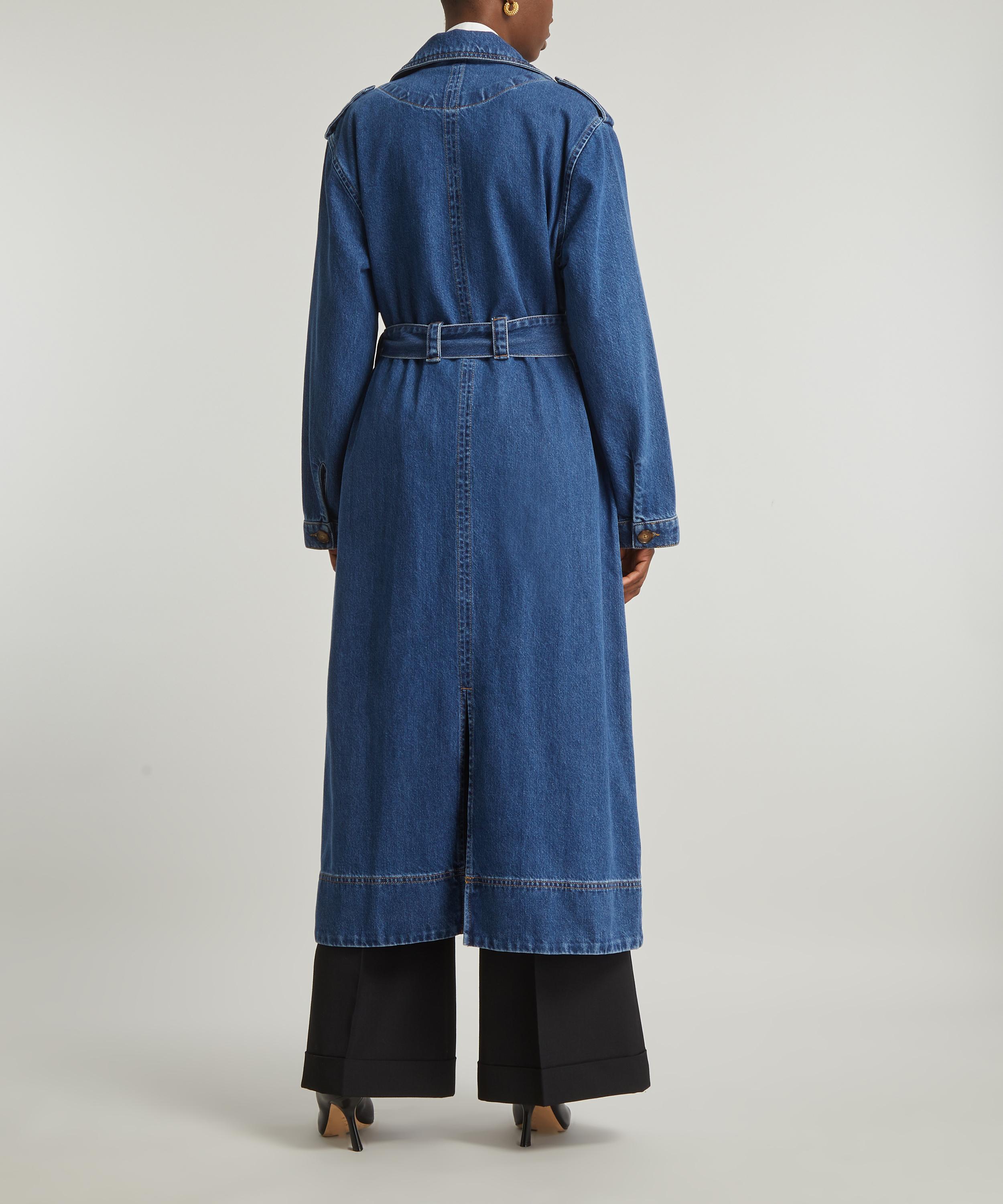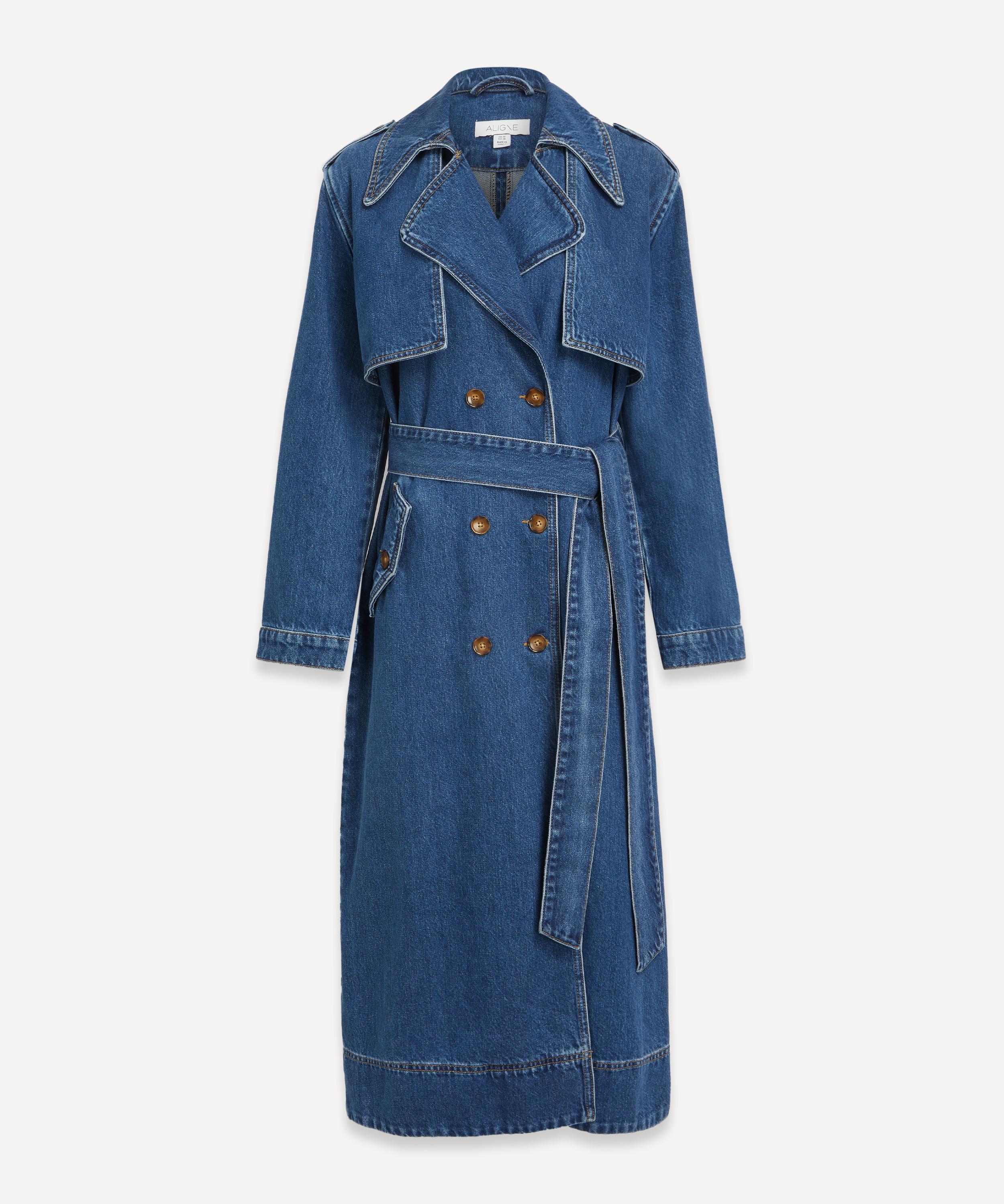 A modern take on the classic trench coat, the Julia is a versatile staple that you will wear for seasons to come. Boasting a long and elongating silhouette, this double-breasted coat is crafted from mid-blue cotton denim and fitted at the waist with a detachable belt. A relaxed fit featuring draped shoulders with epaulettes, it has a storm flap, lapel collar and horn buttons embellished across its buttoned closure for a tailored finish.