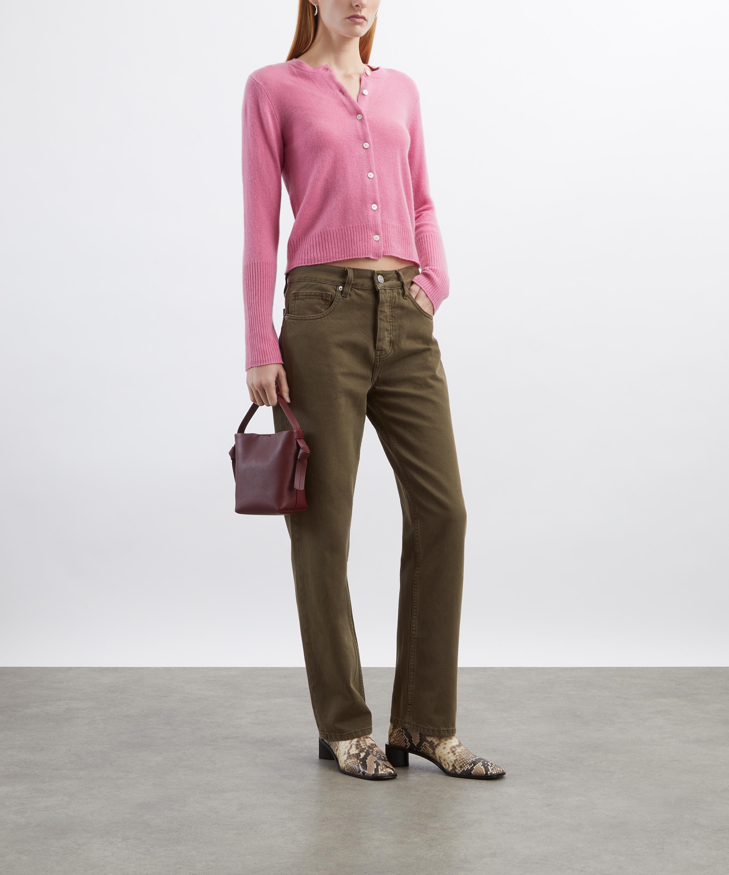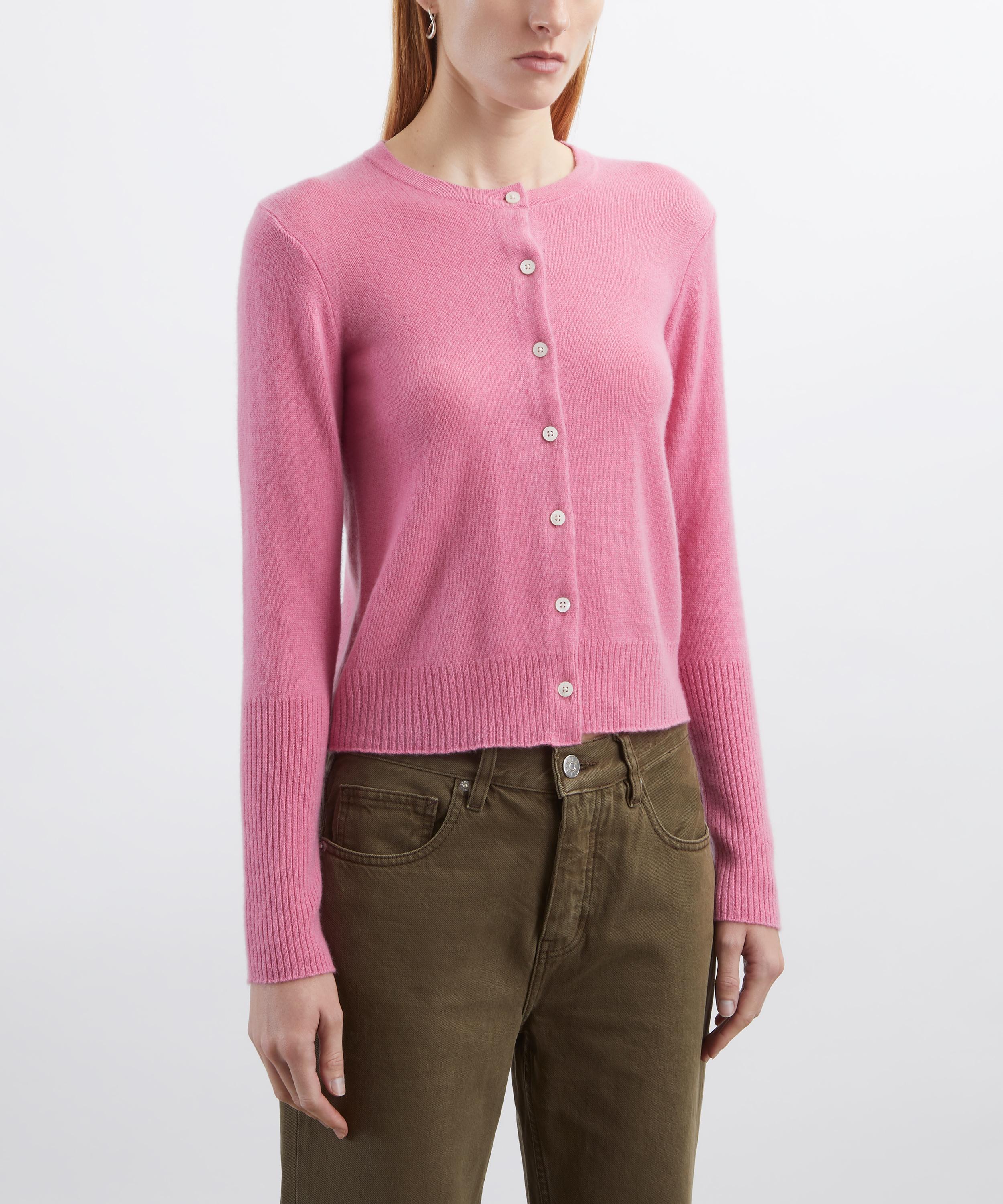 Crafted from pure cashmere, this pink cardigan features a tubular neckline, front button fastening, and ribbed hem and cuffs for a timeless finish.