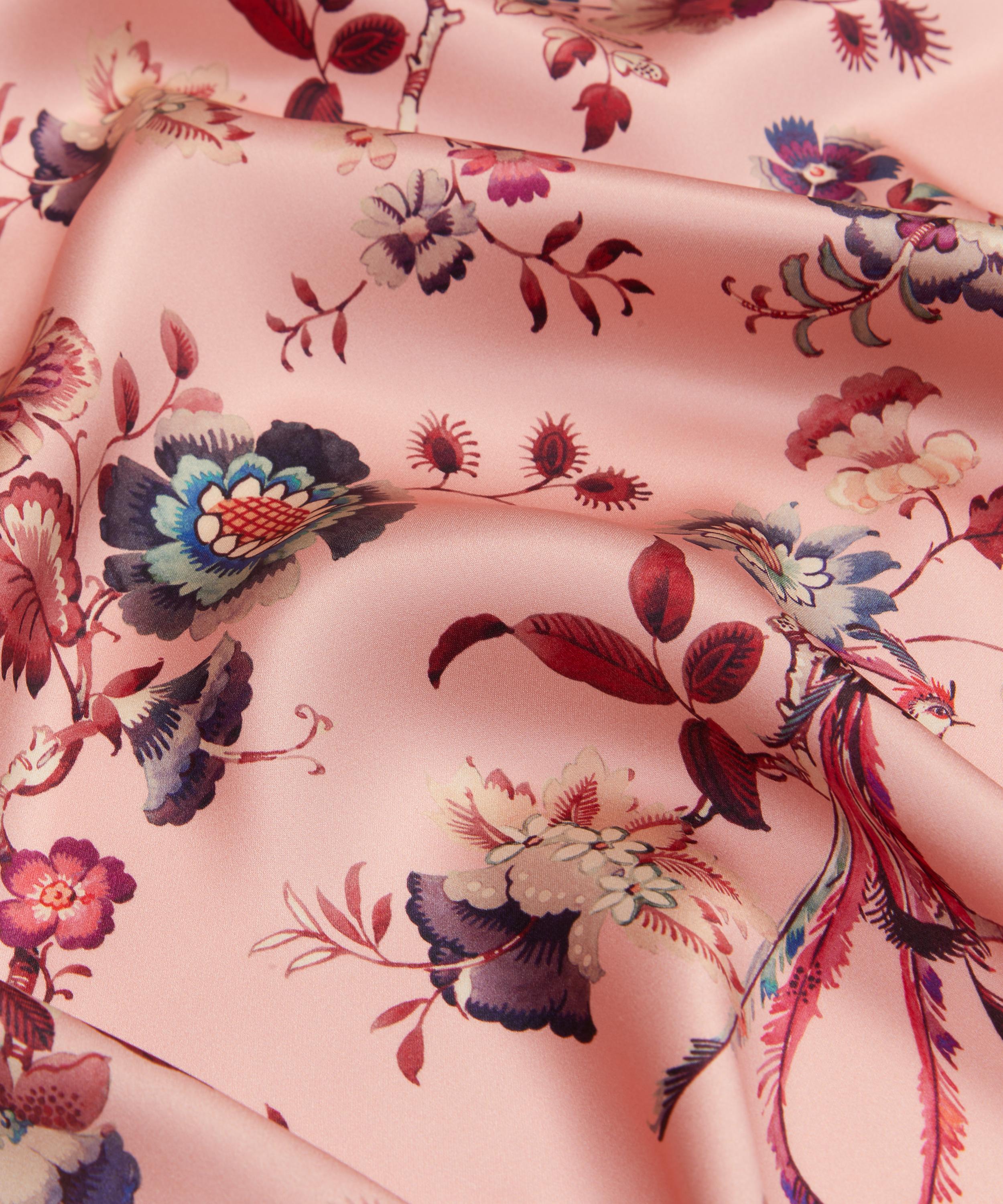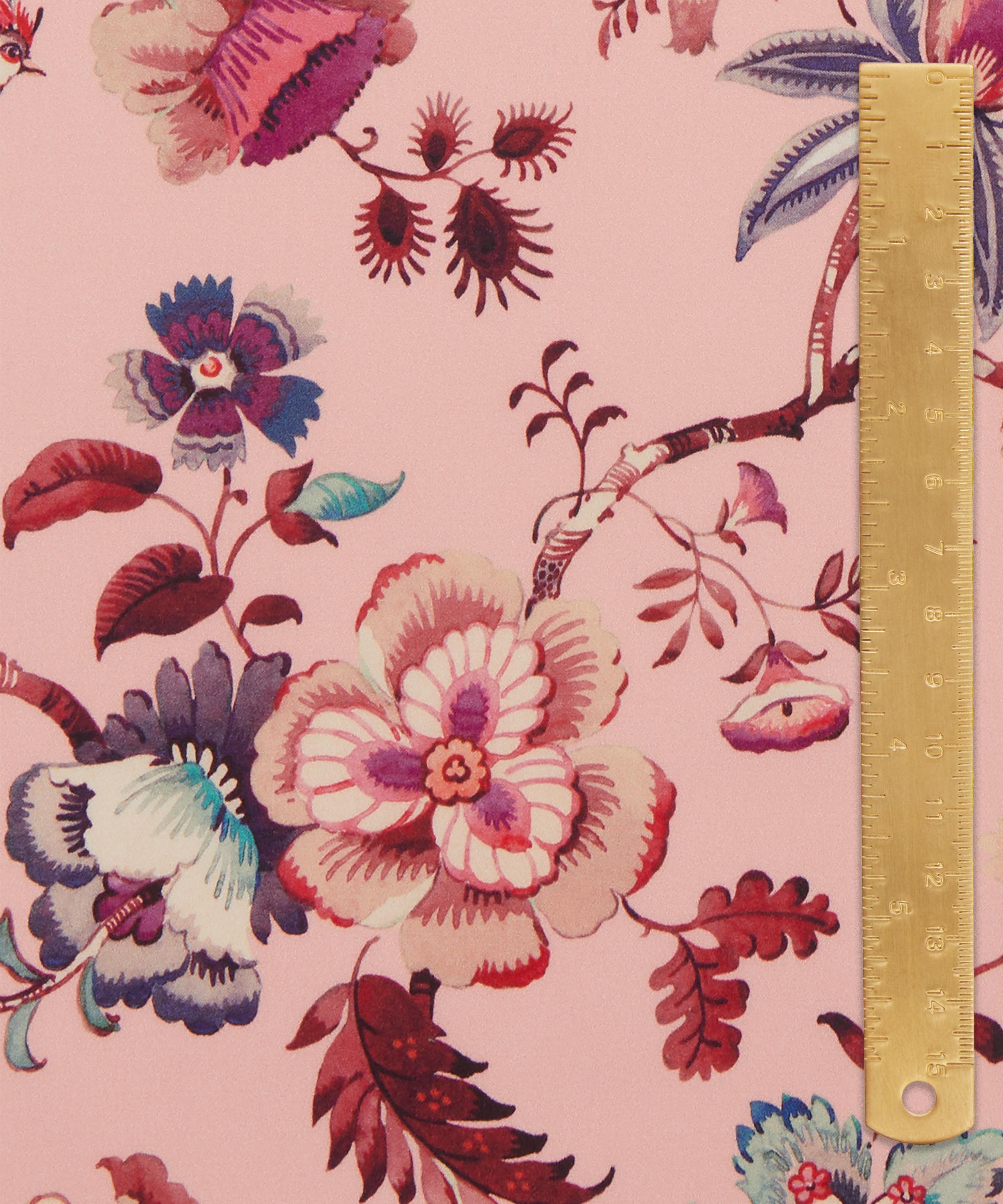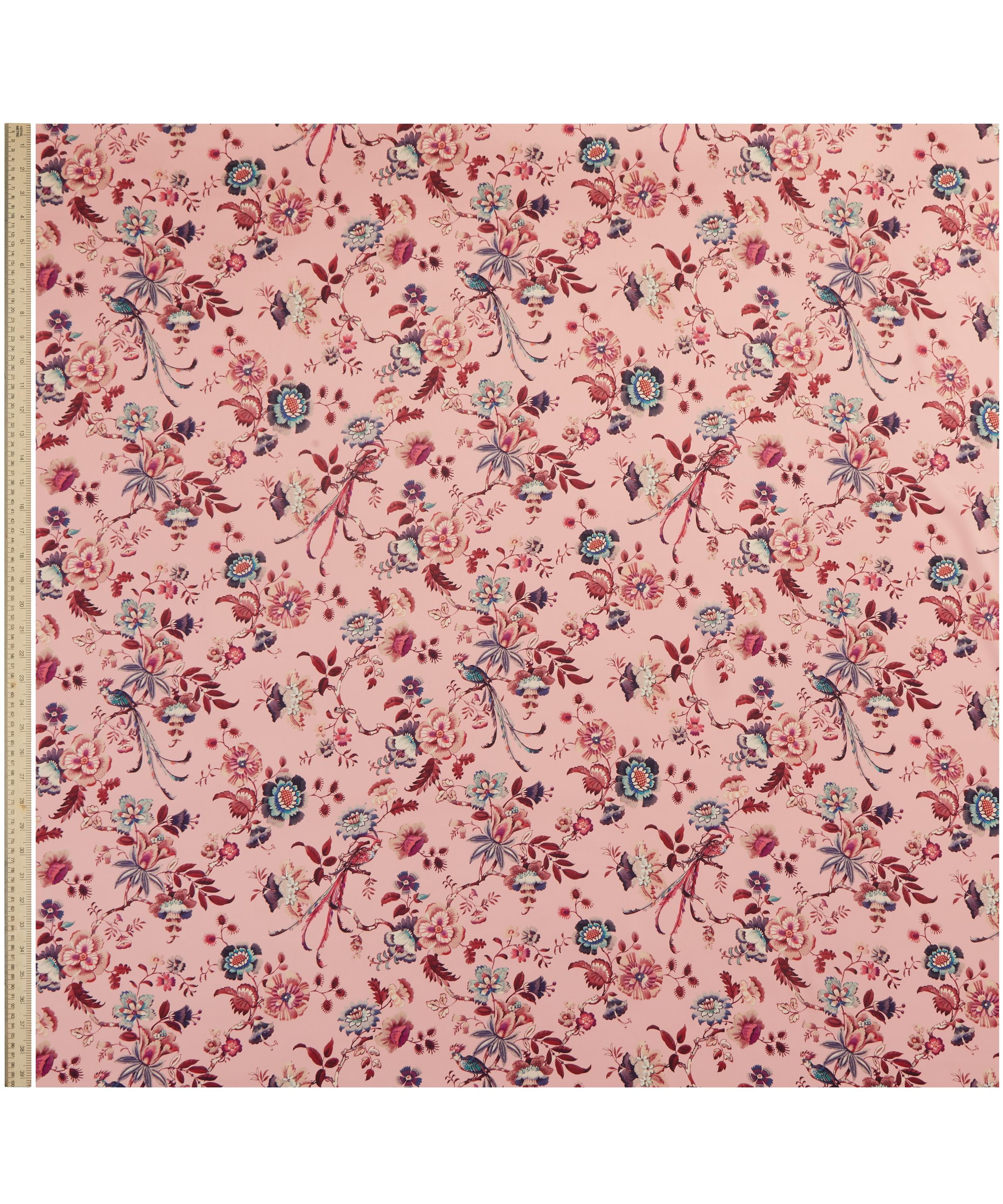 Jannah is an intricate floral conversational design – based on an undated artwork from the Liberty archive, it features an array of Asian-inspired blooms and striking exotic birds, perched among decadently trailing branches.