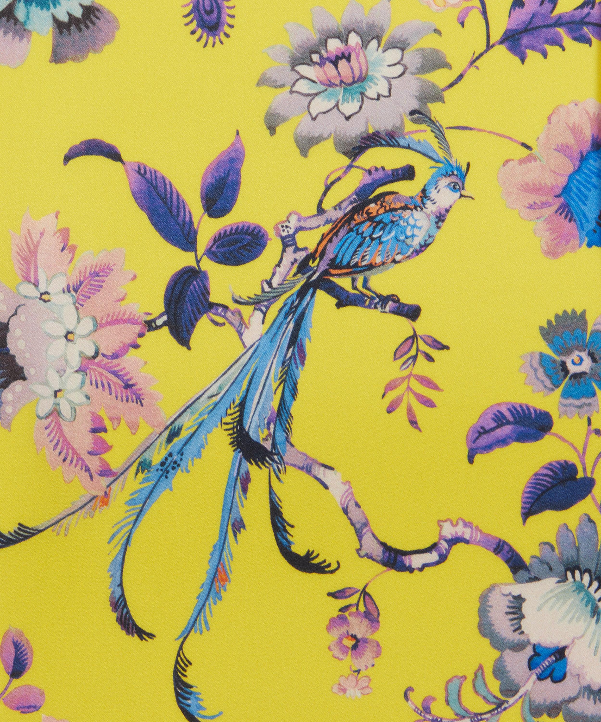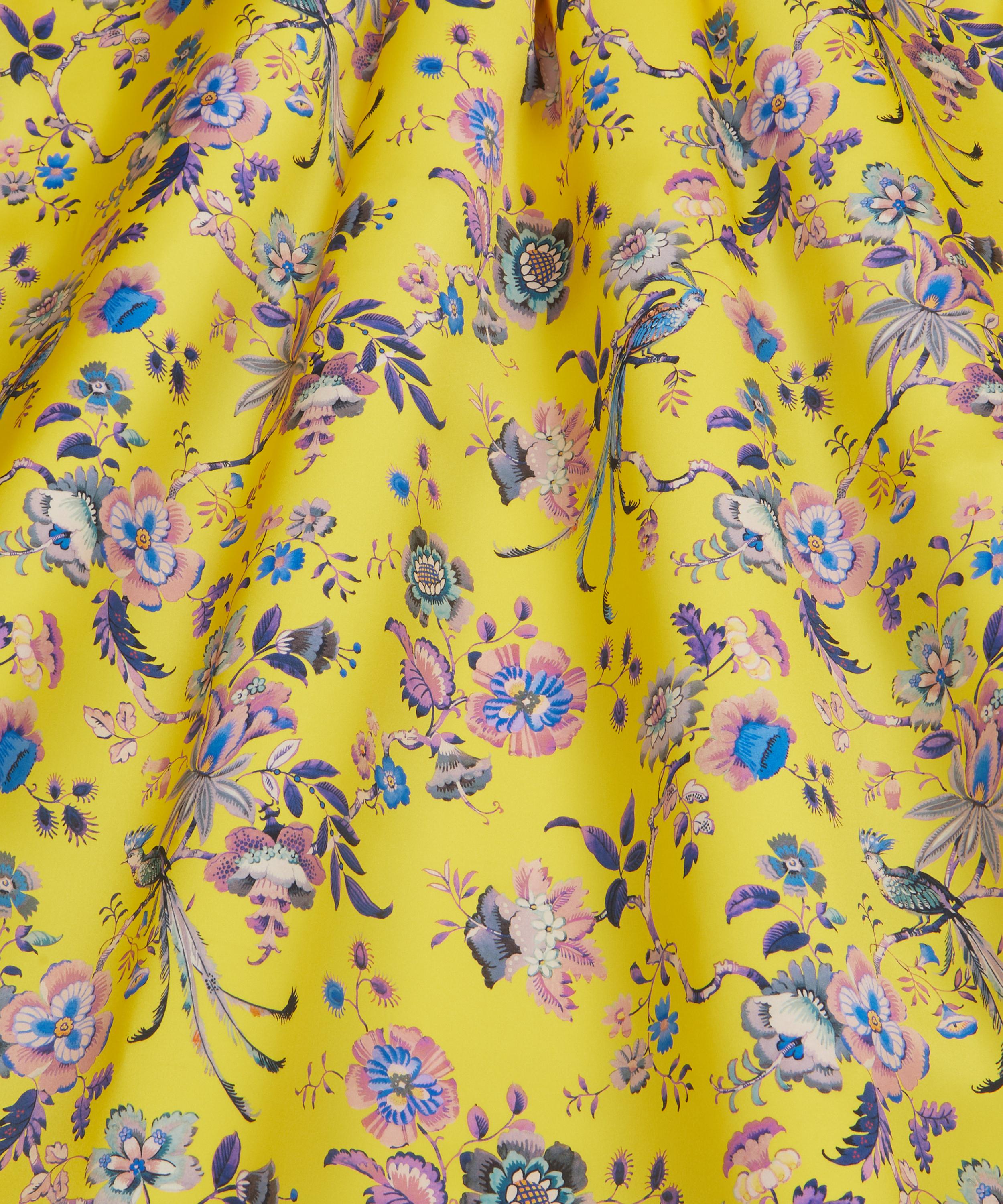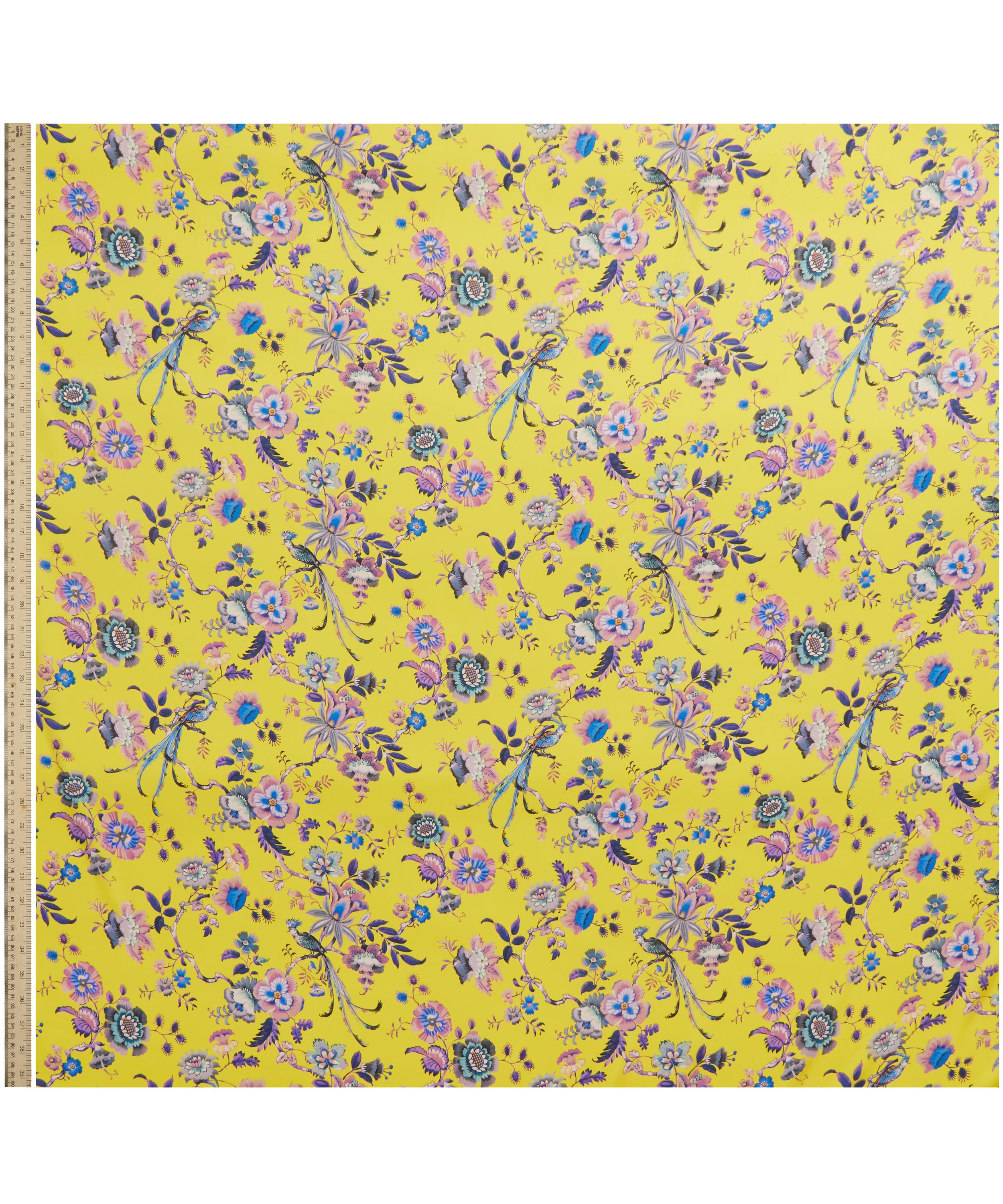 Jannah is an intricate floral conversational design – based on an undated artwork from the Liberty archive, it features an array of Asian-inspired blooms and striking exotic birds, perched among decadently trailing branches.