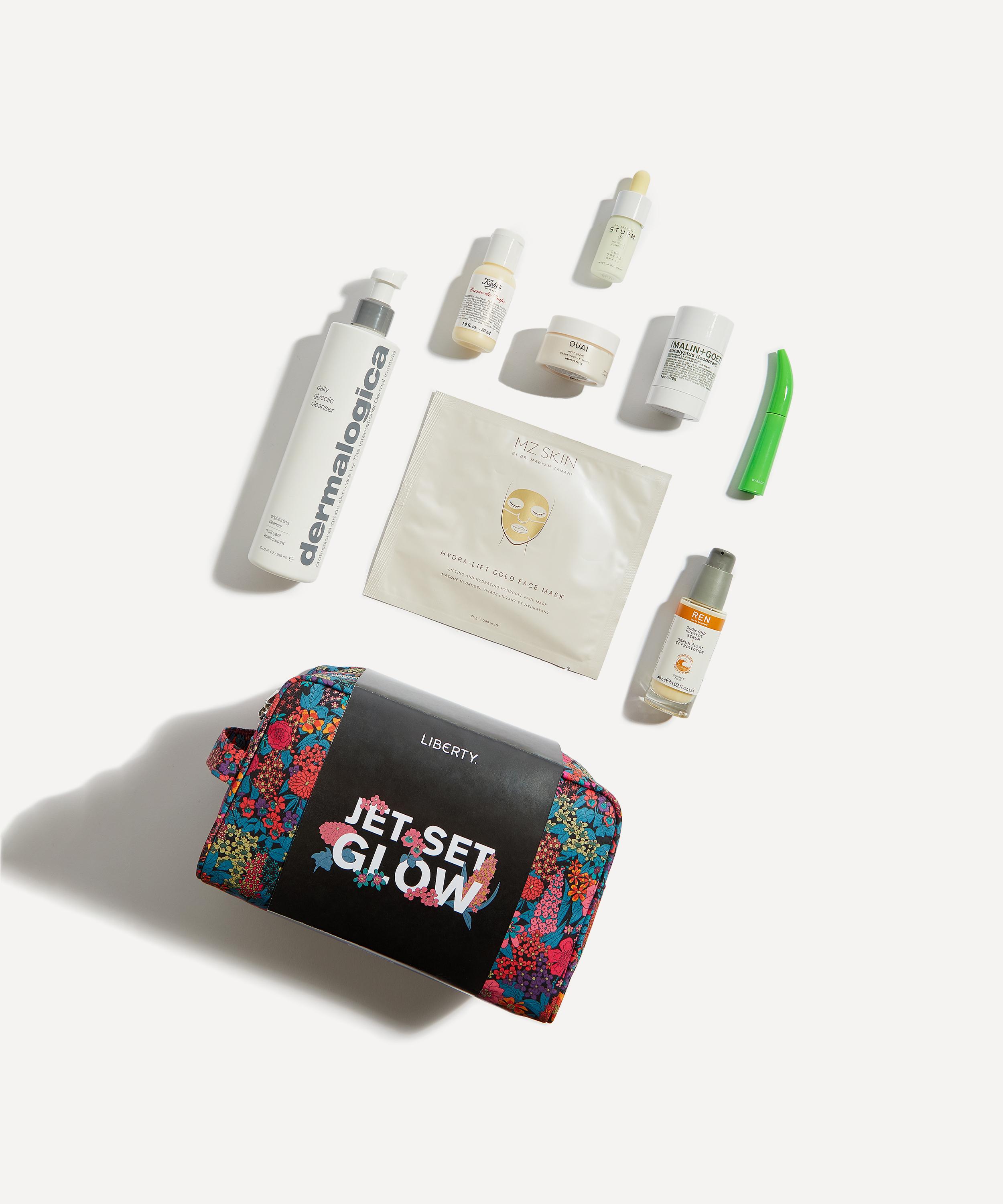 • Jet Set Glow kit includes: Dr. Barbara Sturm Sun Drops SPF50 10ml, Byredo Mini Astronomical Mascara, MALIN+GOETZ Eucalyptus Travel Sized Deodorant 28g, OUAI Body Creme Melrose Place Deluxe 30ml, MZ Skin Hydra-Lift Gold Face Mask Single, REN Clean Skincare Radiance Glow and Protect Serum 30ml, Dermalogica Daily Glycolic Cleanser 295ml, Kiehls Crème De Corps 30ml and a Liberty print washbag