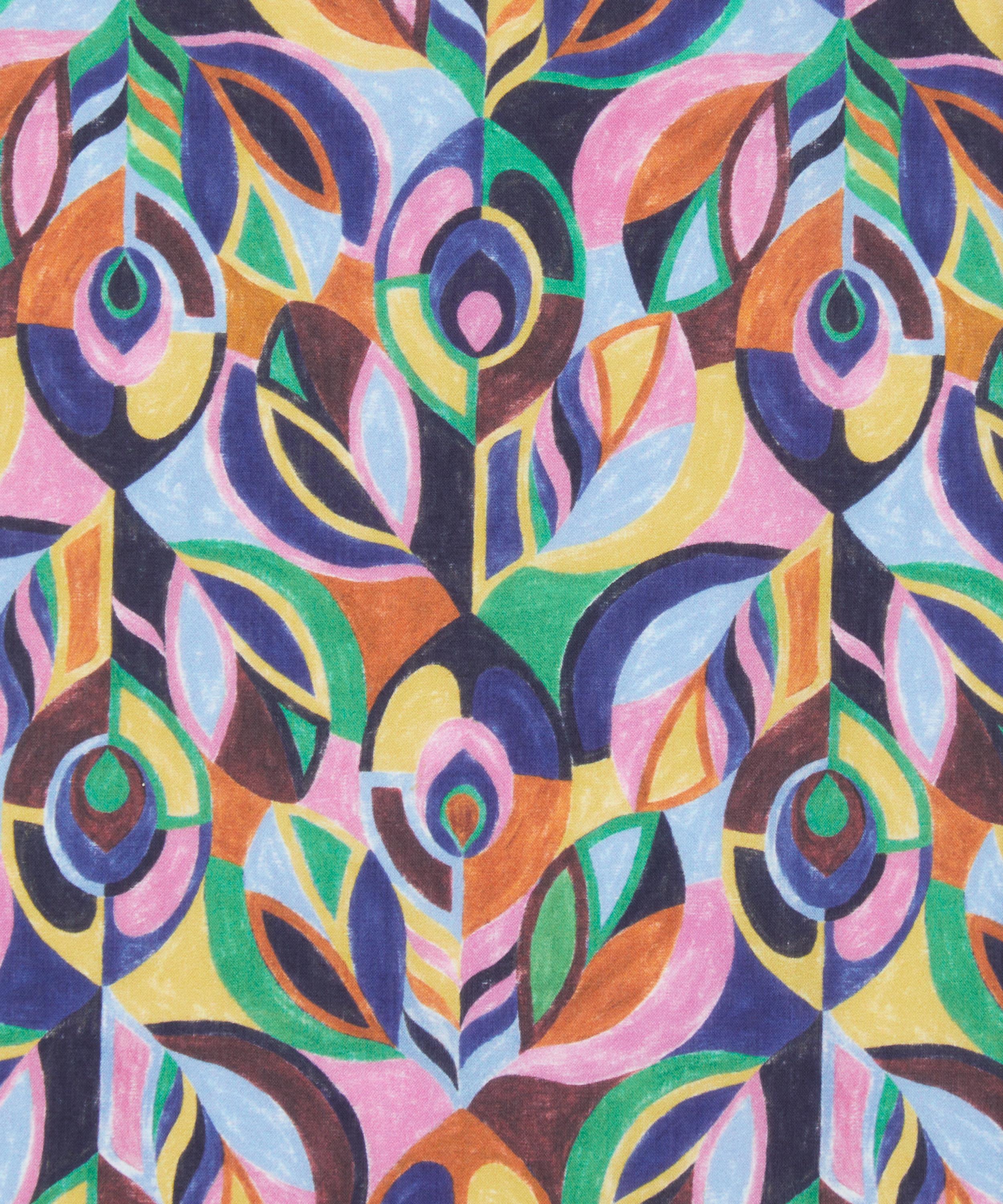 Jewelled Peacock was inspired by a pendant design discovered in a book of Liberty jewellery illustrations originating from the turn of the 20th century. Featuring a simplified rendition of a peacock feather motif, the pencil-drawn sketch was reimagined with richly textured, acrylic paint. Flowing both vertically and horizontally across the fabric, this graphic pattern is imbued with a sense of alternating movement. This print is part of the Craftsmanship narrative of this collection, exploring the creative process from within the Liberty archive, from print impressions and embroidered studies, to ceramics, jewellery, and furniture. Uncover the origins of the designers’ musings through artworks inspired by their sketchbooks and prototypes.
