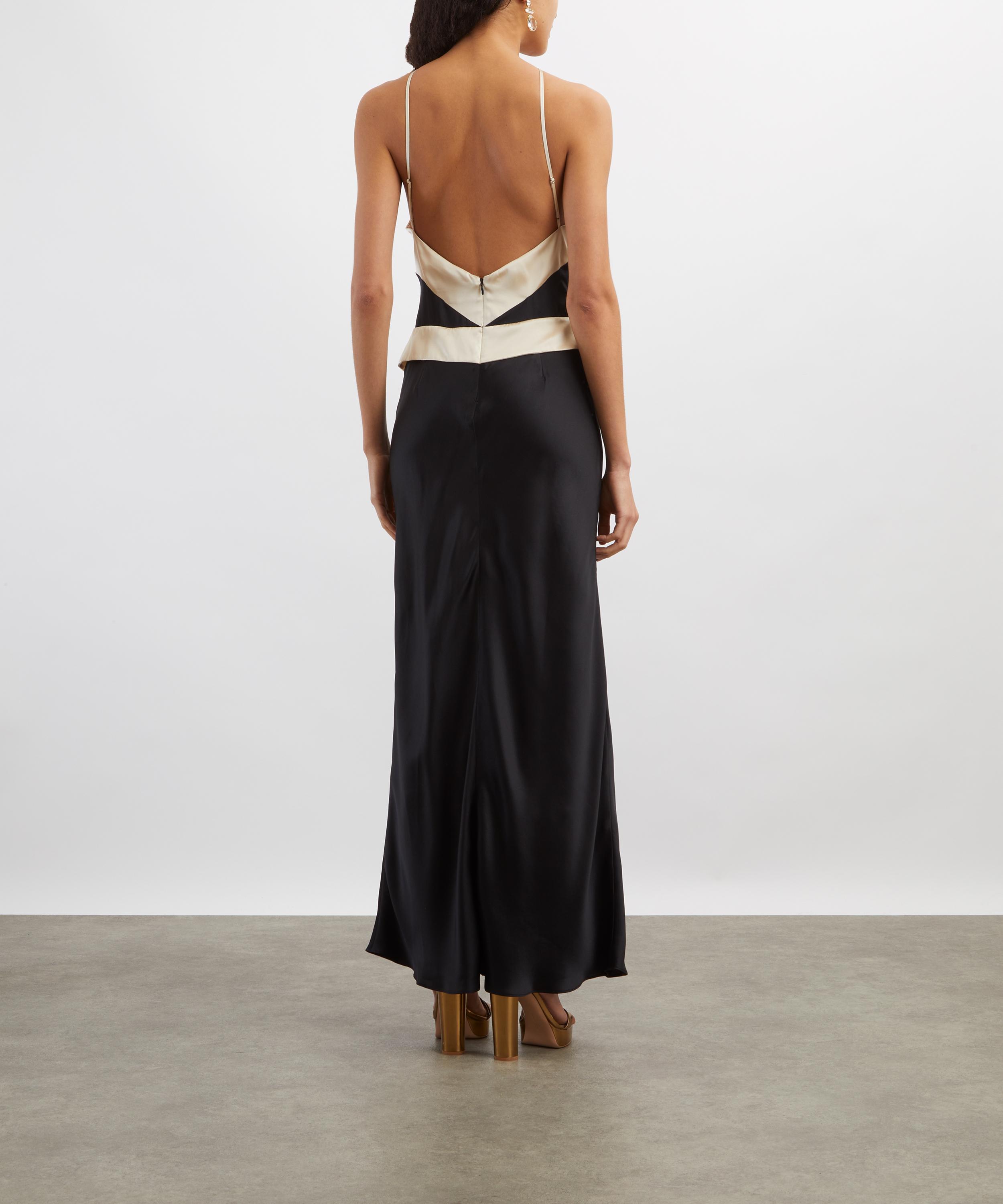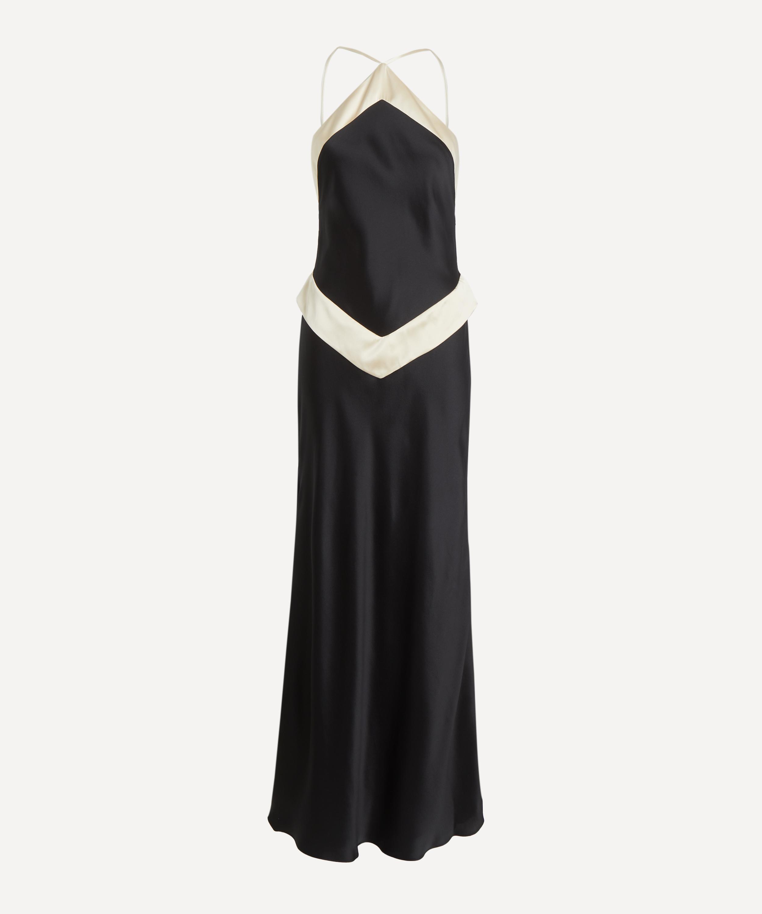 Crafted from lightweight silk charmeuse, the Jillian Dress exudes effortless elegance. Designed for a relaxed fit with an adjustable halter neckline, open back, and a flowing floor-grazing hem, it’s finished with contrast white trims for an eye-catching touch.