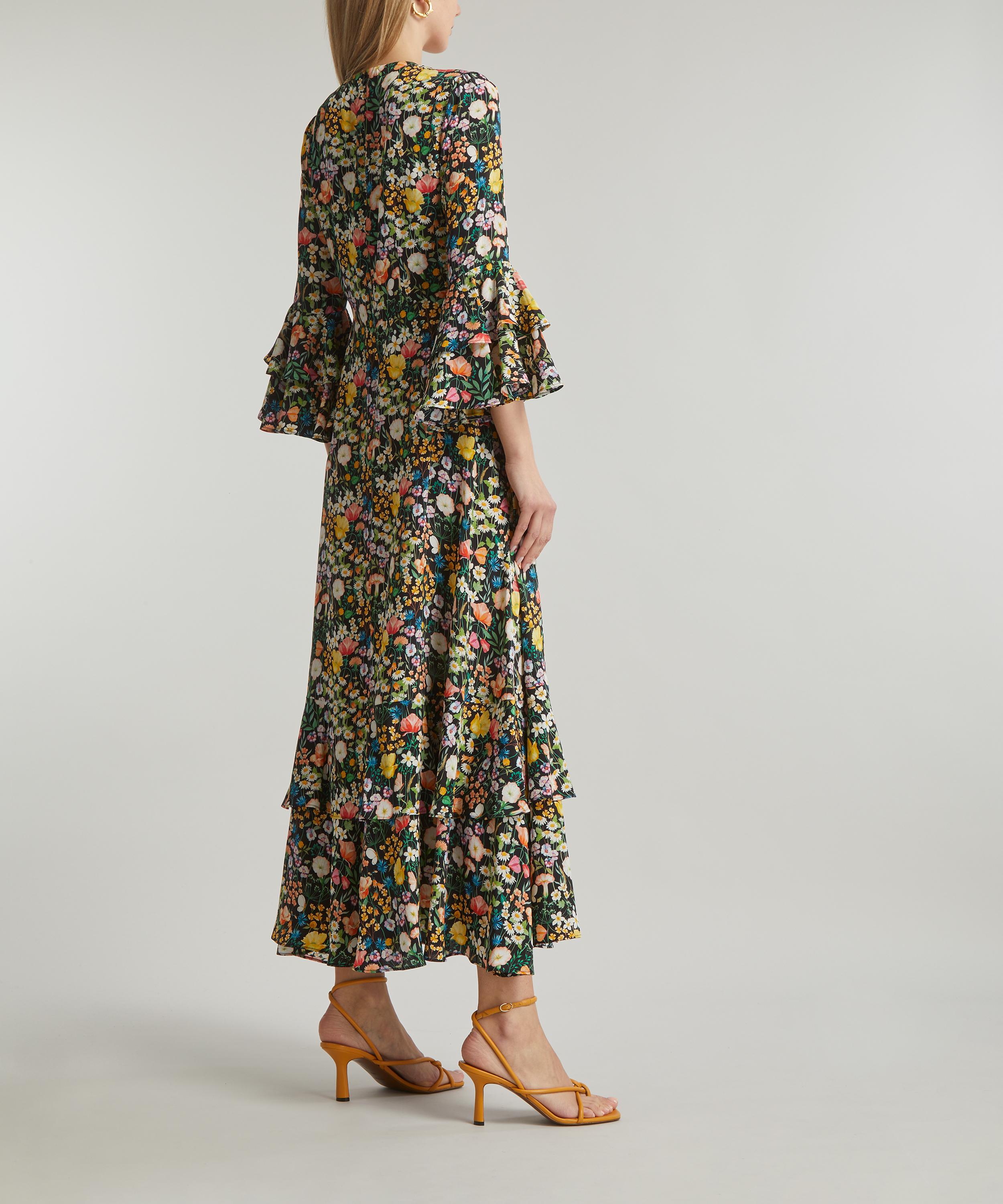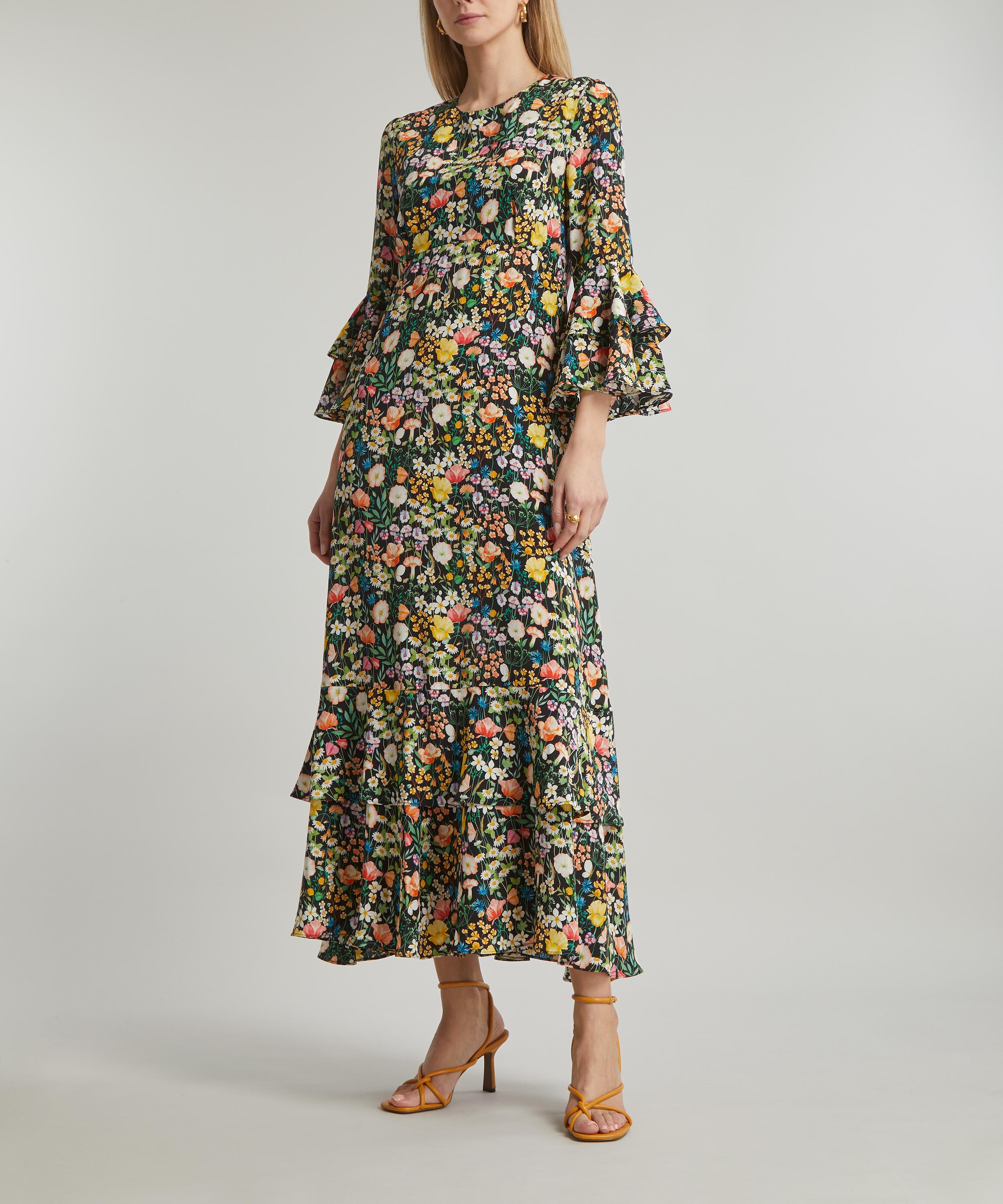 The Gala dress is made using fabric printed in Italy at the Liberty Printing Mill and features an empire waistline, delicate tier detailing and pagoda sleeves for an effortless, longline silhouette. The dress features our Jude’s Floral print - created in watercolour paints, British wildflowers including: daisies, buttercups, poppies, violets, apple blossom, cornflowers, harebells, red campions and geraniums, alongside various grasses, populate this botanical design. Amp up the drama of this dress with a statement heel or let the print stand out by pairing with minimal accessories for a sleek event look.