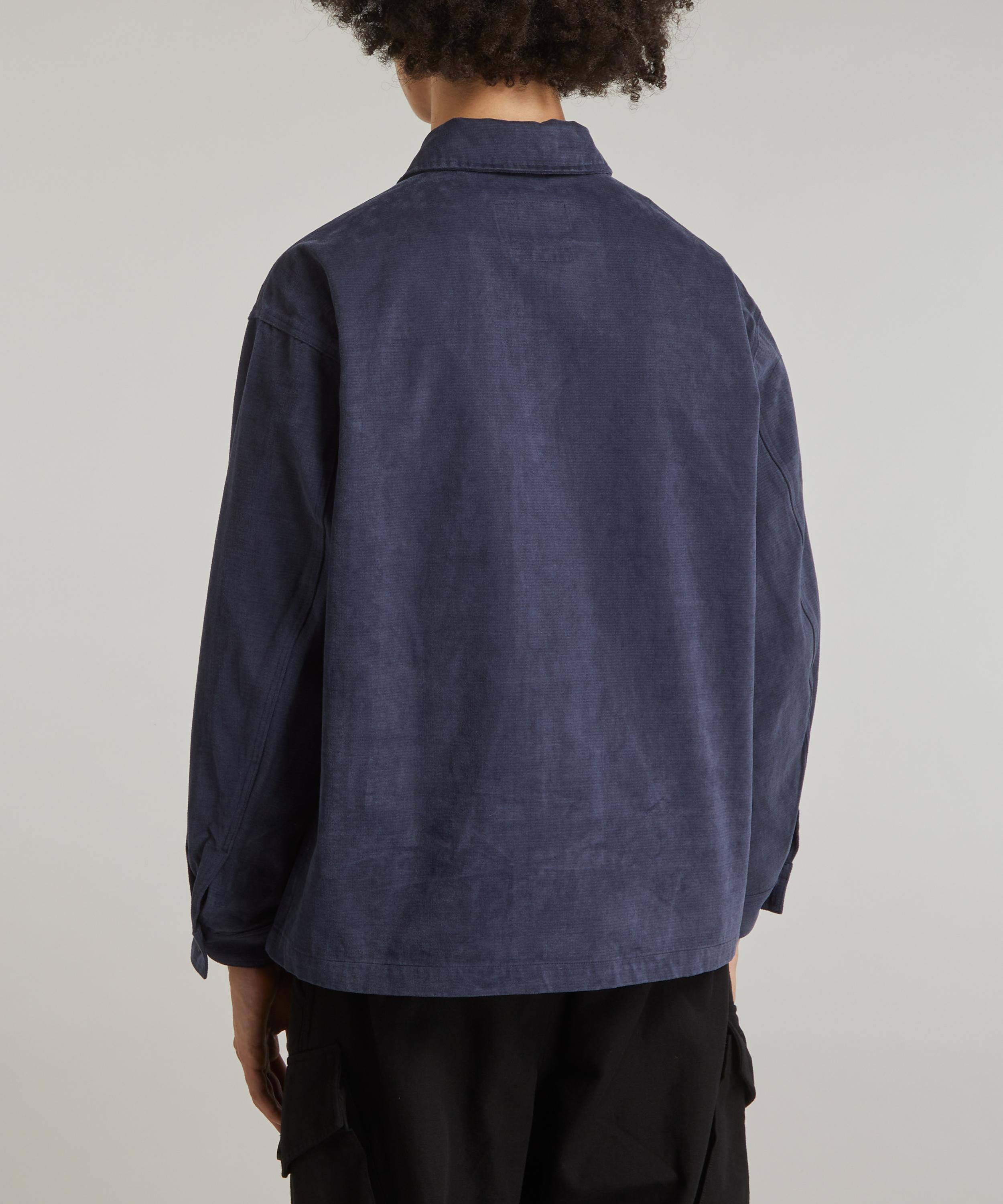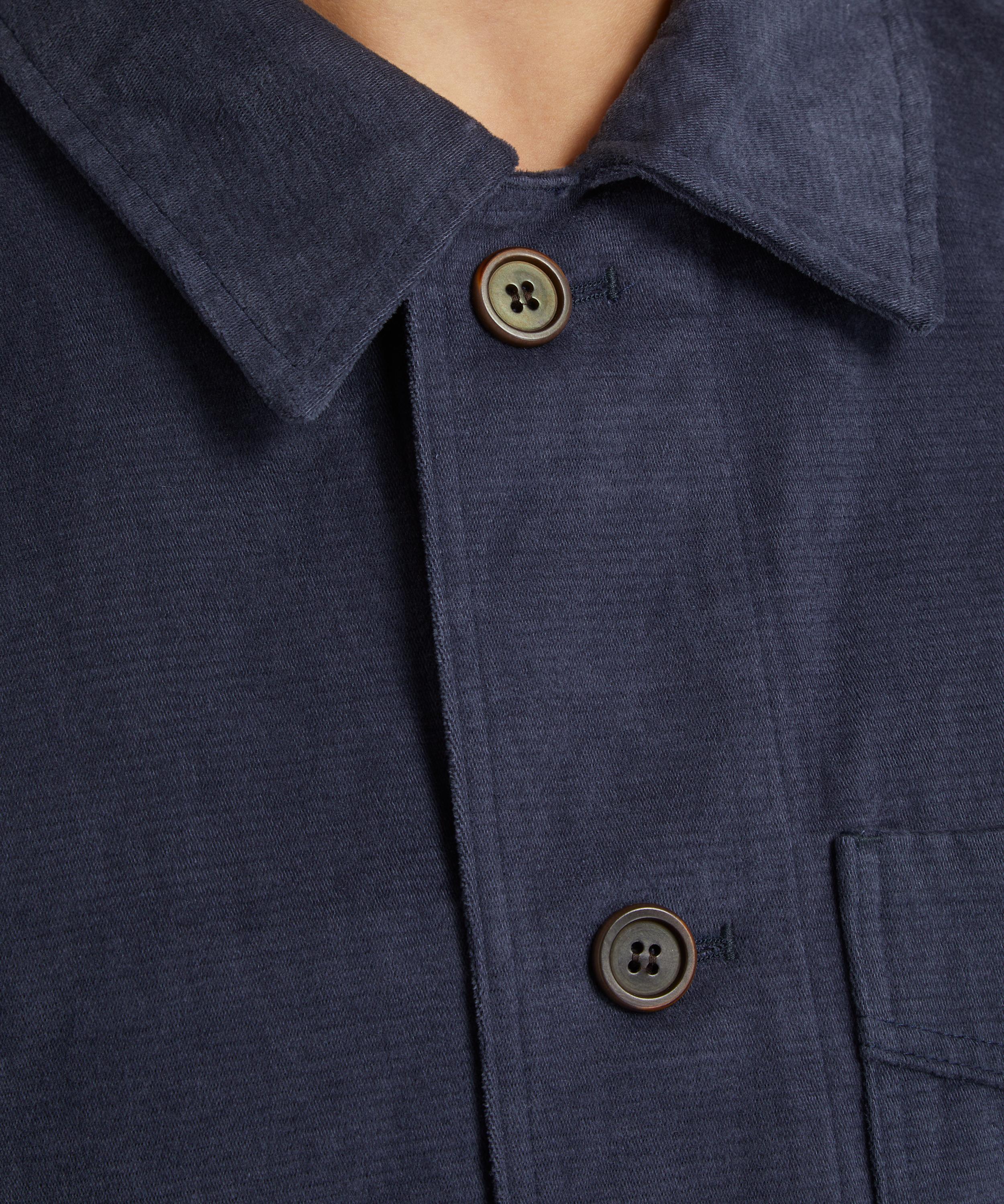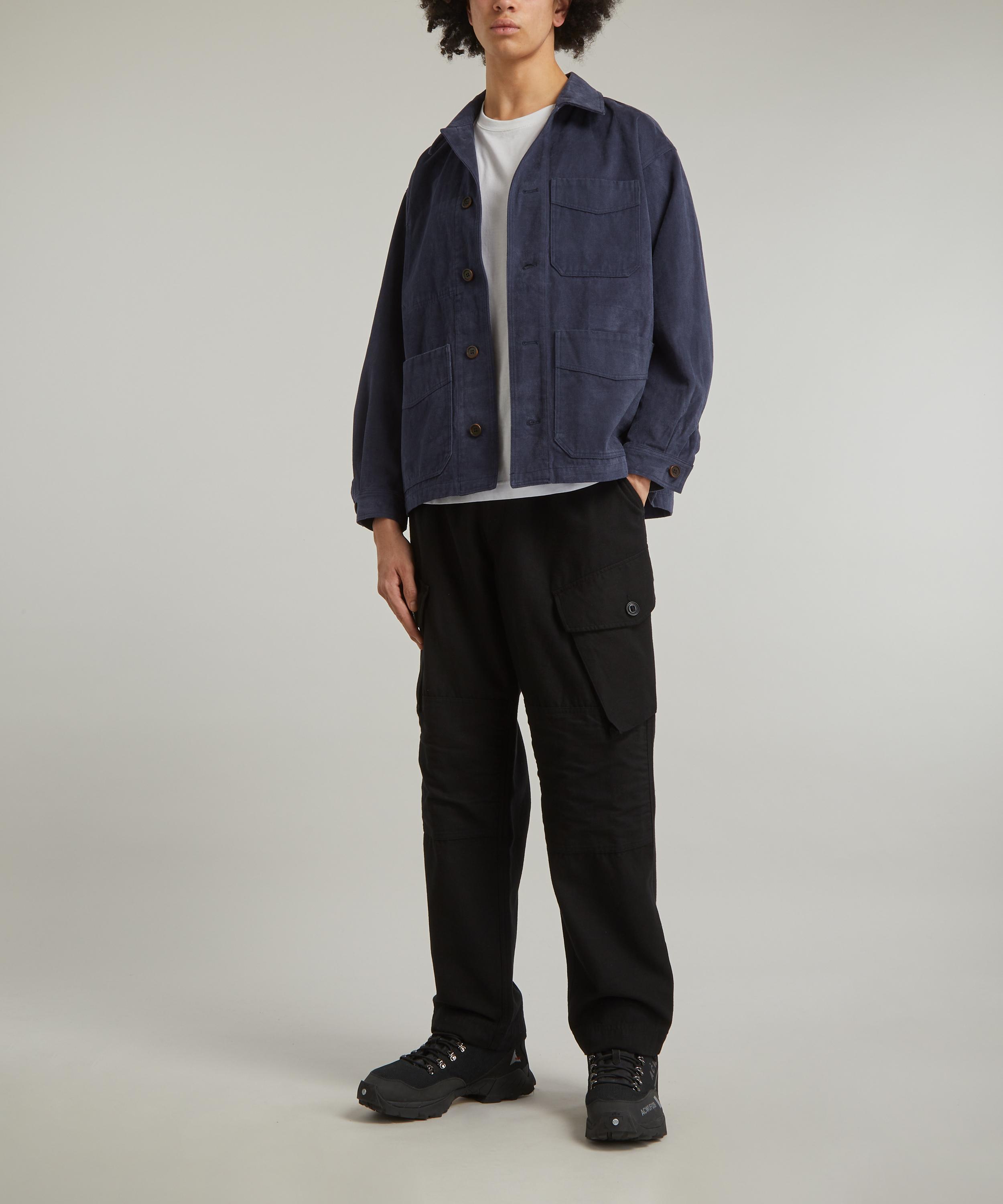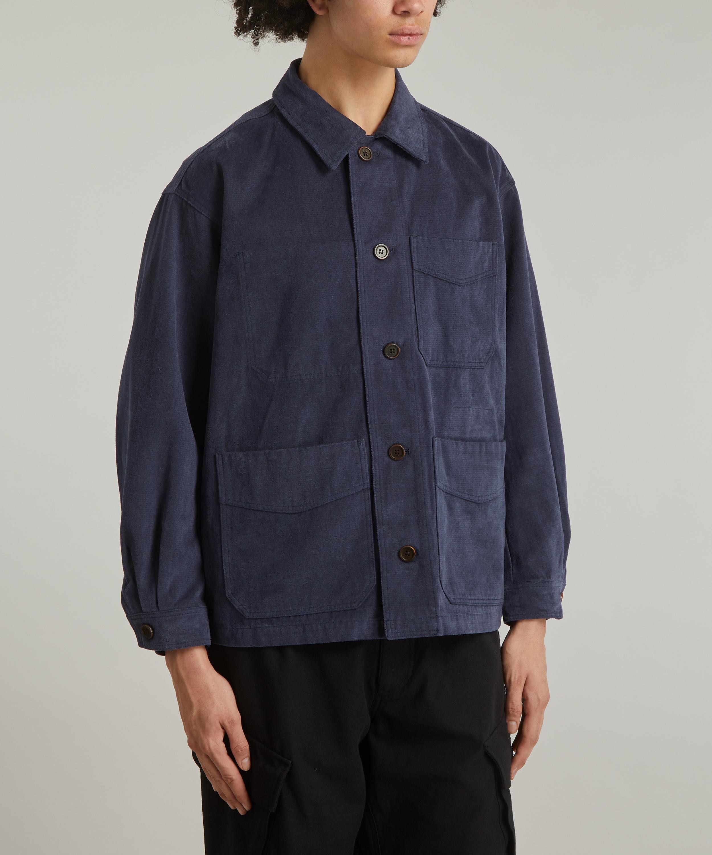 A contemporary take on classic French workwear styles, this navy jacket is cut from moleskin cotton fabric for a relaxed fit with dropped shoulders. Fitted with a spread collar and three large patch pockets, it’s secured with a button closure.