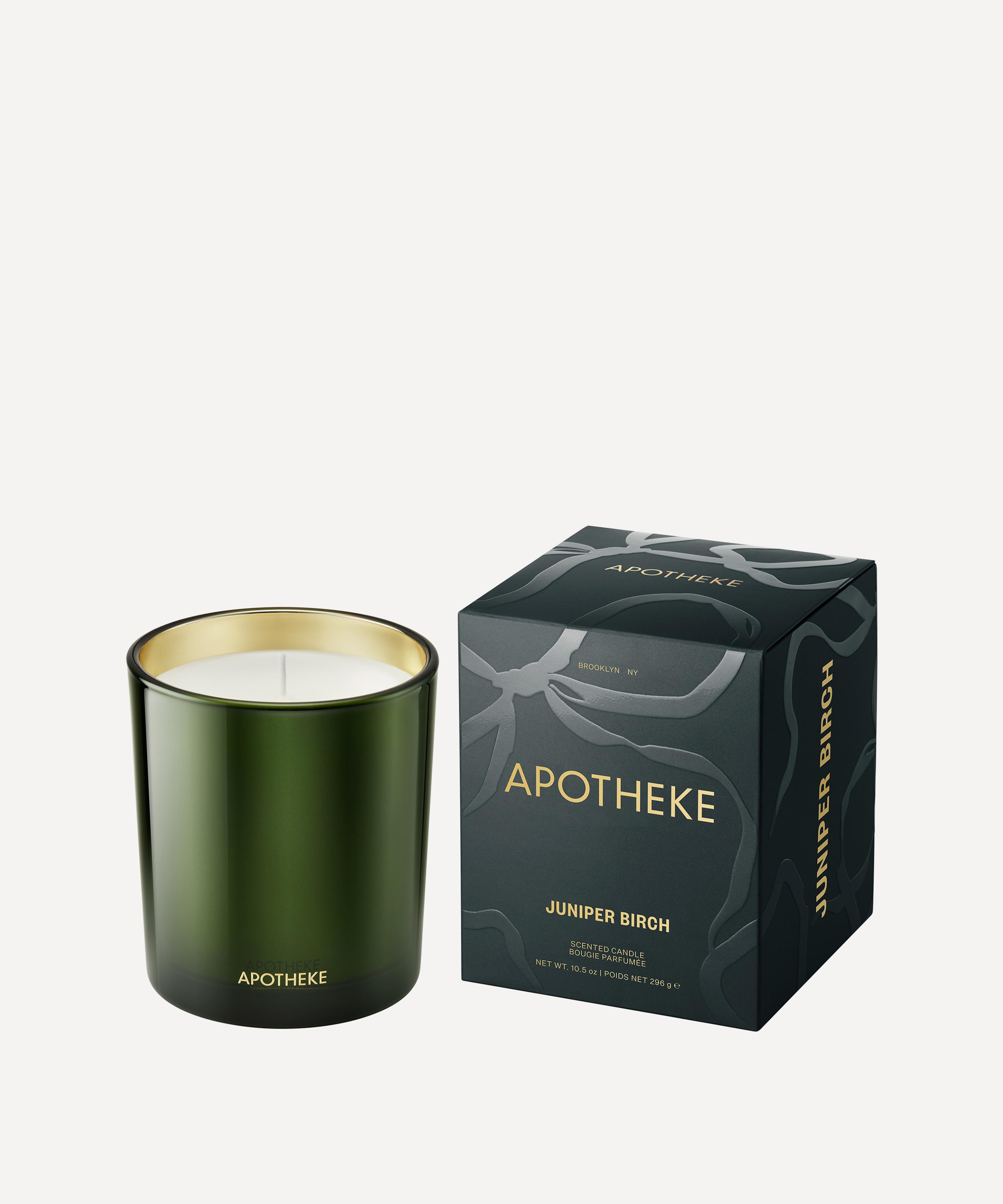 Elevating the atmosphere of your home with a majestic fragrance, Apotheke presents the Juniper Birch Classic Scented Candle housed in a gold-interior, green glass vessel.