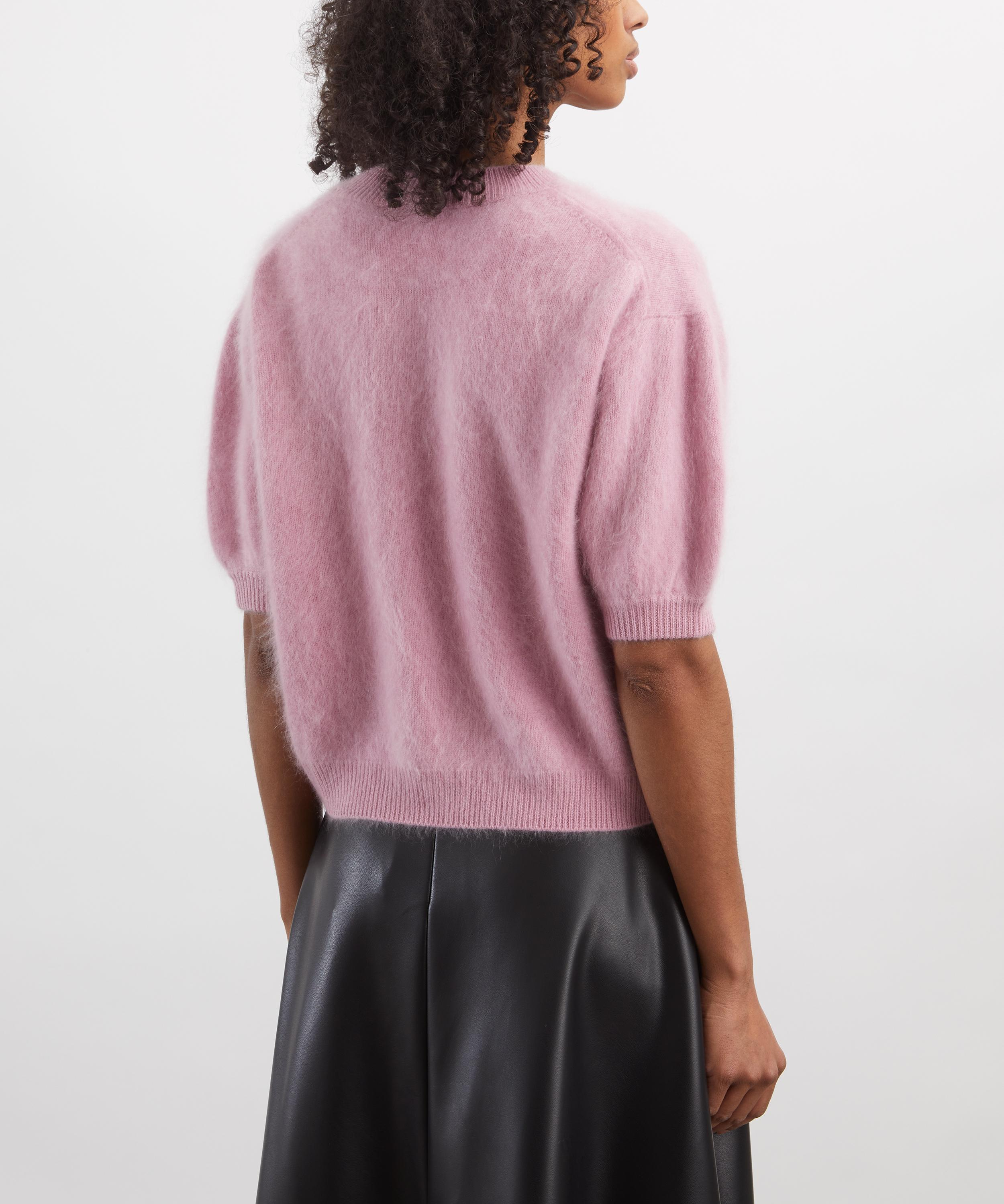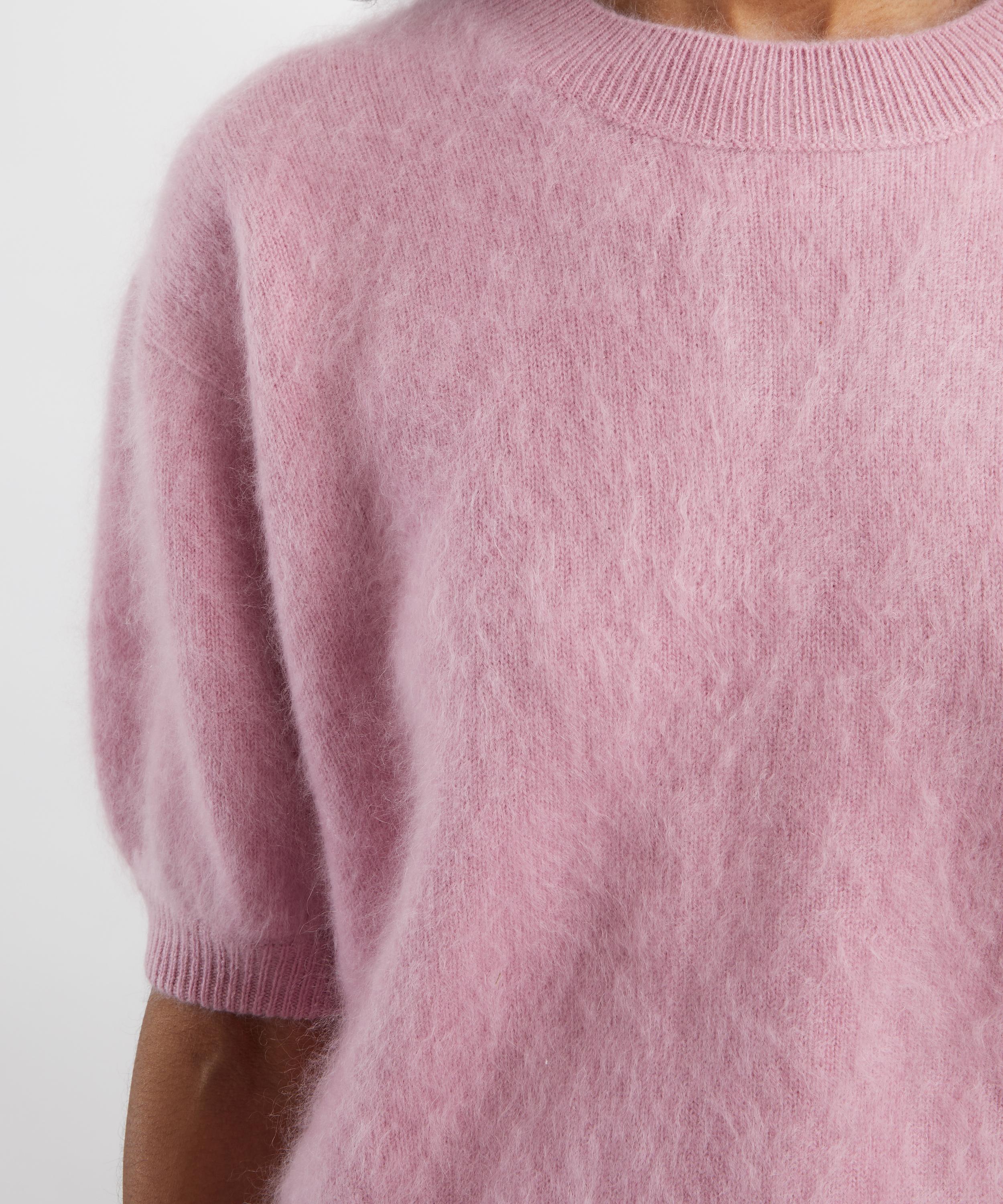 Spun from brushed cashmere for a sumptuously soft hand, this pink jumper features a slightly cropped silhouette complete with a crew neck, dropped shoulders, and short sleeves.
