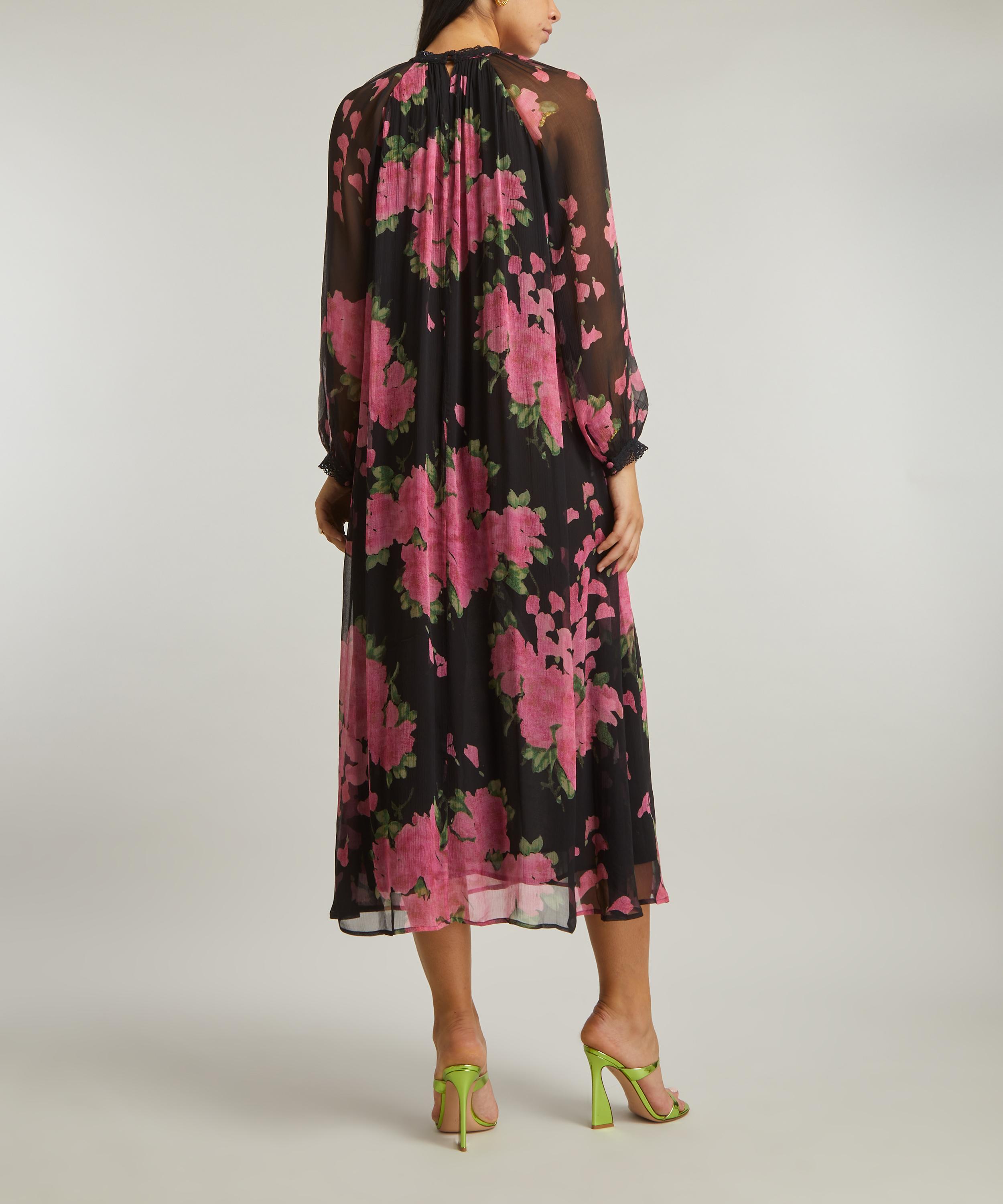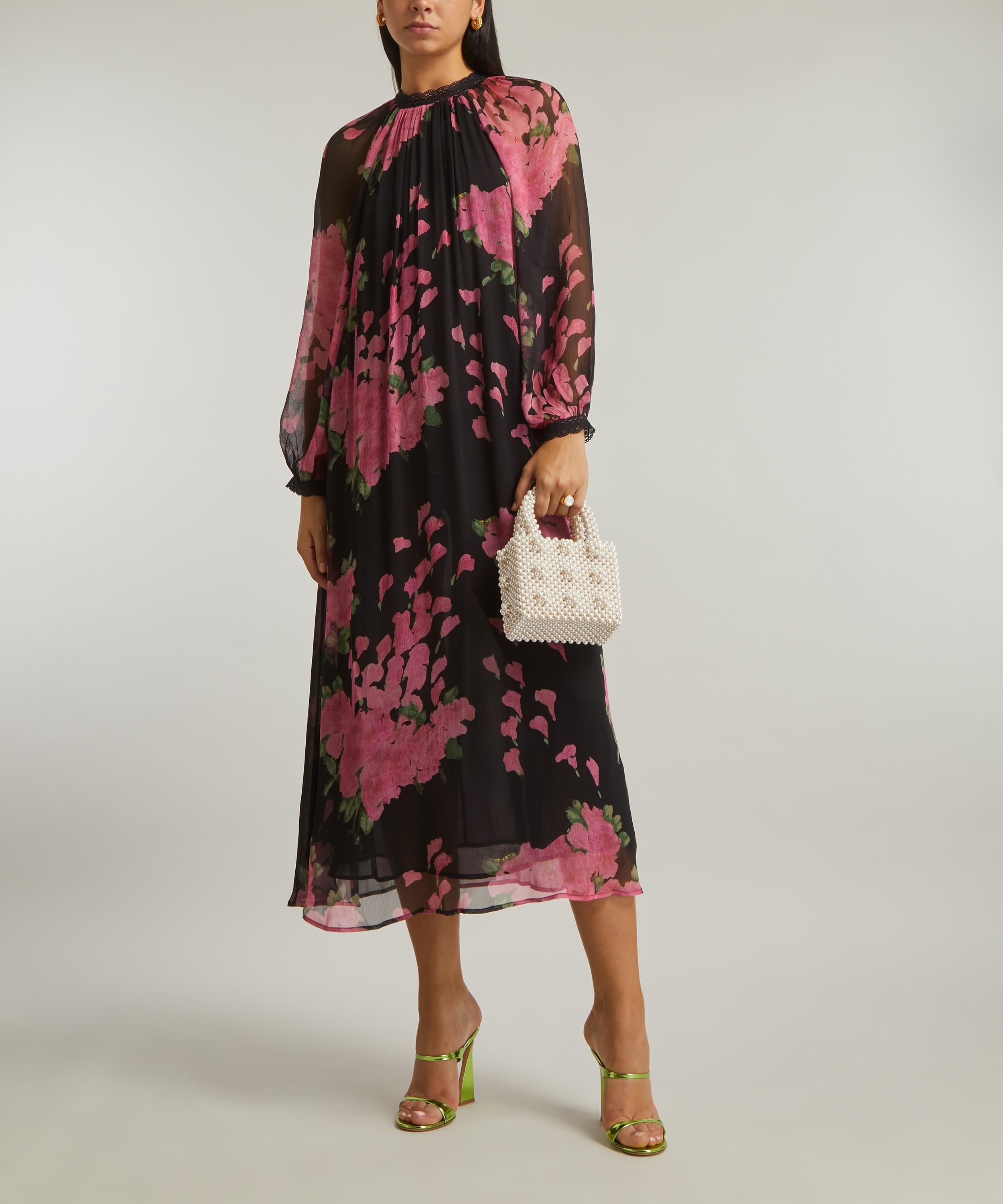 Adorned all-over in a pink blossom print, this seventies-inspired tent dress is designed for a breezy, relaxed fit complete with voluminous dolman sleeves. Gathered at the neckline, its collar and cuffs are embellished with lace trims for an authentic vintage finish.