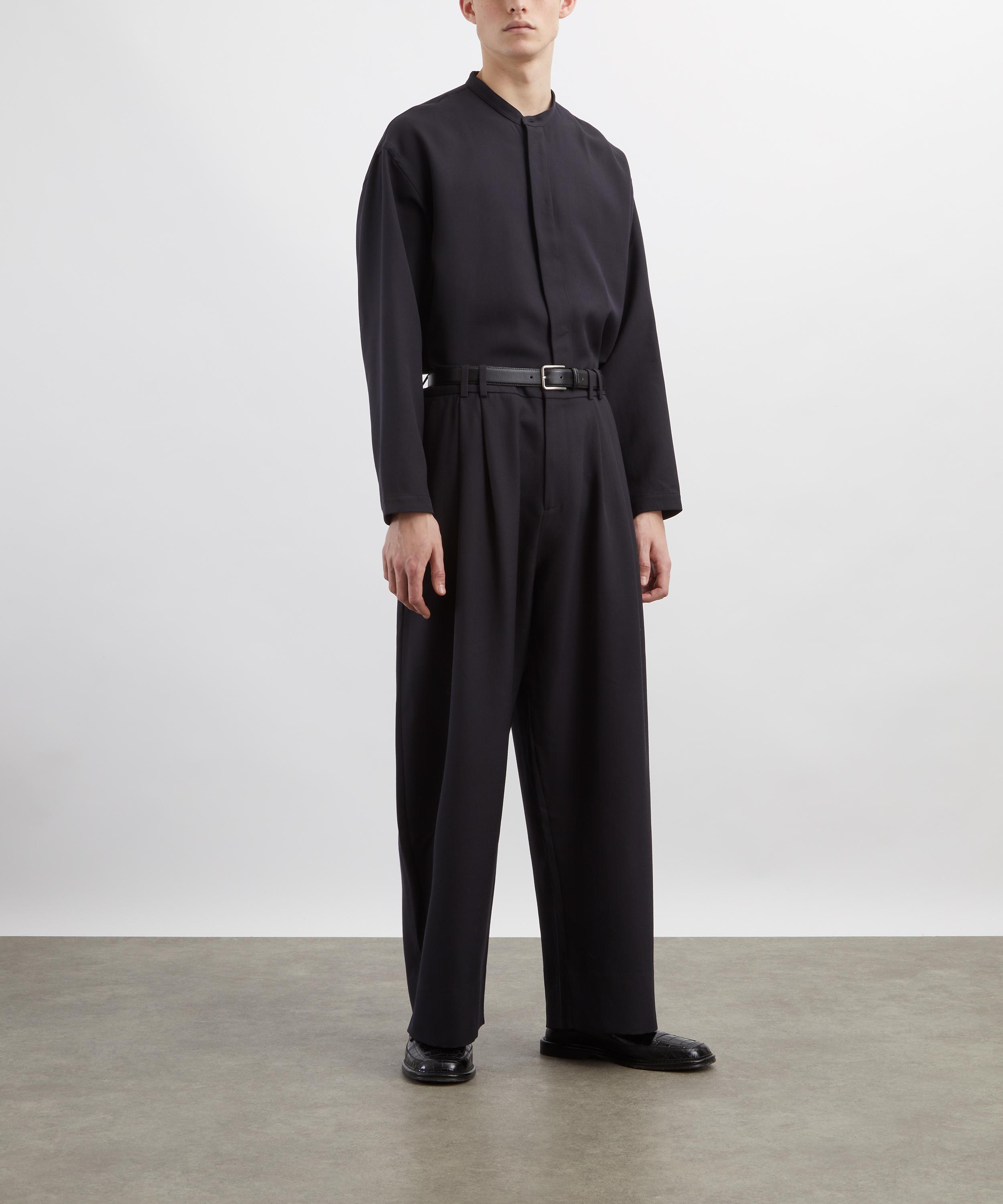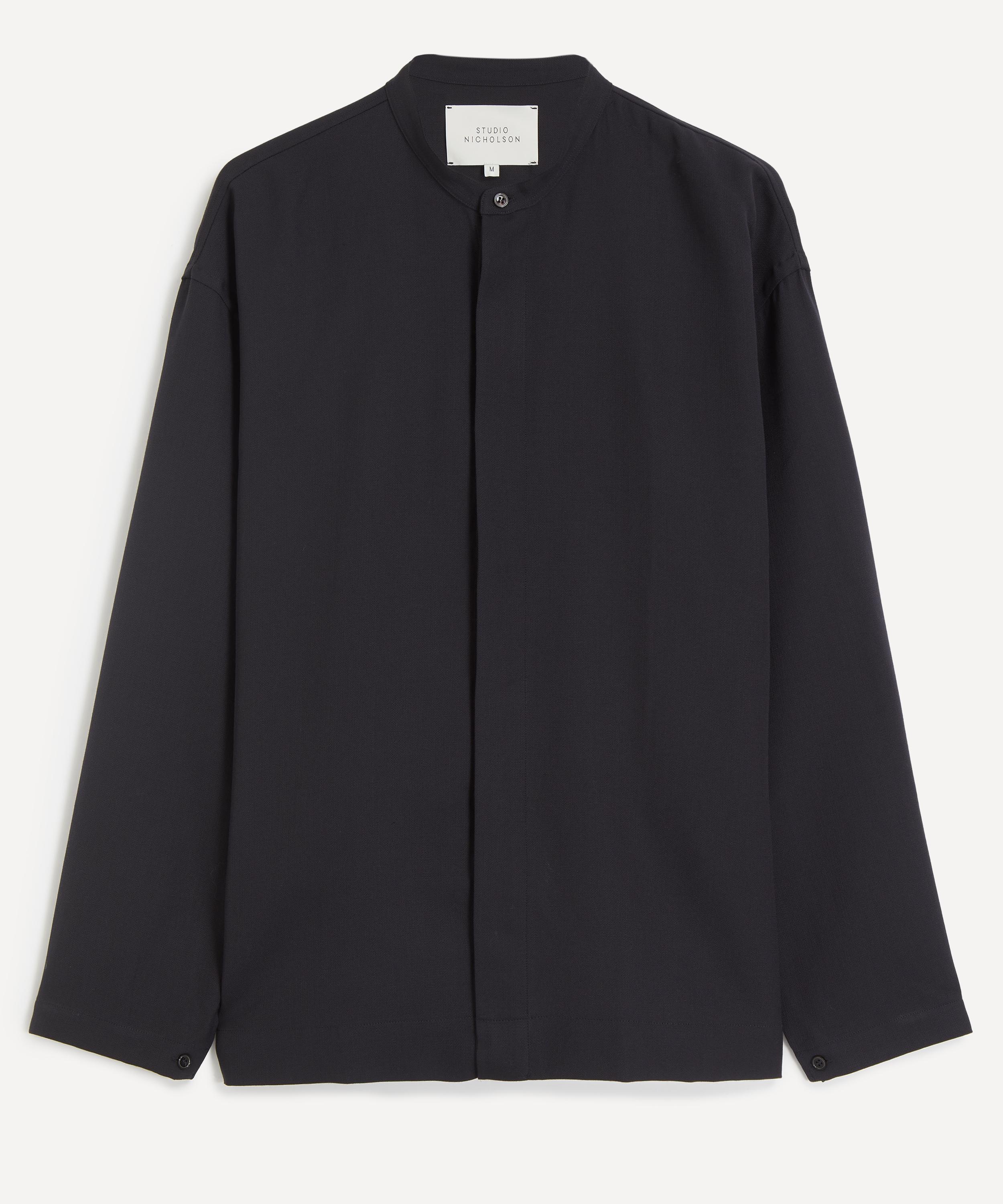Crafted with elements of soft wool, it’s shaped with a Grandad collar to an oversized fit and features a concealed button placket, accentuating the minimalist, clean-lined feel.