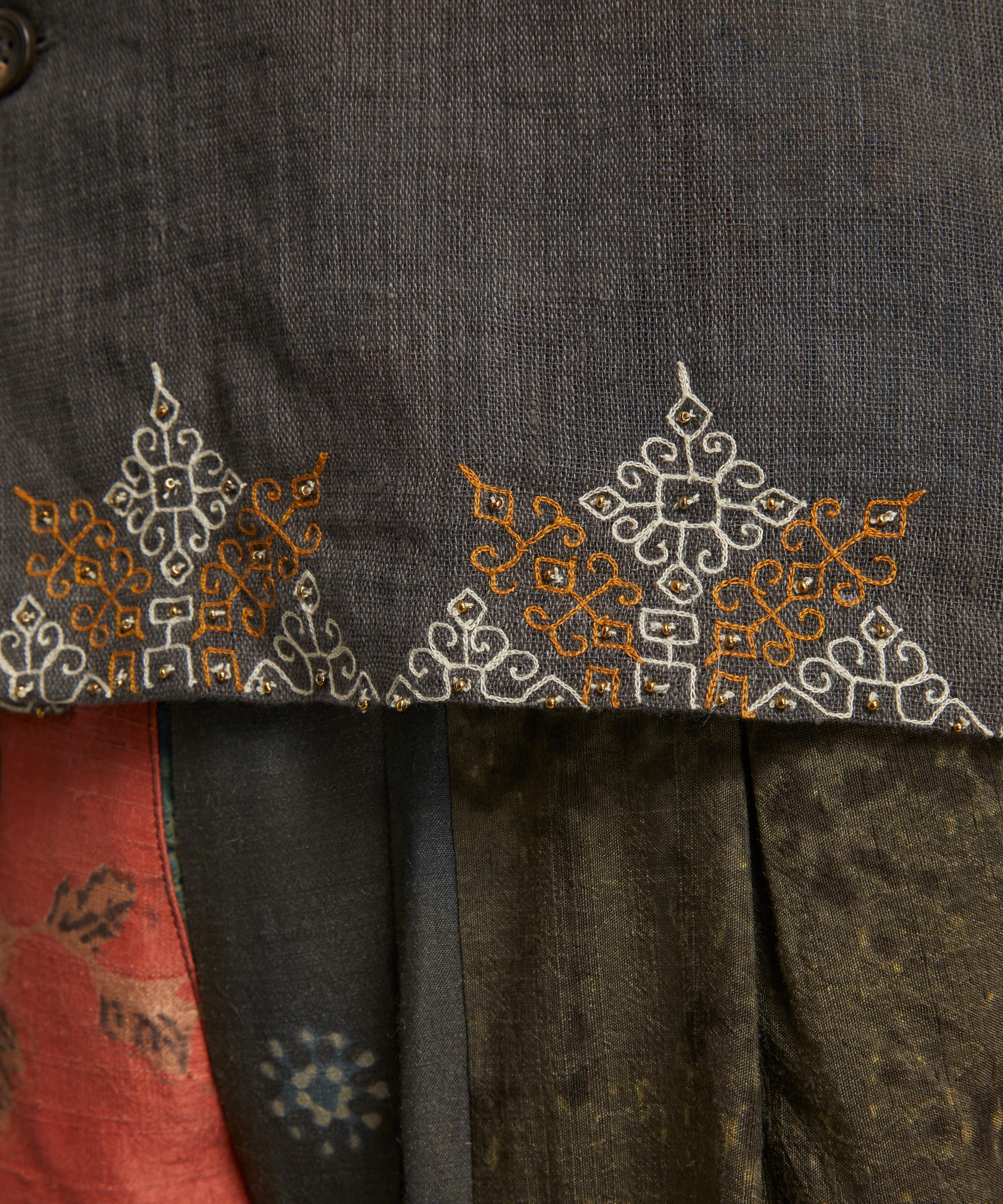Founded in 2021 by Kartik Kumra, Indian brand Kartik Research creates clothing inspired by India’s rich heritage of craft and culture. A celebration of heritage and time-honoured techniques, the brand is committed to preserving centuries-old craftsmanship. Working closely with Indian artisans, each garment is handmade and features intricate handicraft ranging from kantha quilted shorts, to Kasuti-embroidered suits. Weaving the past with the present, each stitch and seam defines craftsmanship in a contemporary way.