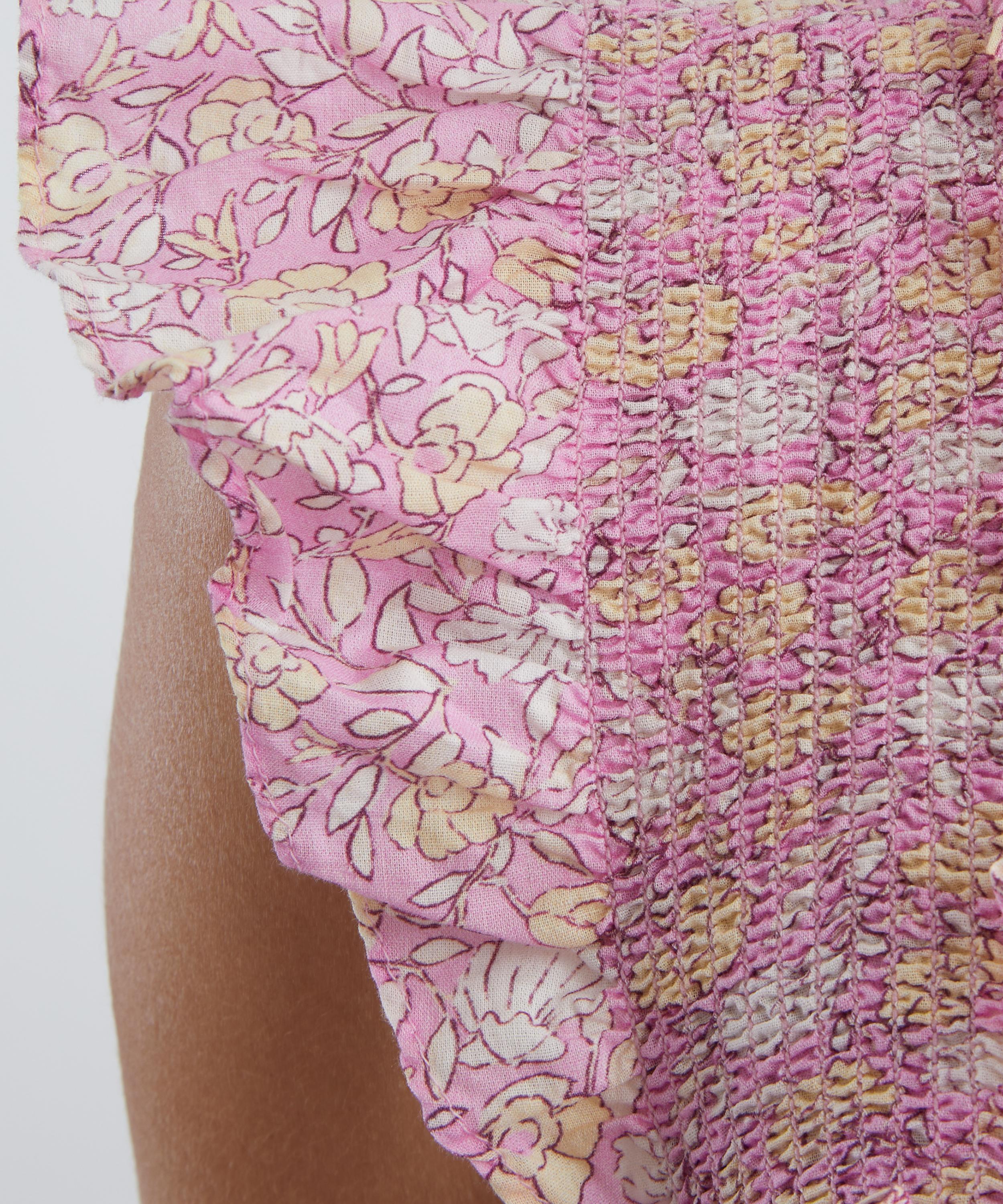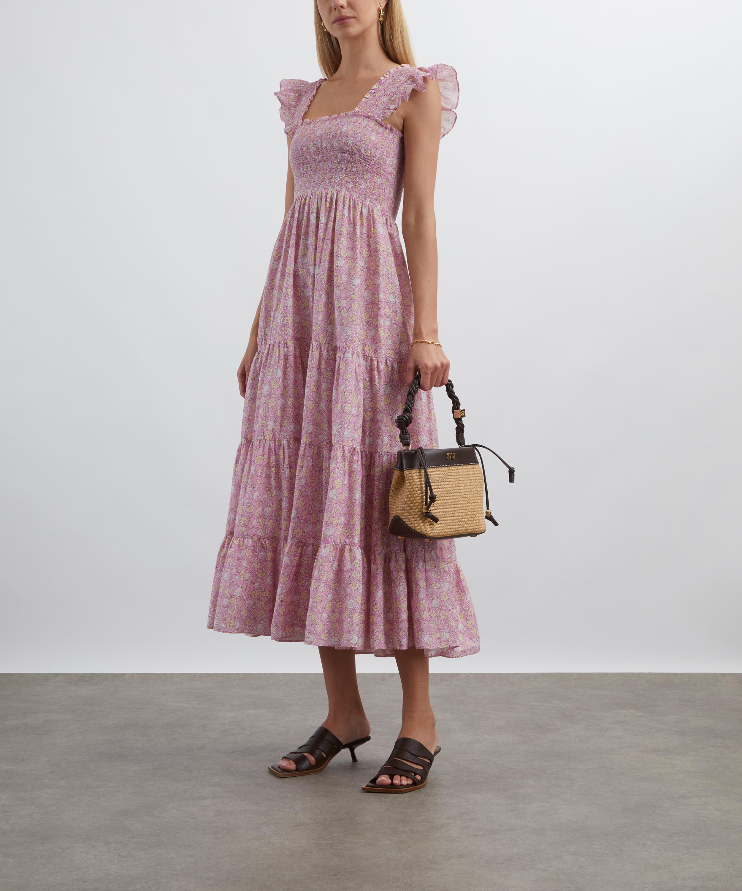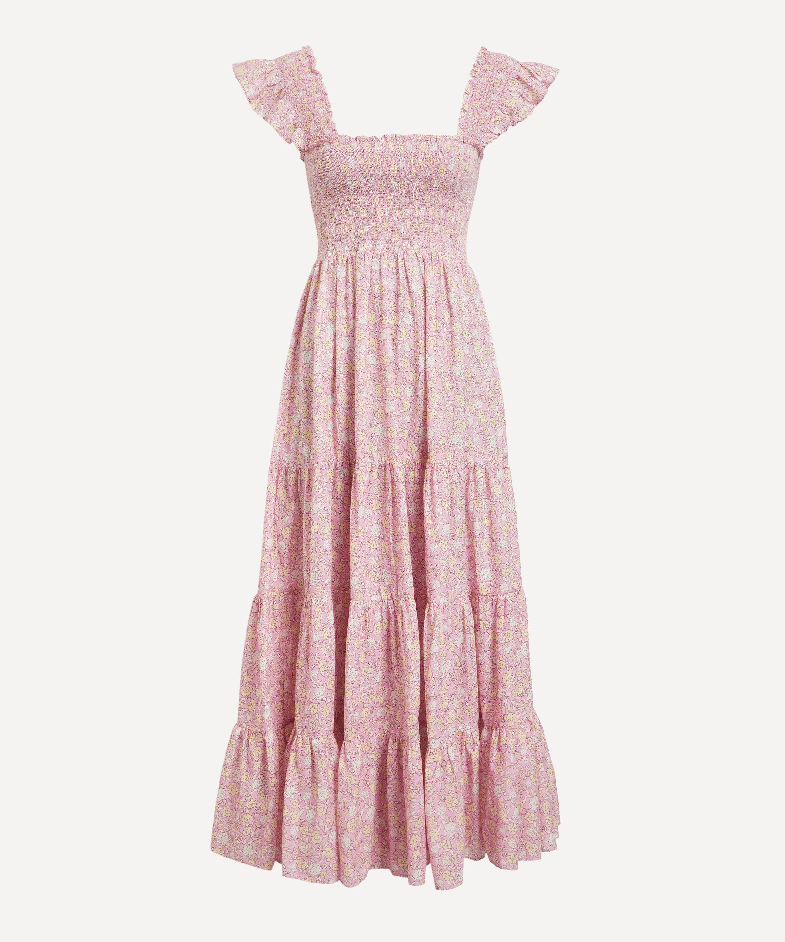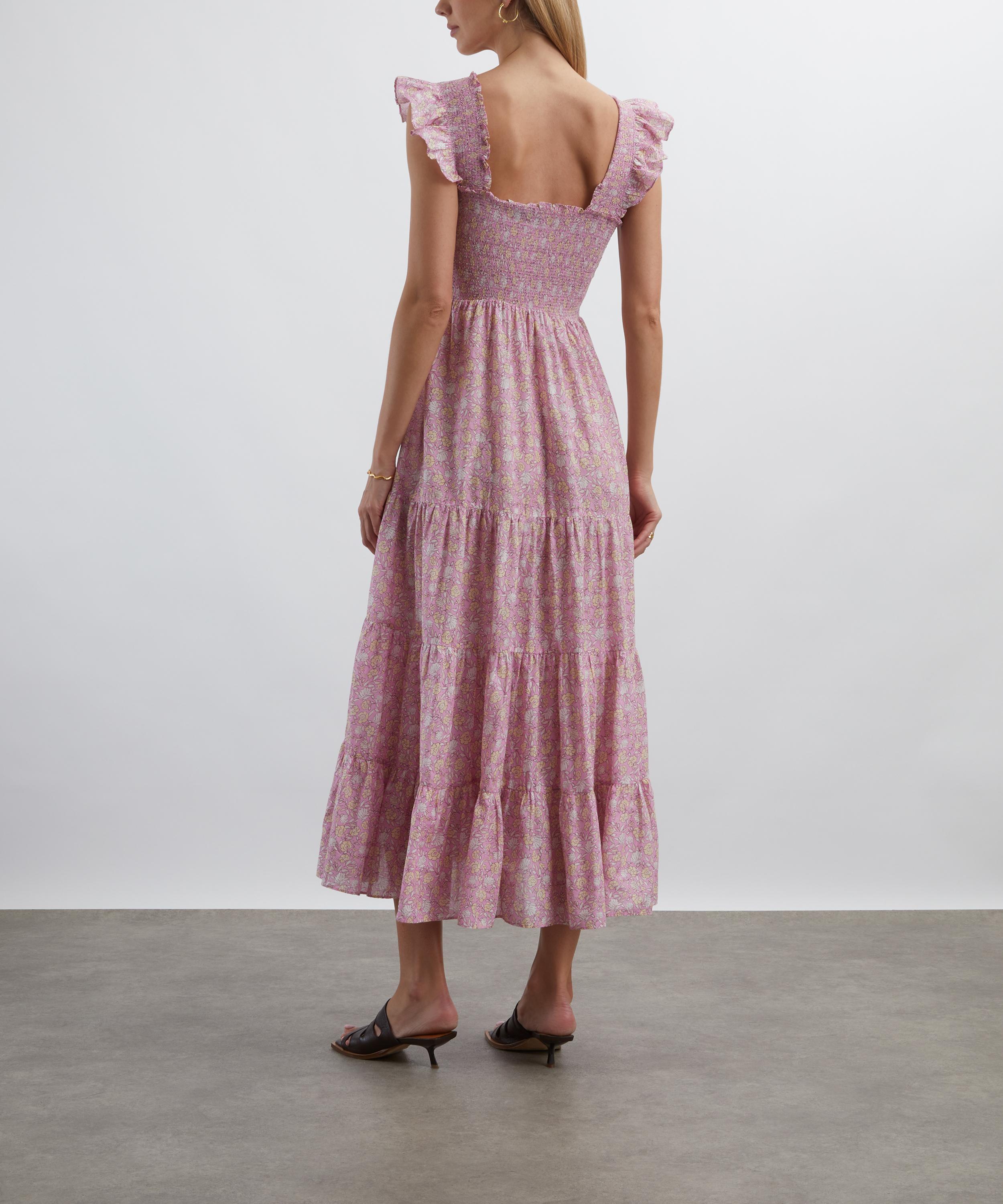 Crafted from lightweight cotton voile and adorned with a pink floral print, this midi dress embodies effortless elegance. Delicately detailed with ruffles, it features a square neckline, a smocked bodice, and a tiered full skirt that falls to a floaty ankle-grazing length.