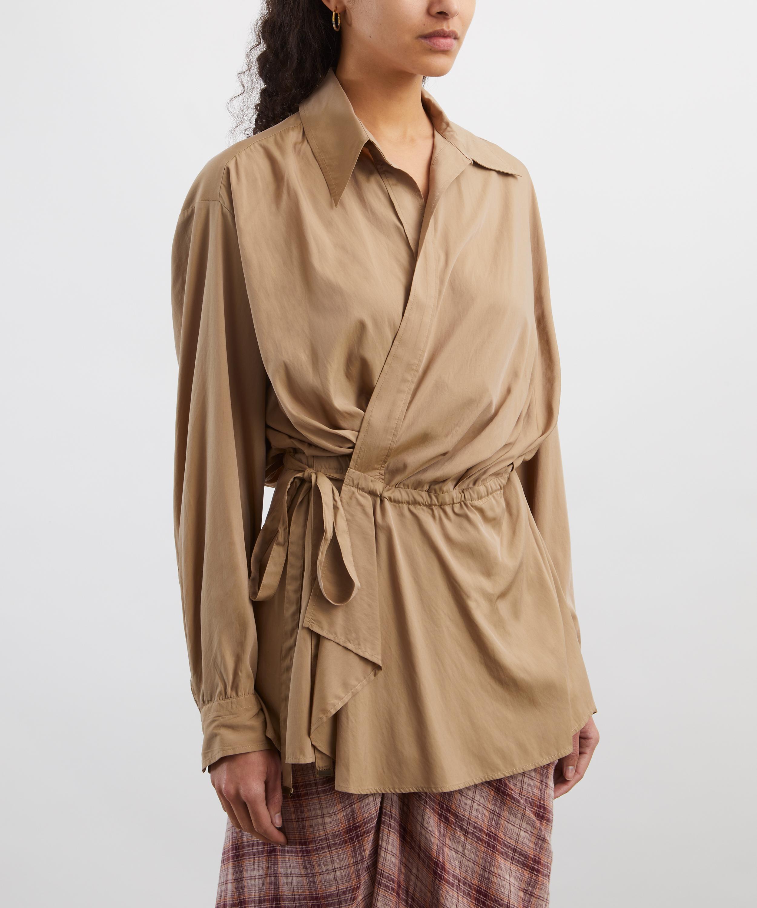 Crafted from technical satin, this khaki jacket reimagines classic utilitarian style with a fashion-forward edge, defined by dropped shoulders, a draped wrap-over front, and drawstring waist ties.