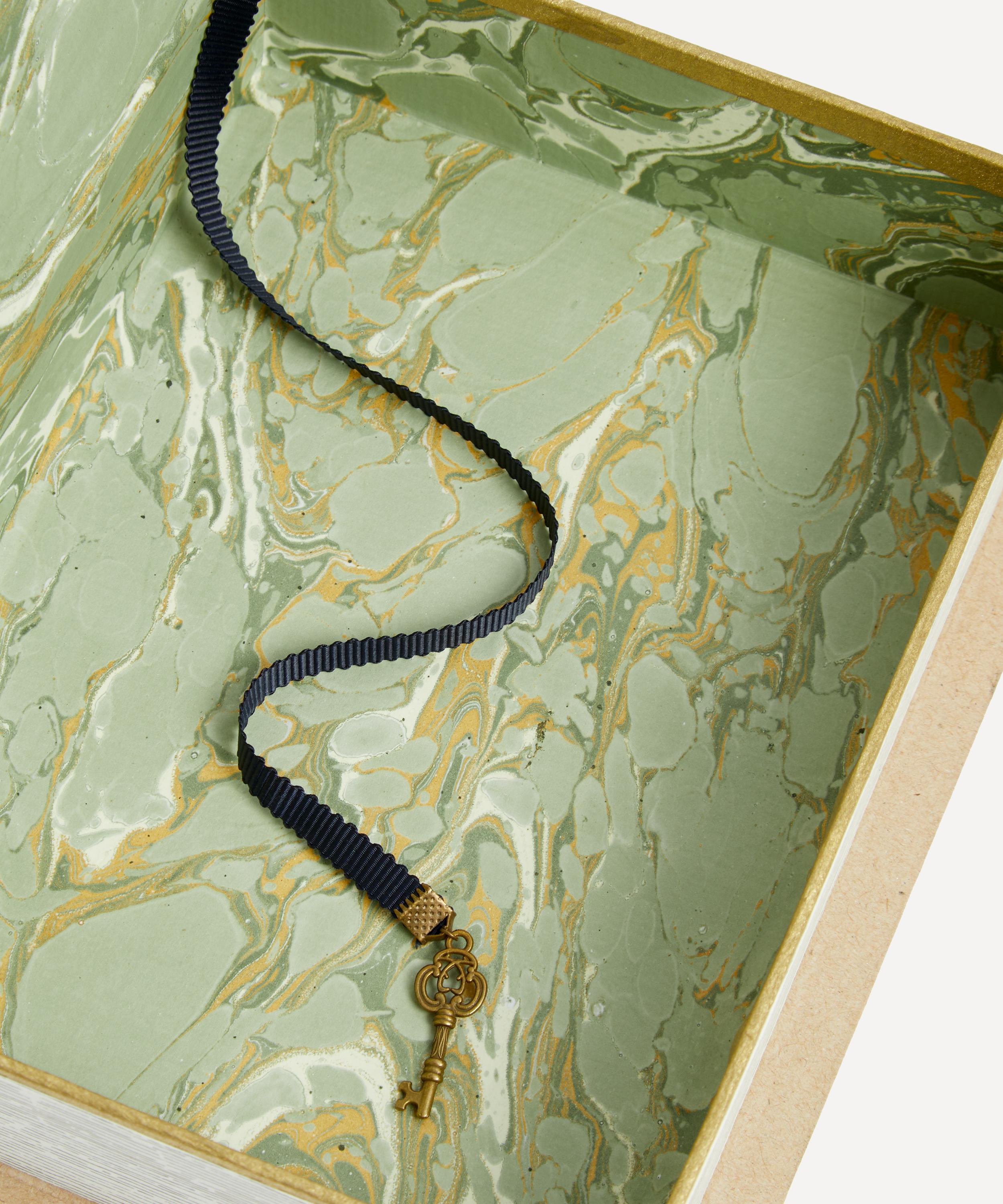 Taking inspiration from 18th century French tradition, this book is meticulously designed to subtly squirrel away your trinkets and treasures, crafted to beautifully blend into a mantle or shelfscape. The interior is elegantly lined with marbled binding paper that has been hand-printed in France, with a ribbon and a metal trinket in the shape of a key at the end to complete the piece.