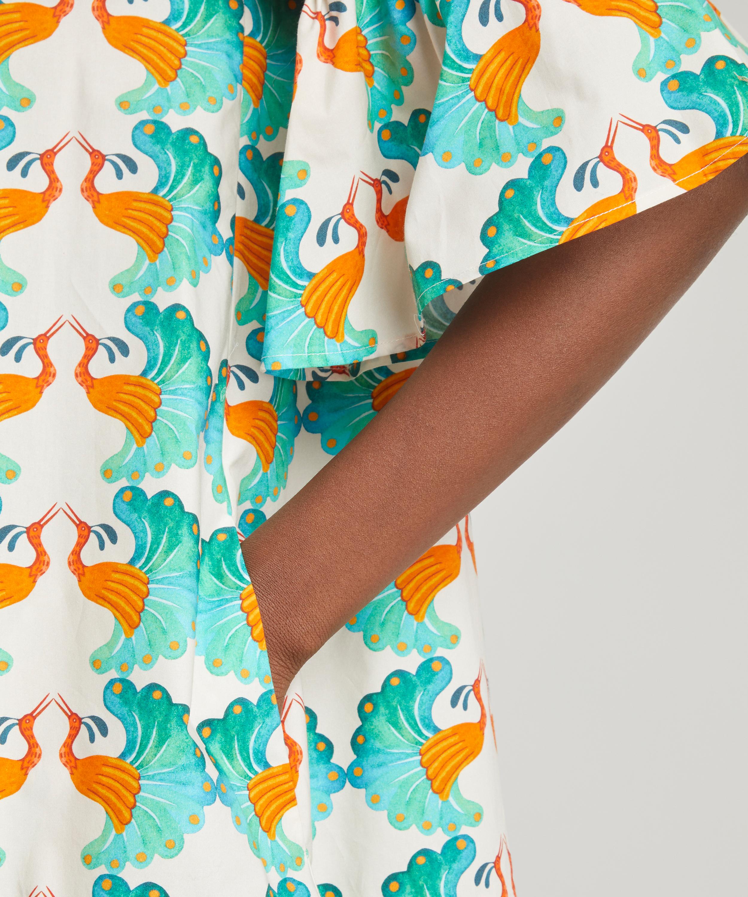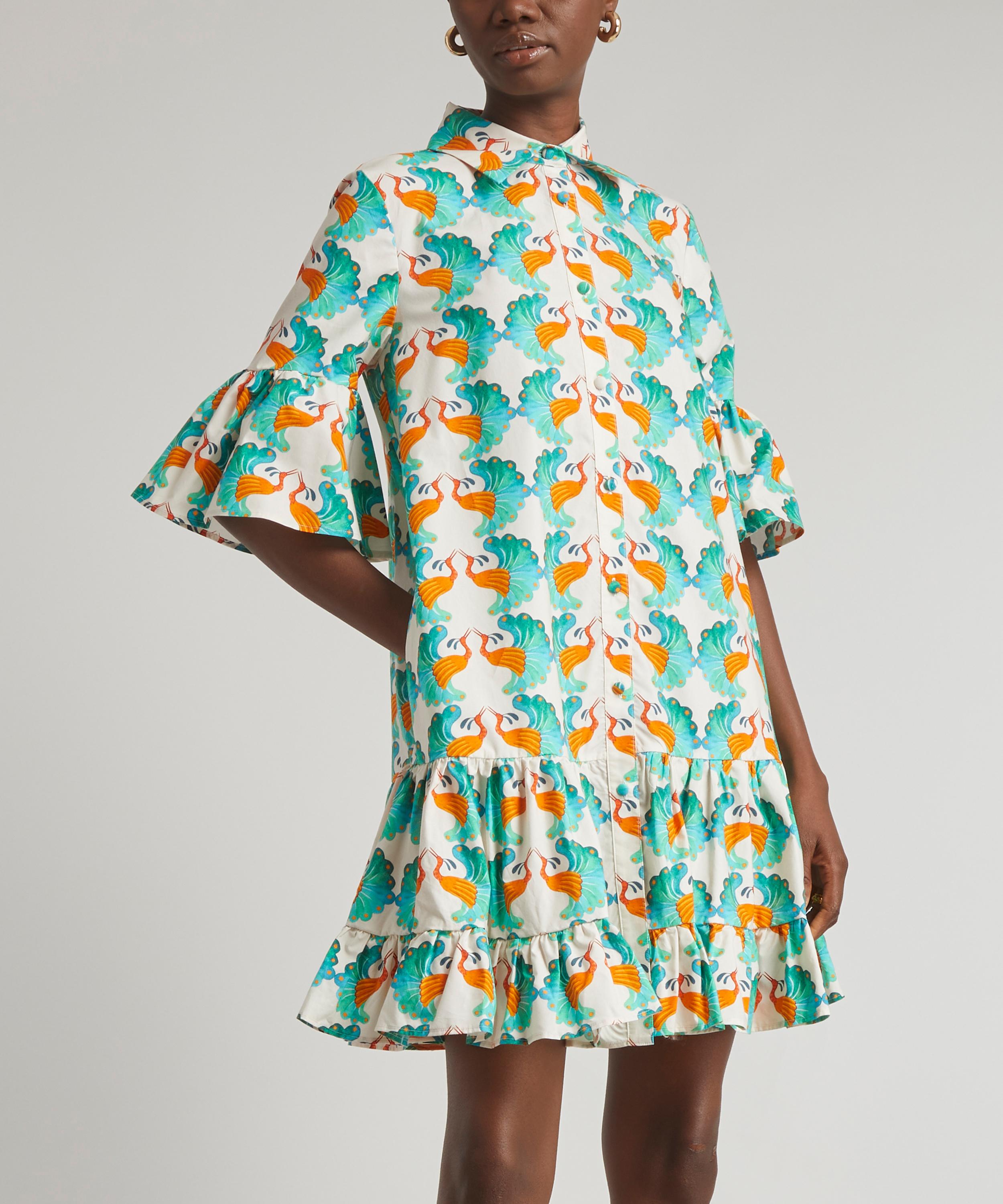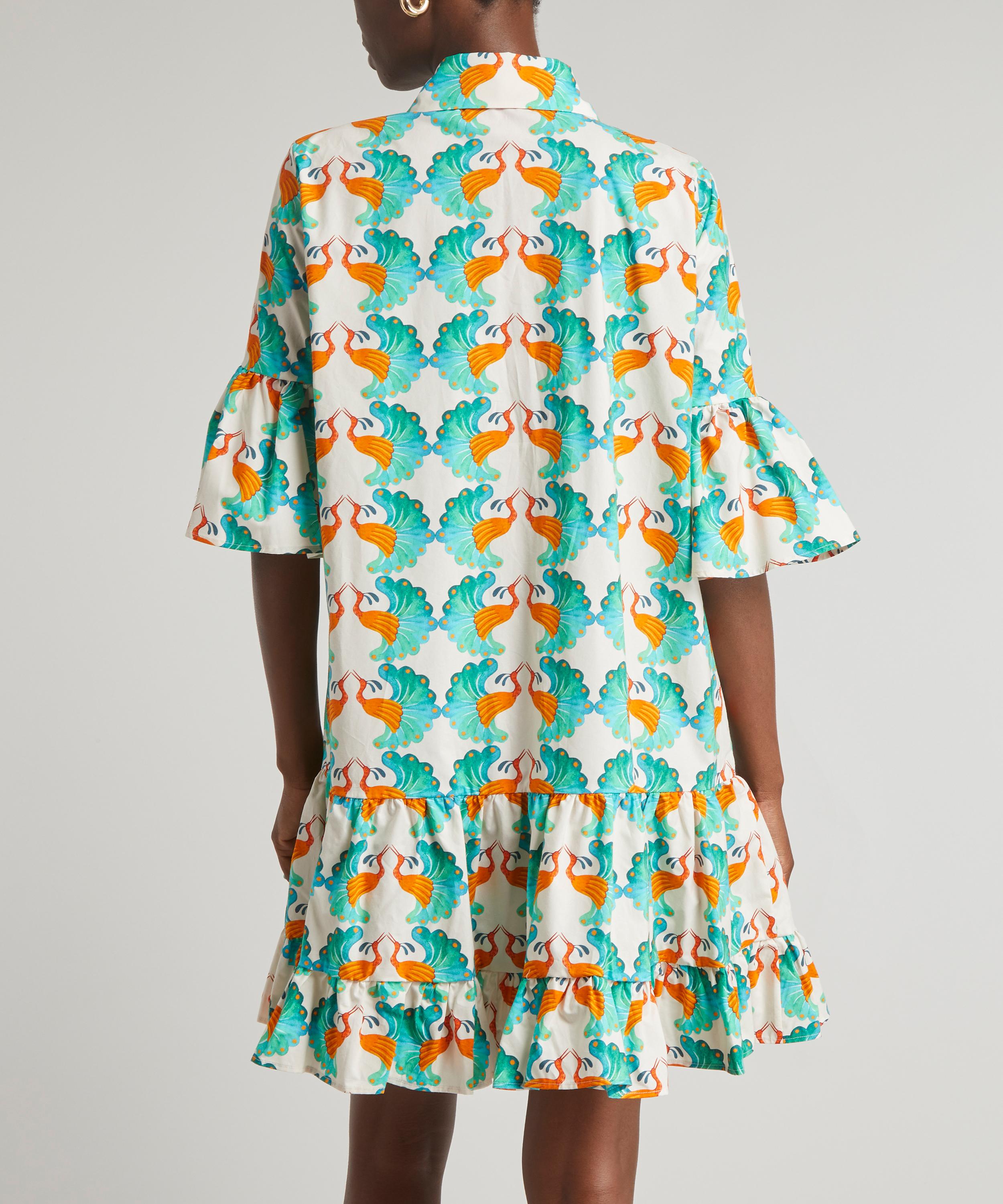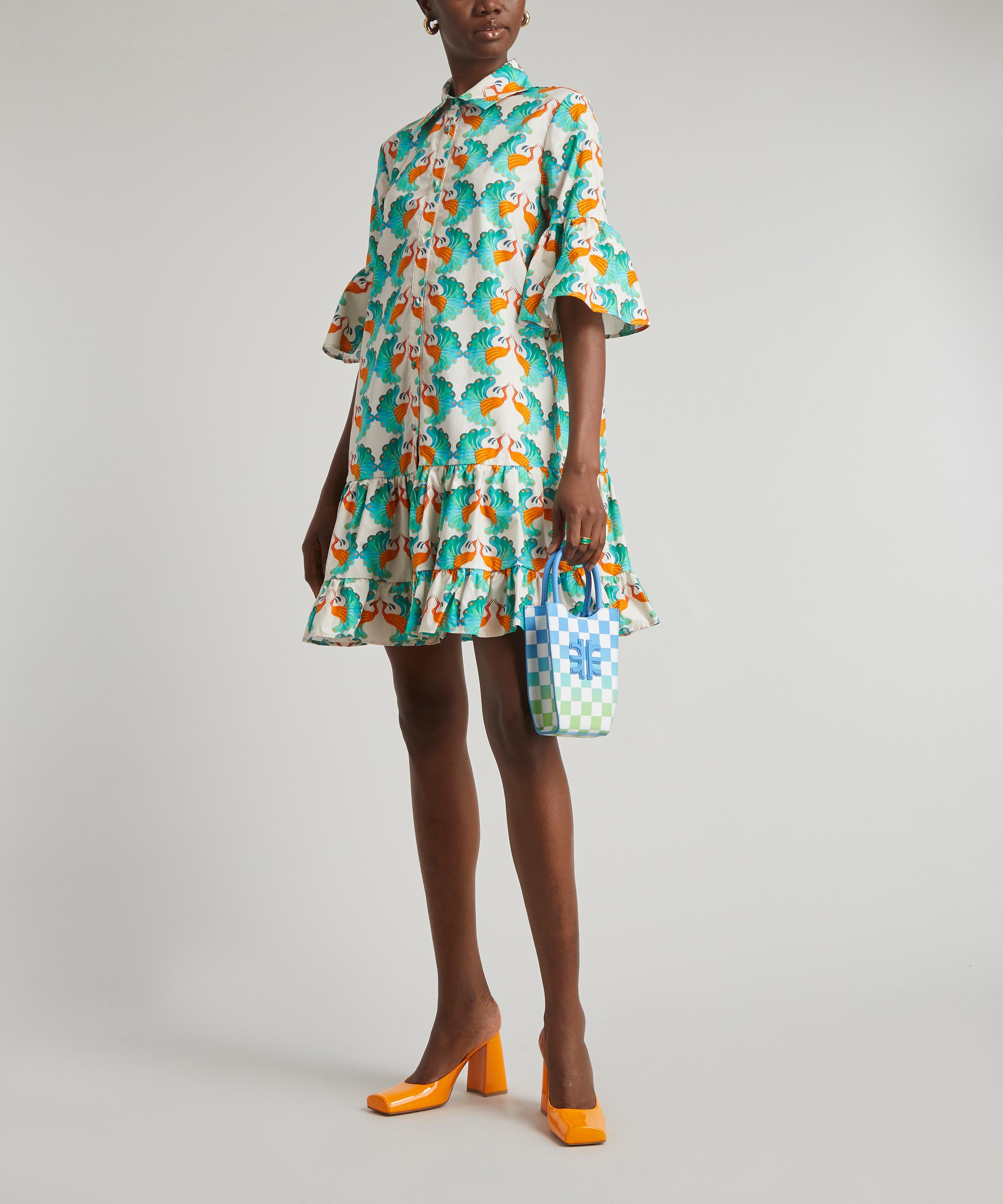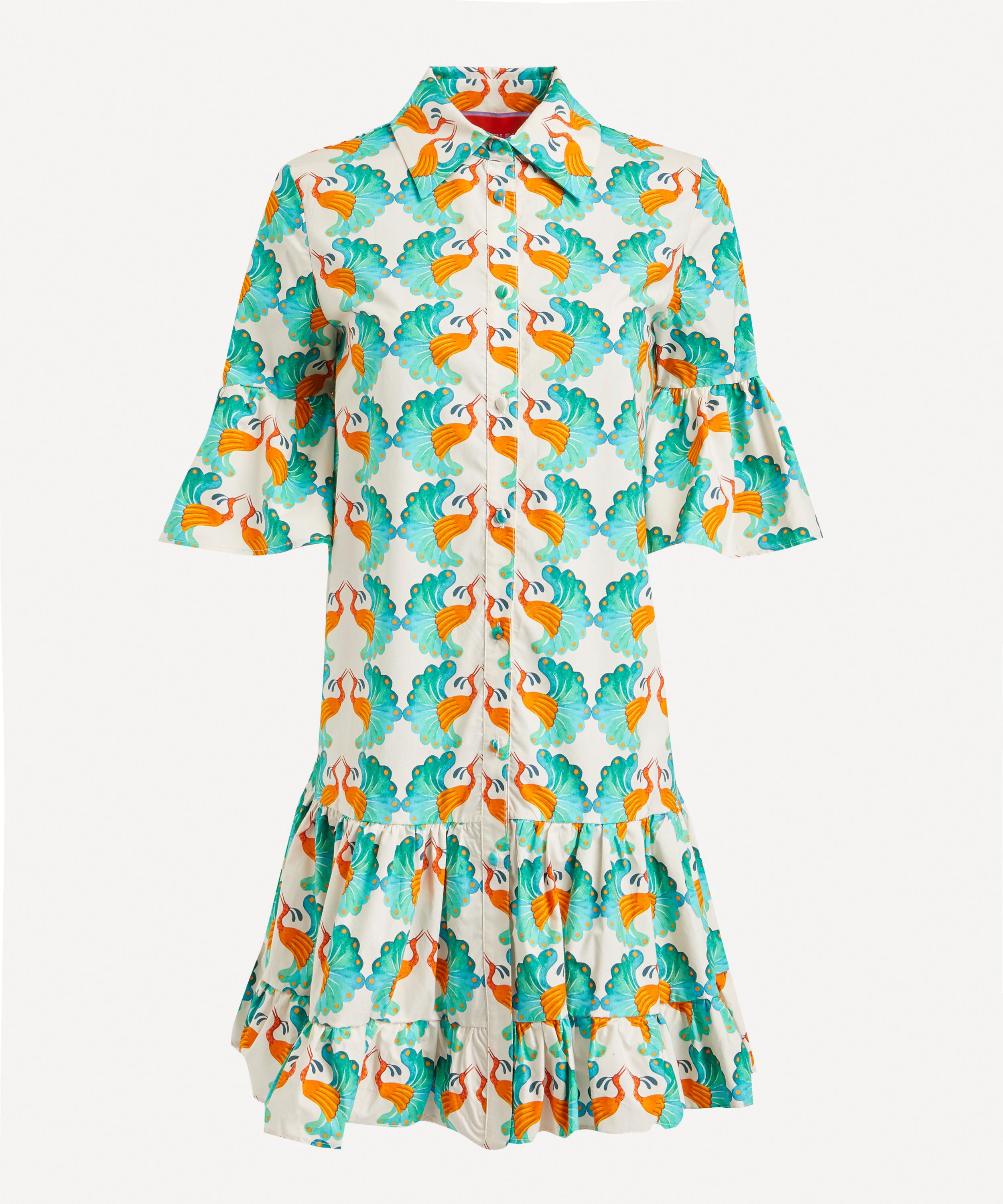 A mini shirt-dress with maximum impact, this fabulously fun style is sure to turn heads with its vibrant, kissing peacocks pattern. Crafted in Italy from smooth cotton poplin, the Choux dress is cut to an oversized fit with a dropped waist and a short, tiered skirt, complete with mid-length fluted sleeves, a classic point collar and a buttoned placket. We love it teamed with a pair of chunky orange mules for an eclectic finish.