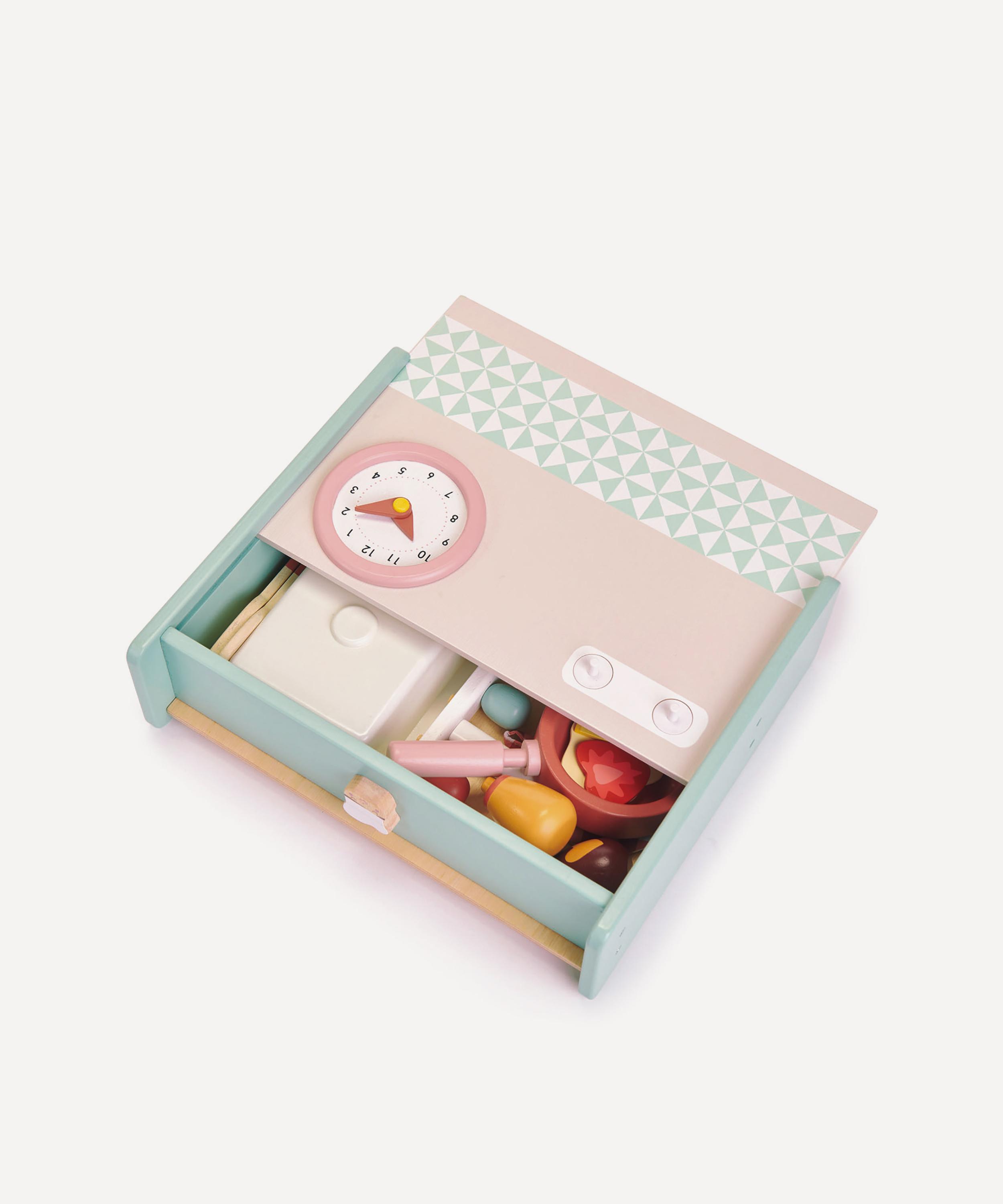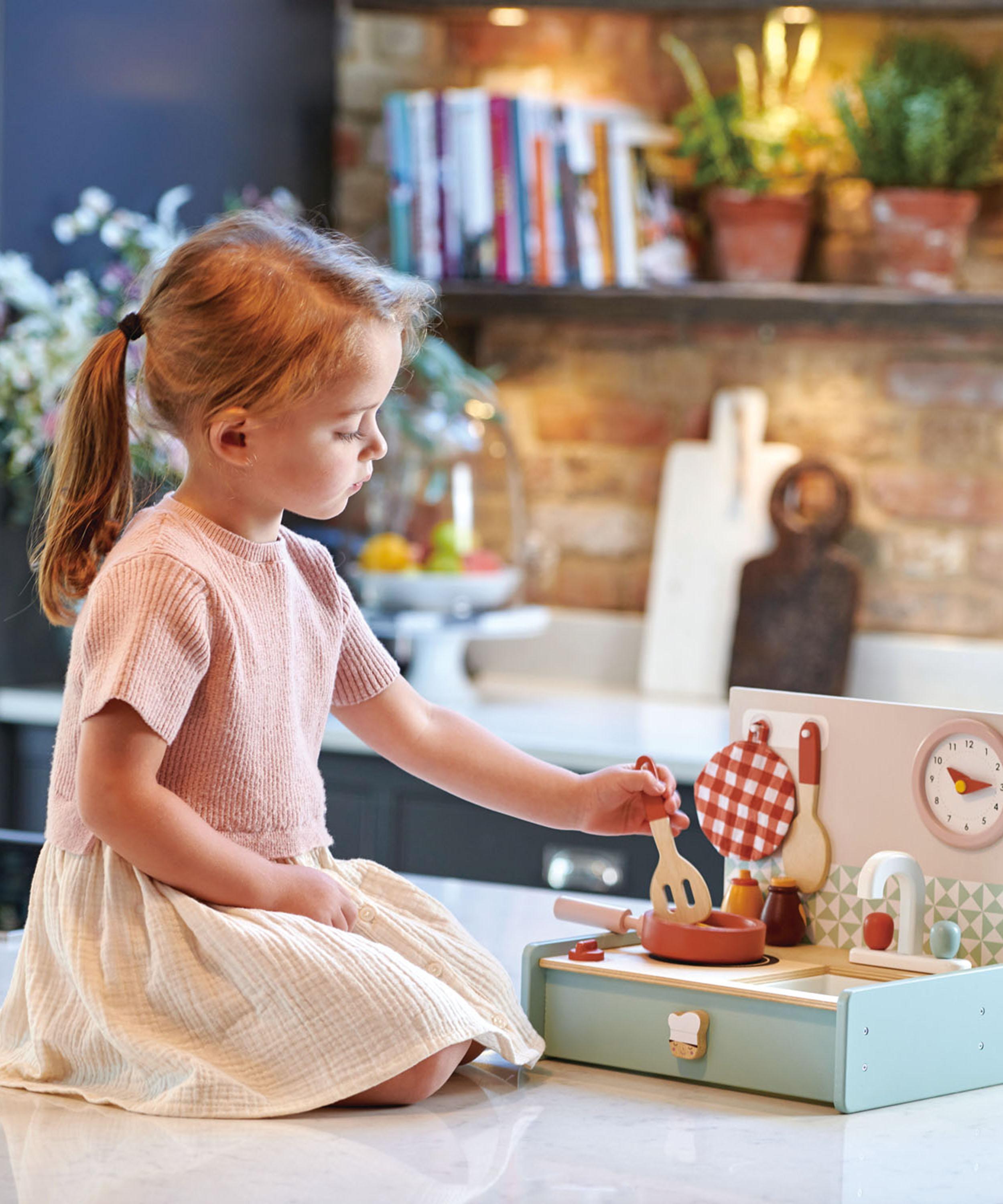 Crafted from smooth rubberwood, the kitchen range boasts a stylish stand-alone design that’ll take pride of place in any playroom. It features a panini toaster, milk jug and steamer spout plus pretend food, and original accessories including sugar cubes in a dish, coffee discs and a chocolate shaker, ready for perfecting a foamy cappuccino. With everything kids need to run their own trendy cafe, it’s a fun way to develop healthy habits, pretend play and sharing with friends.