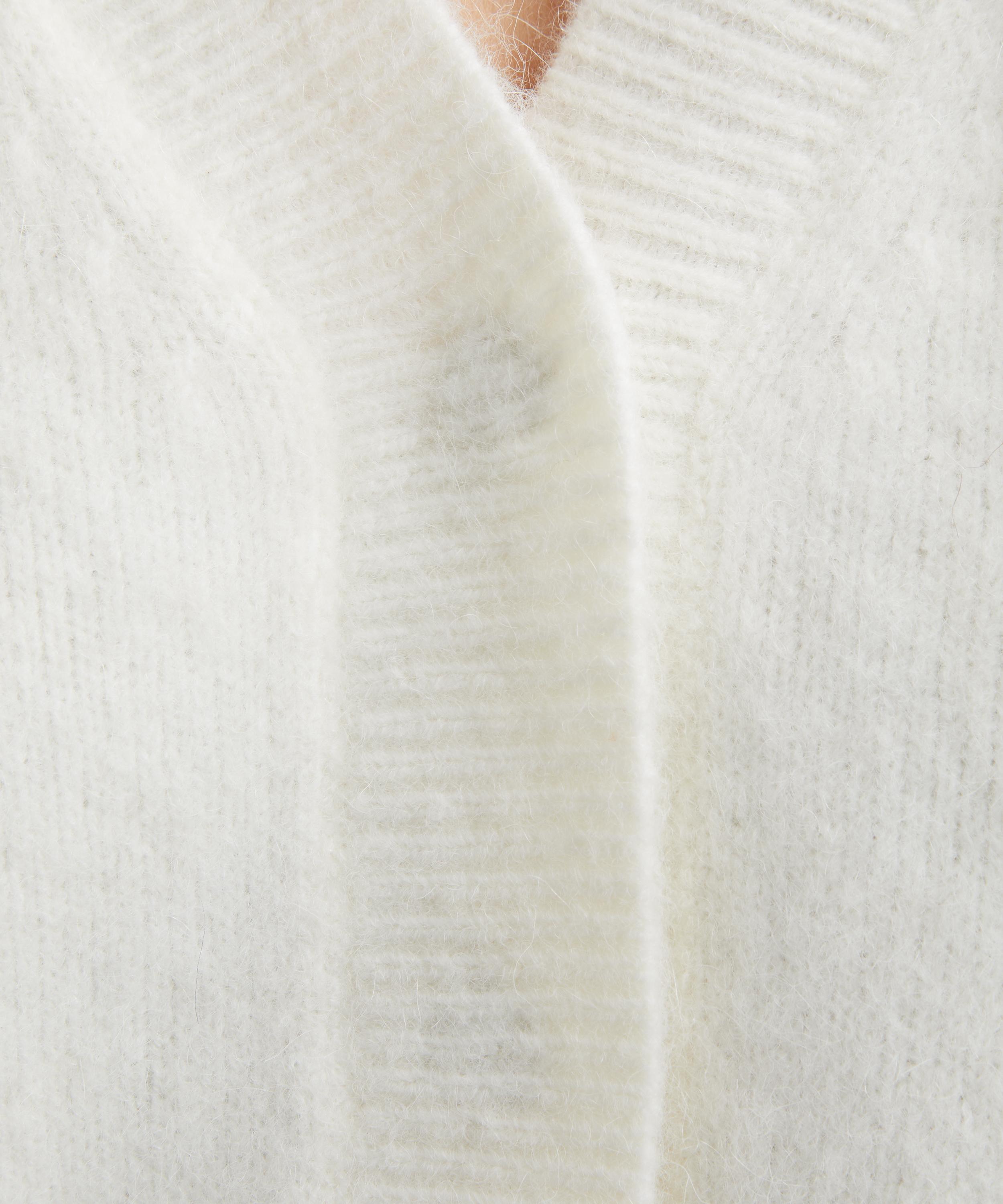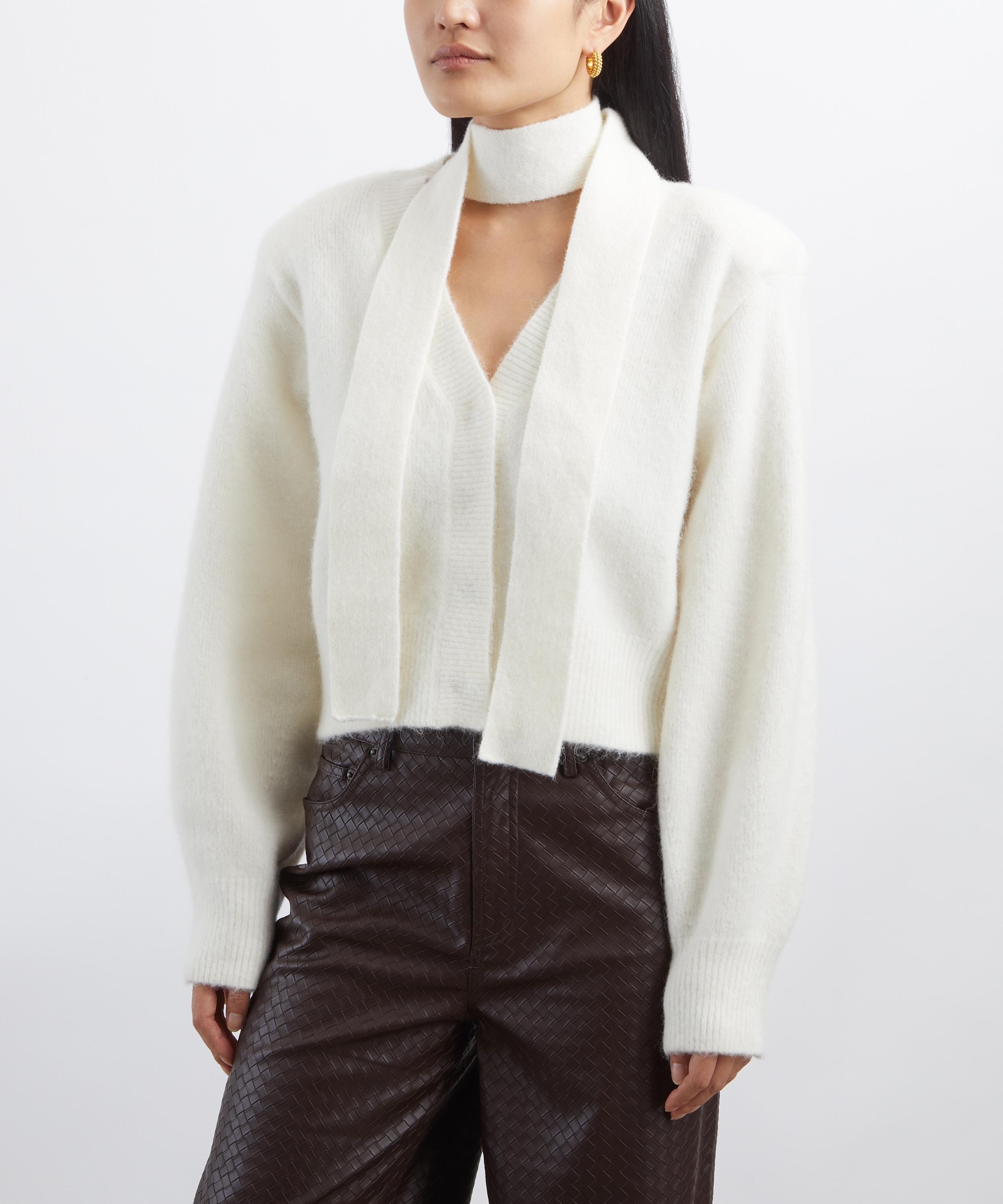 Spun from a luxuriously soft and fluffy alpaca-wool blend, this cropped cardigan is defined by its deep V-neckline detailed with a built-in scarf attached at the collar. It’s completed with subtly dropped shoulders and long sleeves for a relaxed finish.