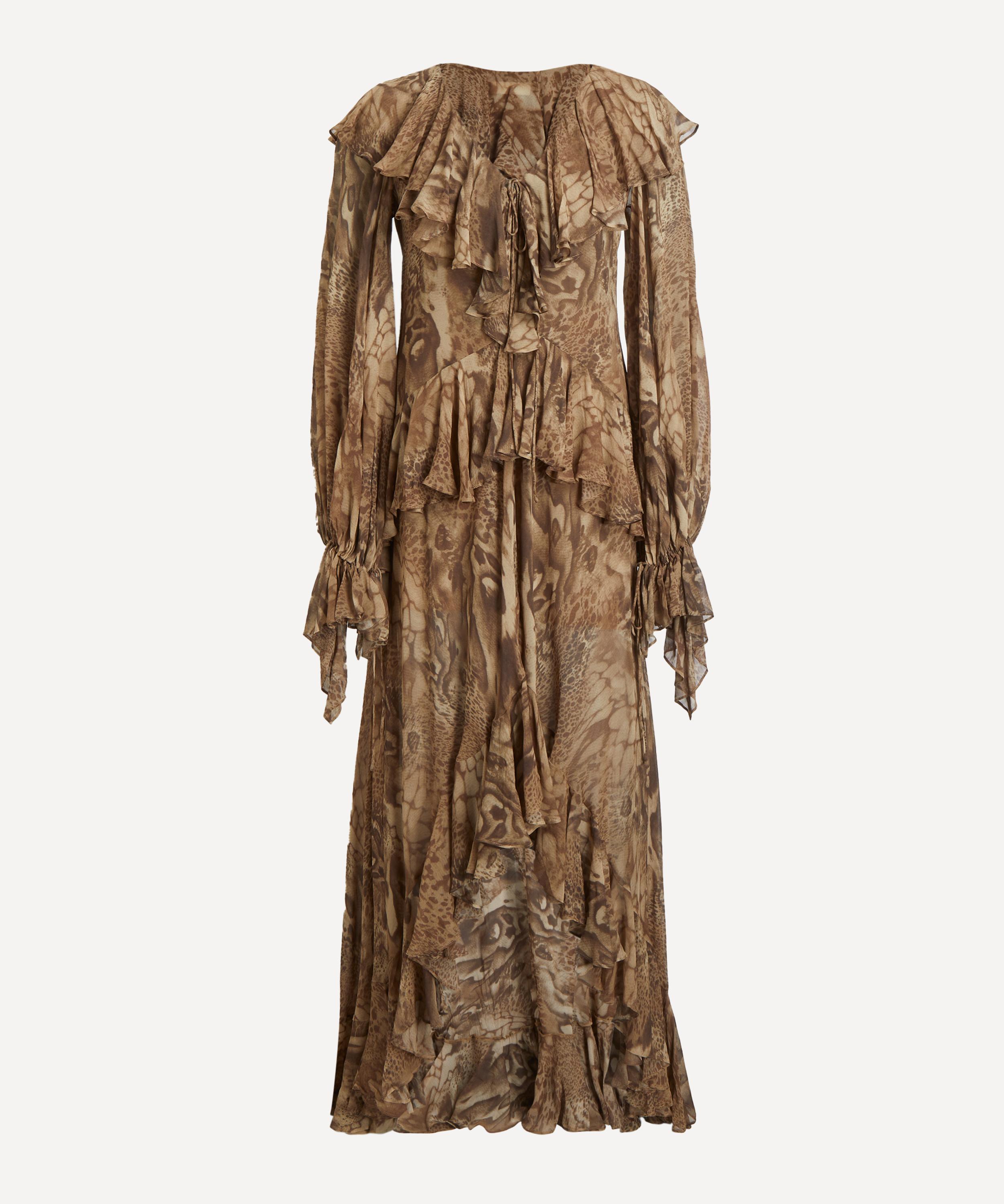 Cascading effortlessly, the dress is cut from a lightweight fabric that moves beautifully with the body, featuring a plunging V-neckline, billowing sleeves, and all-over ruffle detailing. Channel the island spirit with strappy sandals and layered jewellery for an effortlessly glamorous finish.