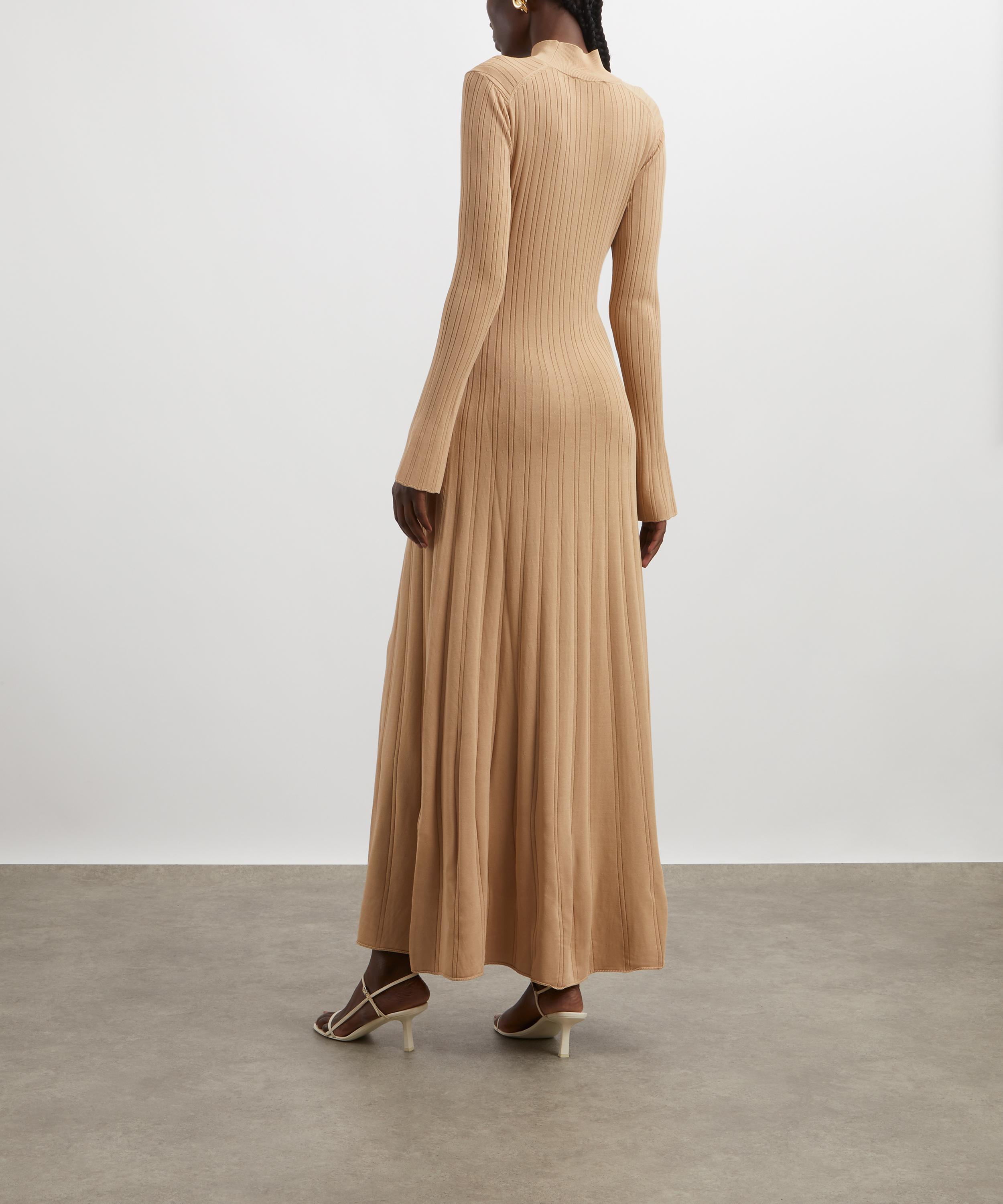 Finely knitted from a smooth viscose blend, this pleated dress features a form-fitting top that gracefully transitions into a flowing, ankle-length skirt, creating a flattering silhouette that balances structure and movement.