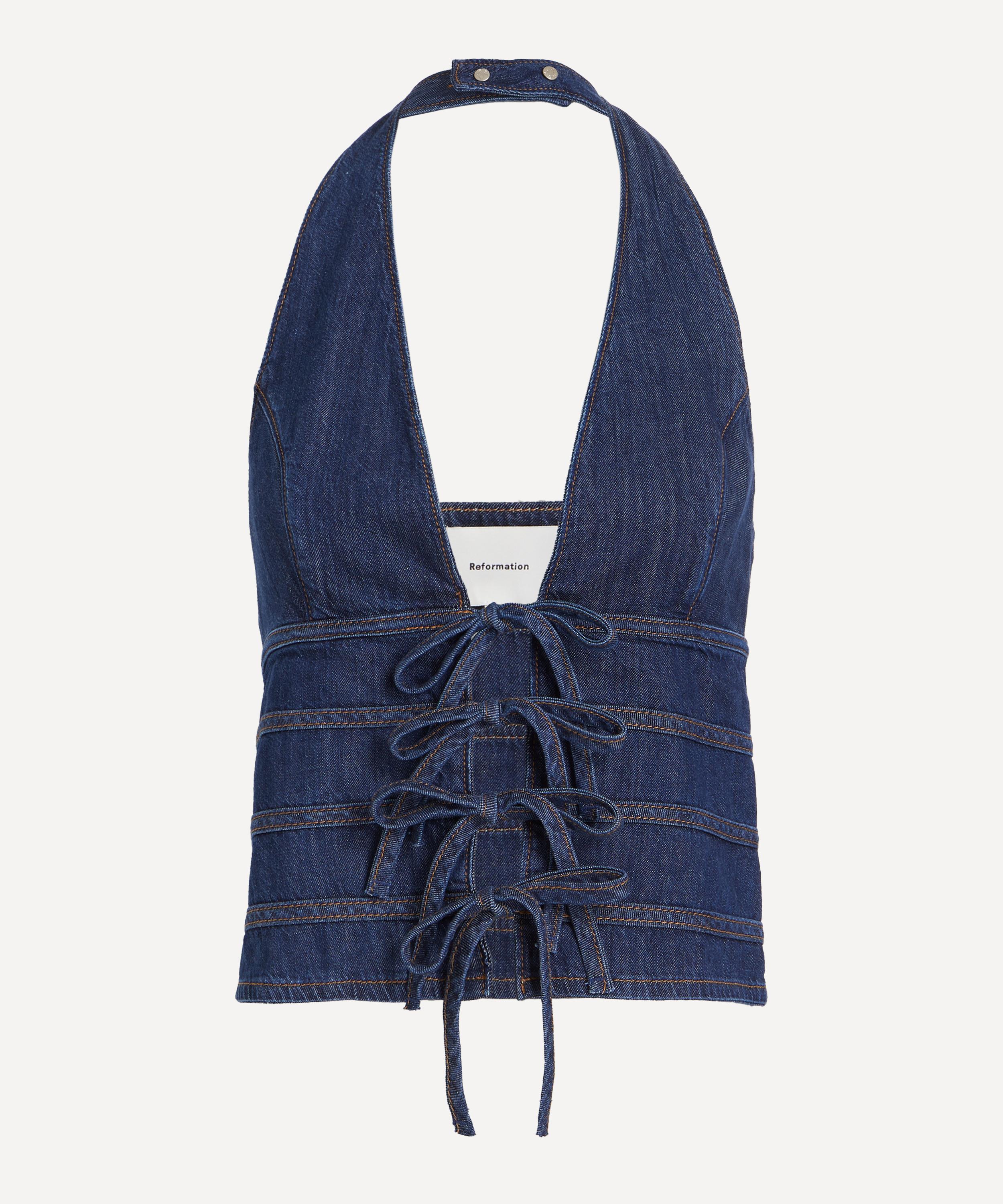 Look good and feel good in the Kyleigh Denim Halter Top from cult LA label Reformation, where effortless style meets conscious design.