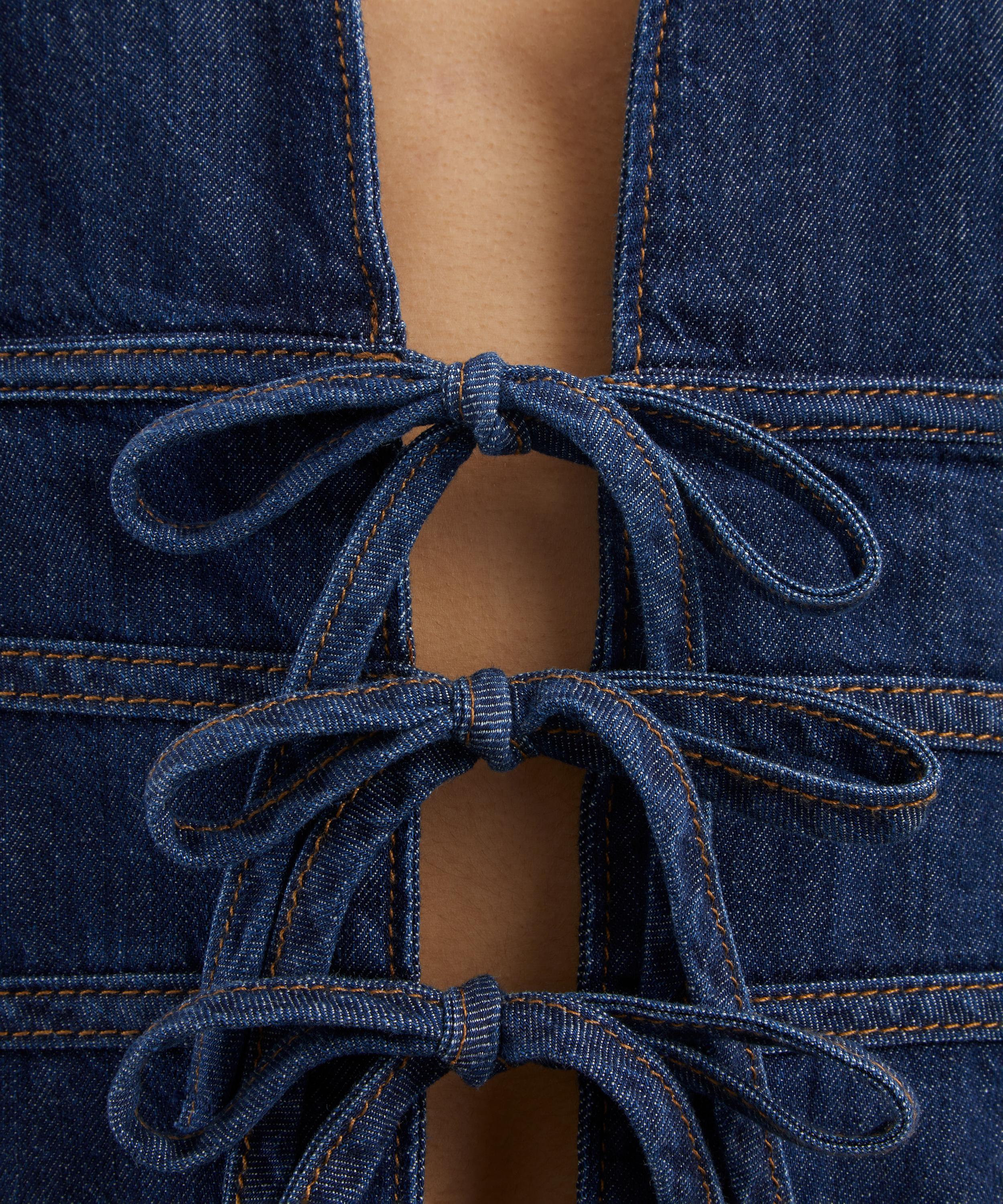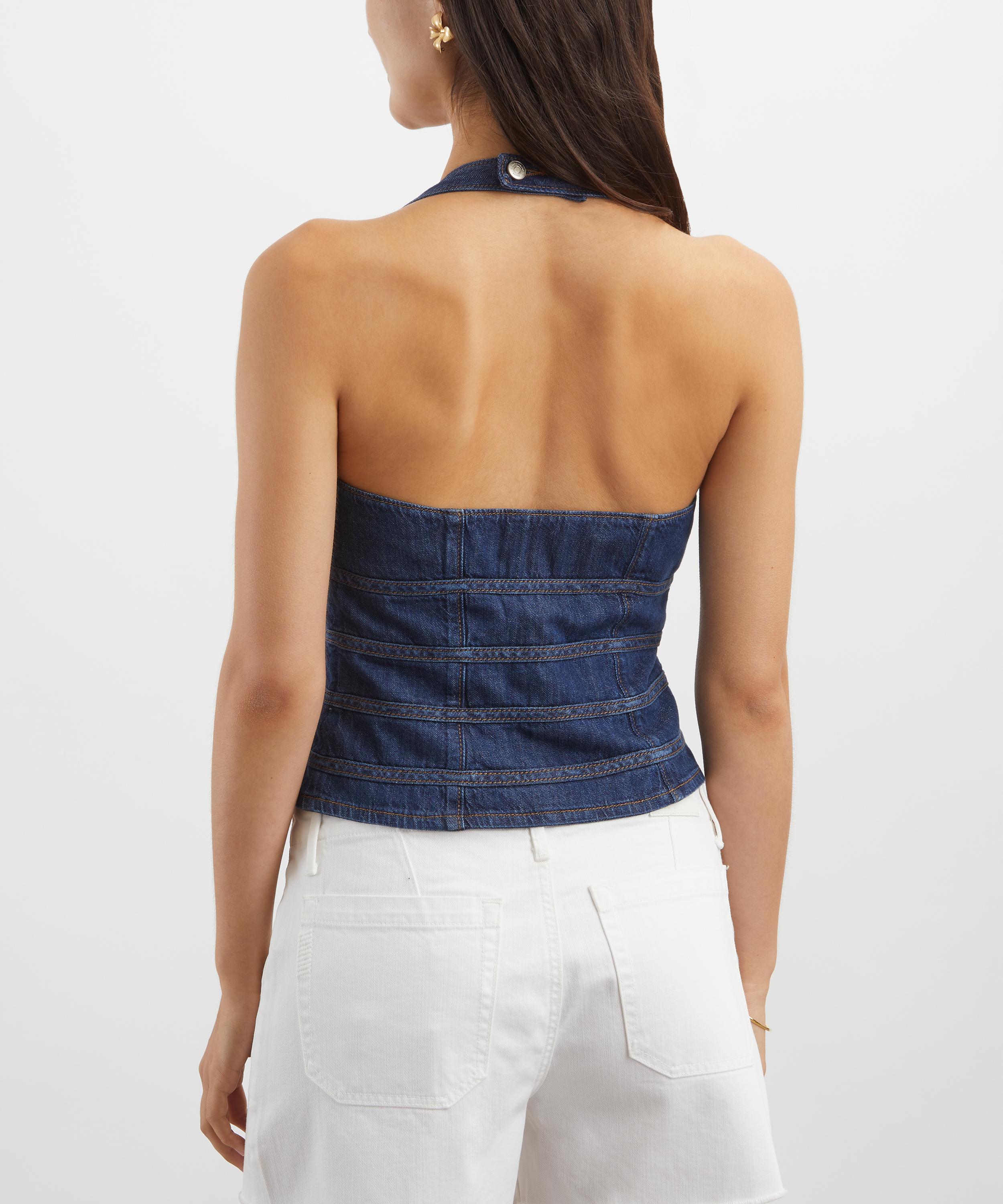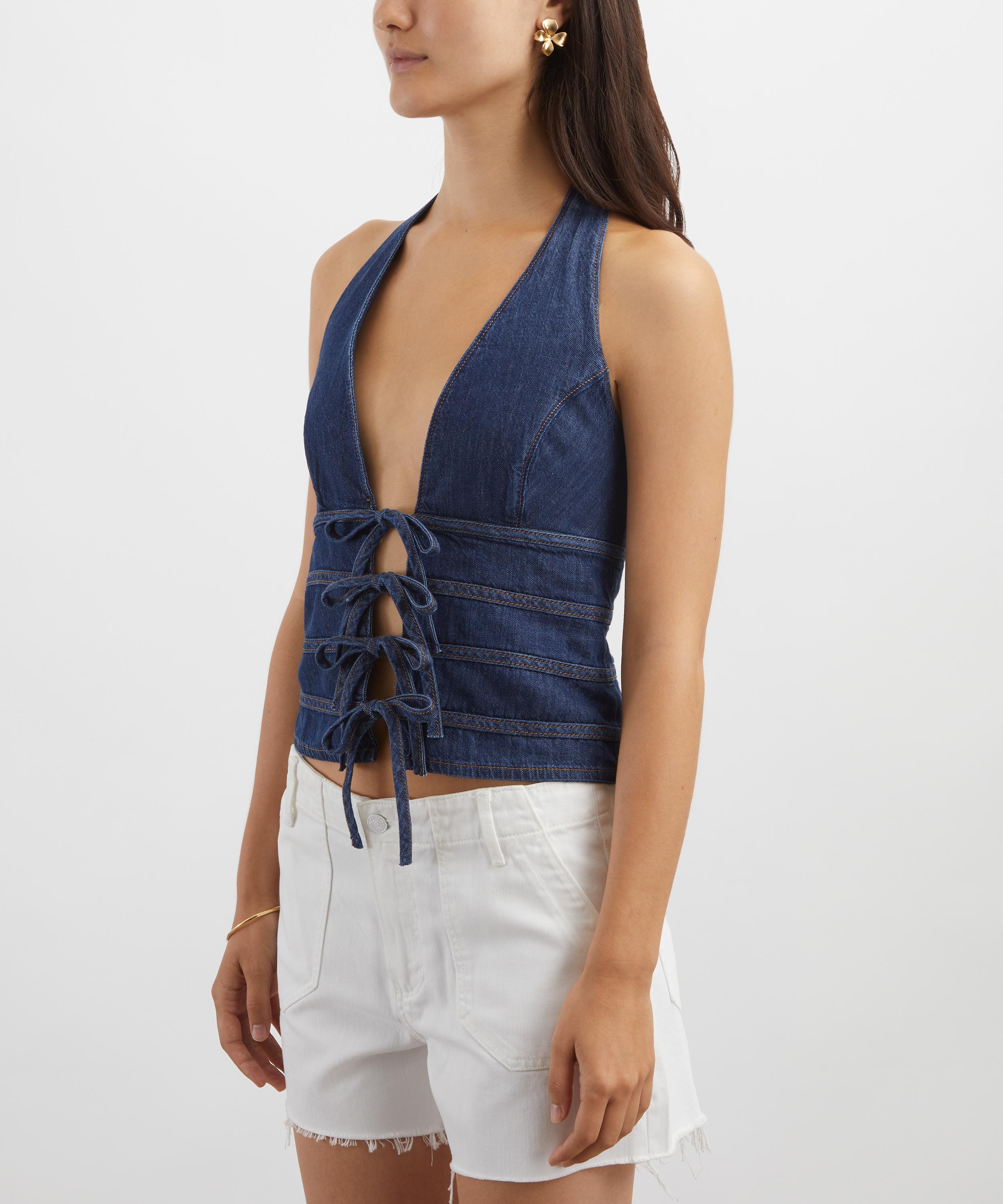 Crafted from non-stretch denim, this fitted top features a halter neckline and a plunging V-neck secured with four ties - adding a playful, sensuous touch to its structured silhouette.