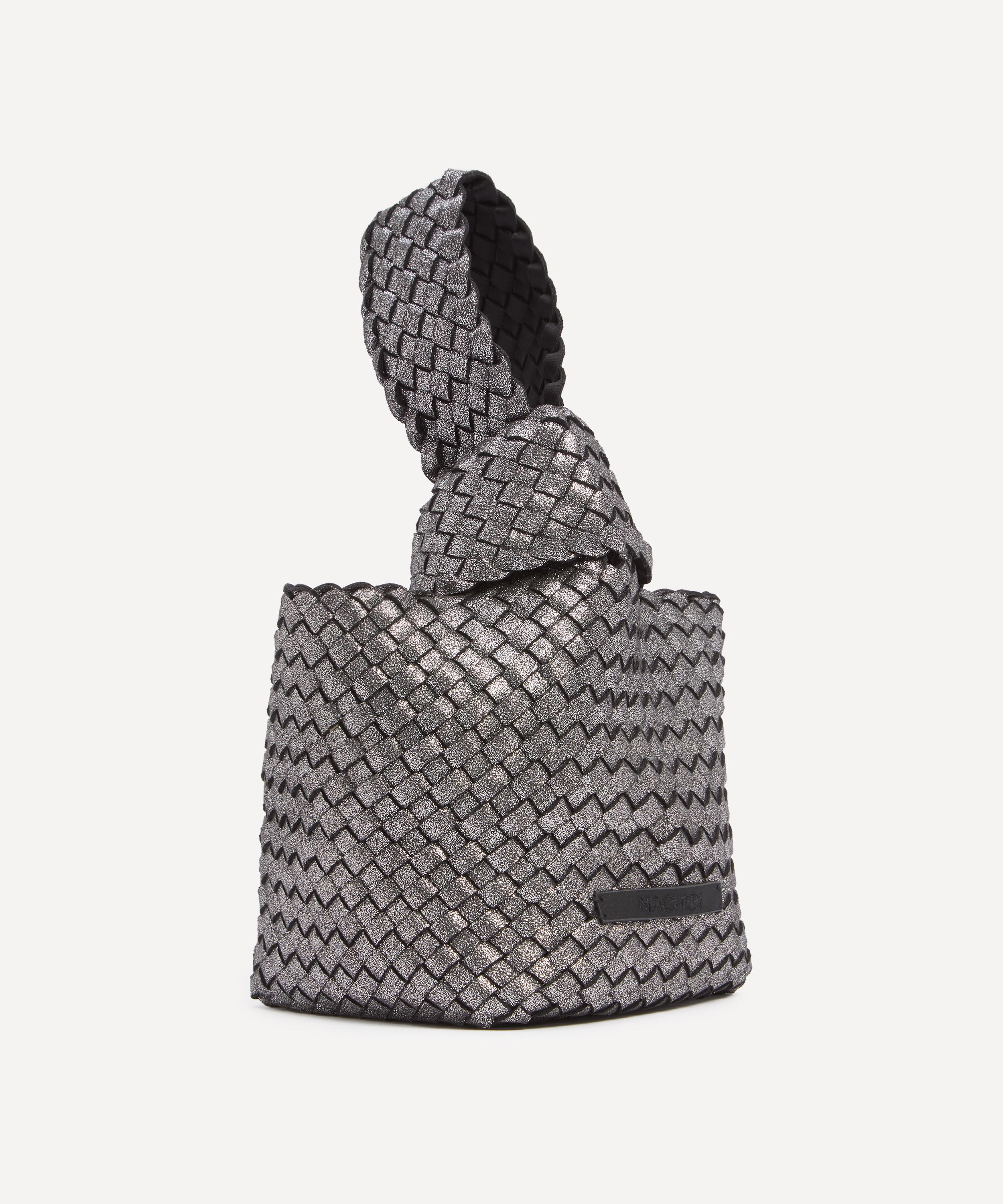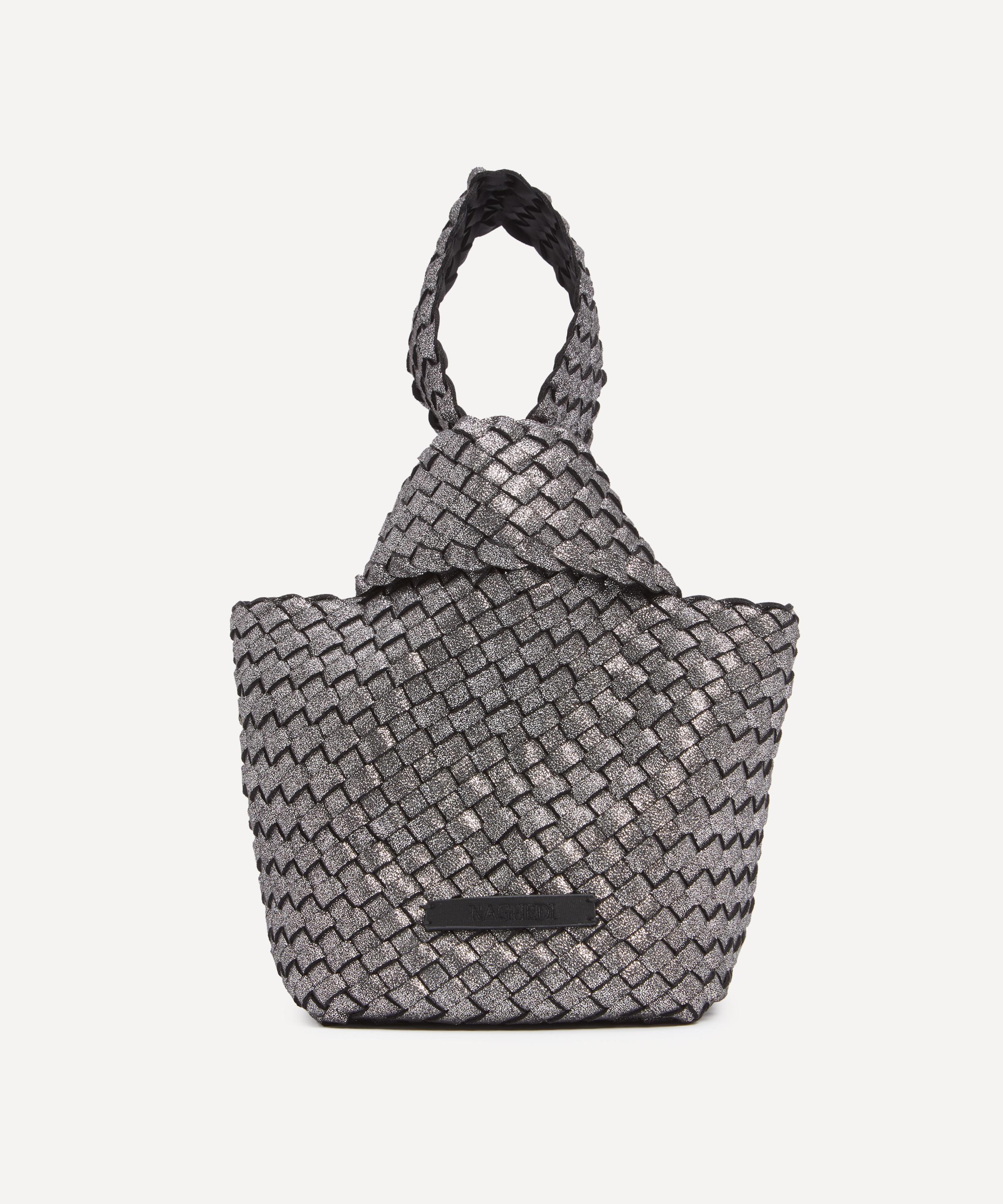 Crafted from neoprene fused with metallic shine, this stylish bag features an open top, secured with a slide-through loop closure, and is complete with a single top handle – a chic, compact design, it is perfect for day-to-night styling or as a daily companion for busy city life.
