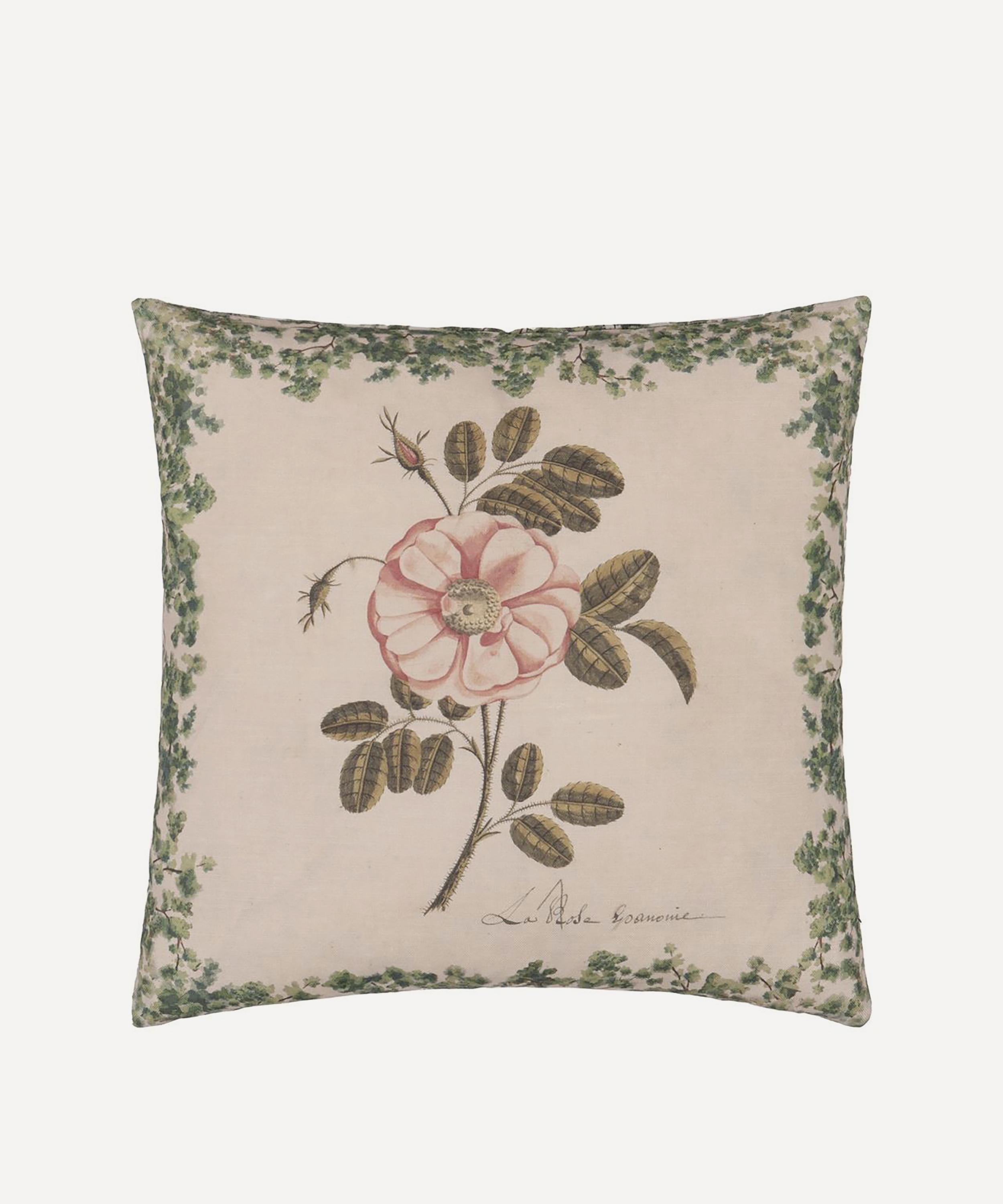 Digitally printed onto a luxe textured cotton this cushion features striking large scale botanical rose framed by graphic leaves and bordered with trees and branches. Finished with foliage to the reverse, style on a daybed or armchair to effortlessly elevate your soft furnishings.