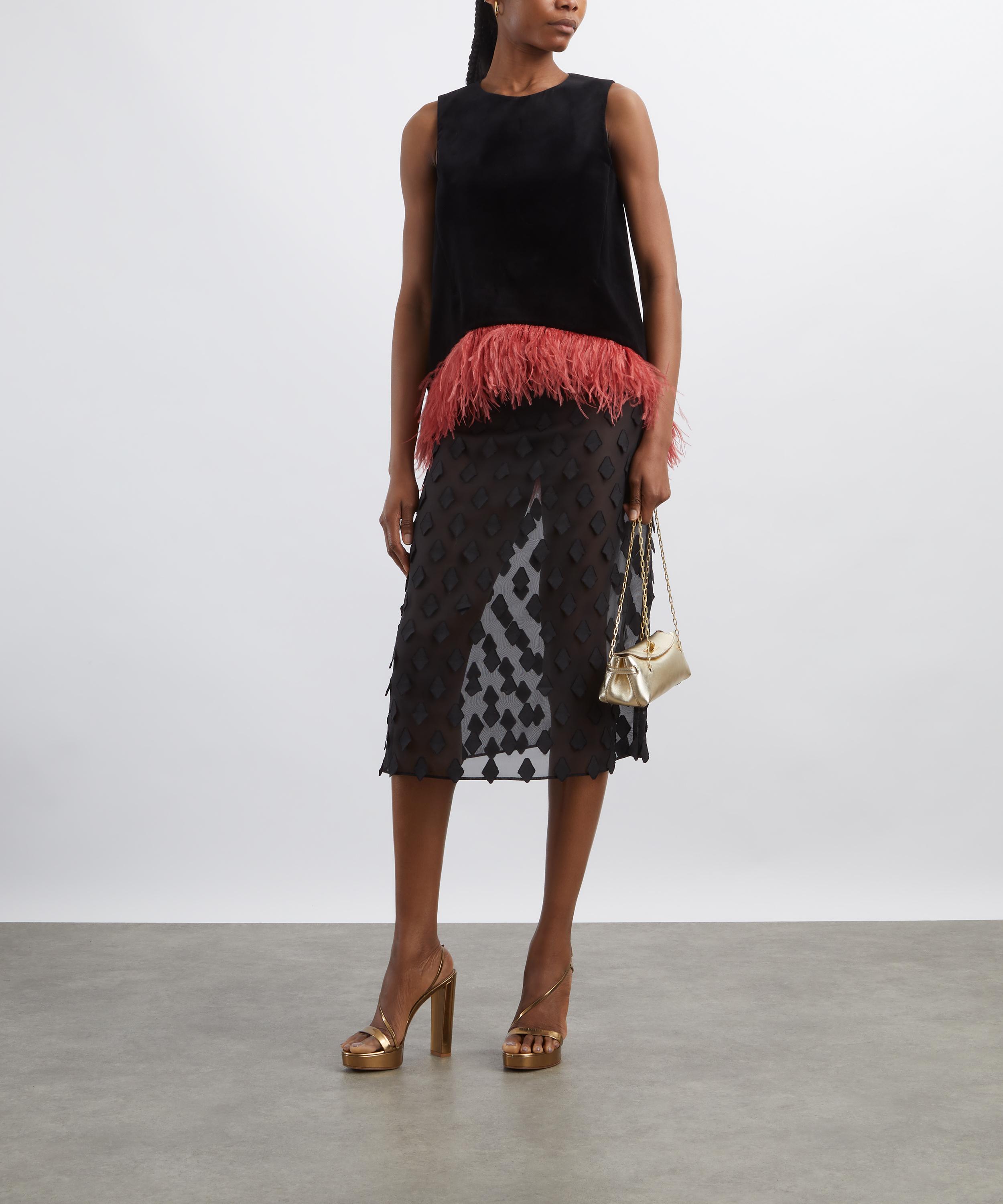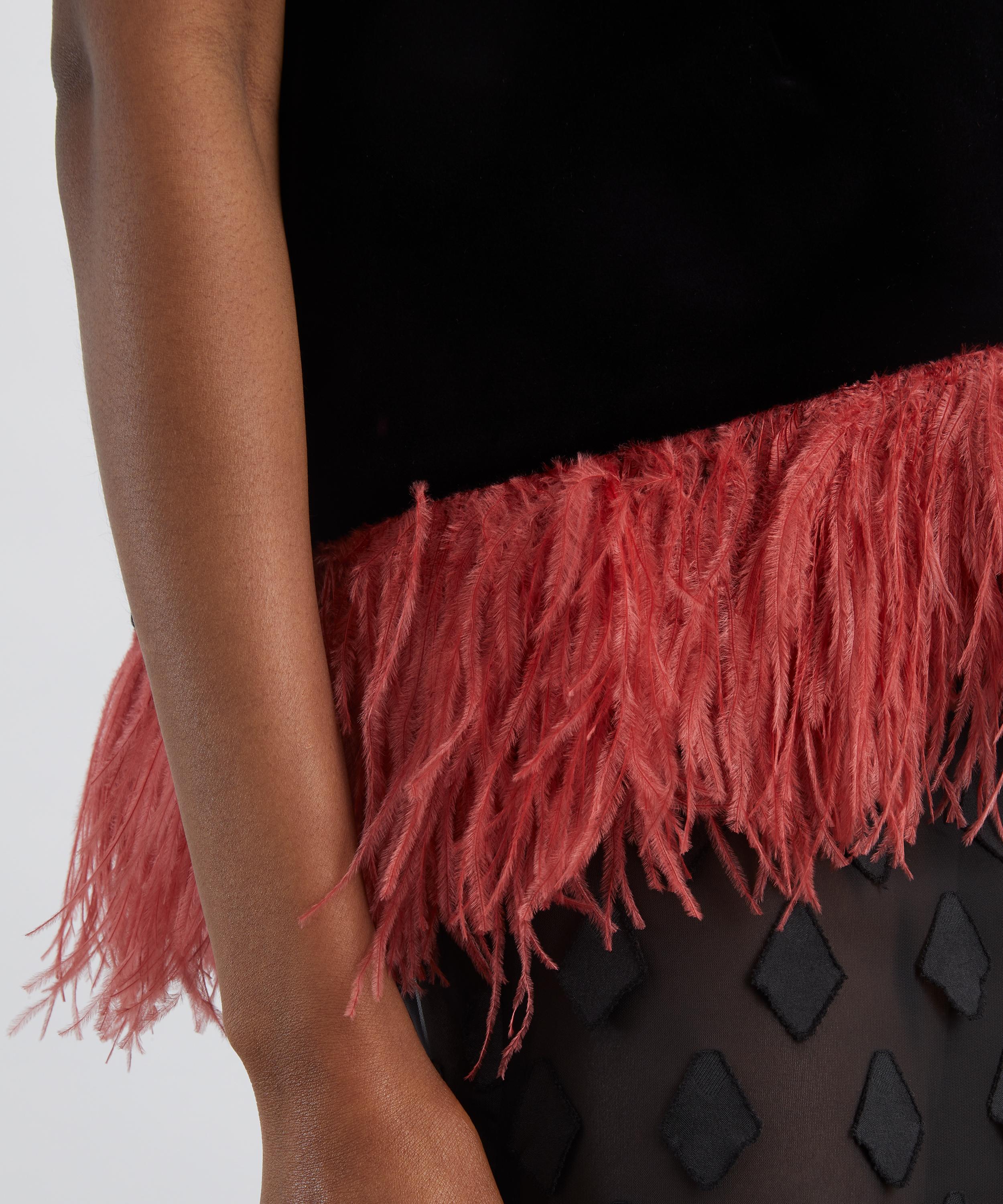 In sumptuous black velvet, La Scala balances a flattering trapeze silhouette with an asymmetric hemline, finished with flouncy coral-pink marabou feather trims for a flamboyant touch of glamour.