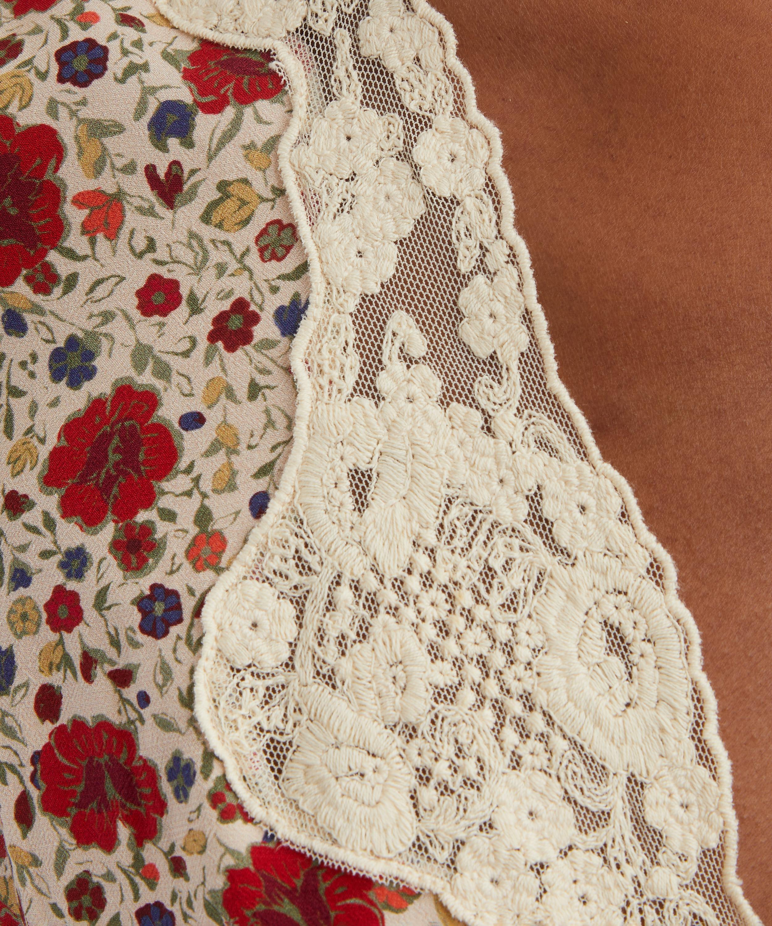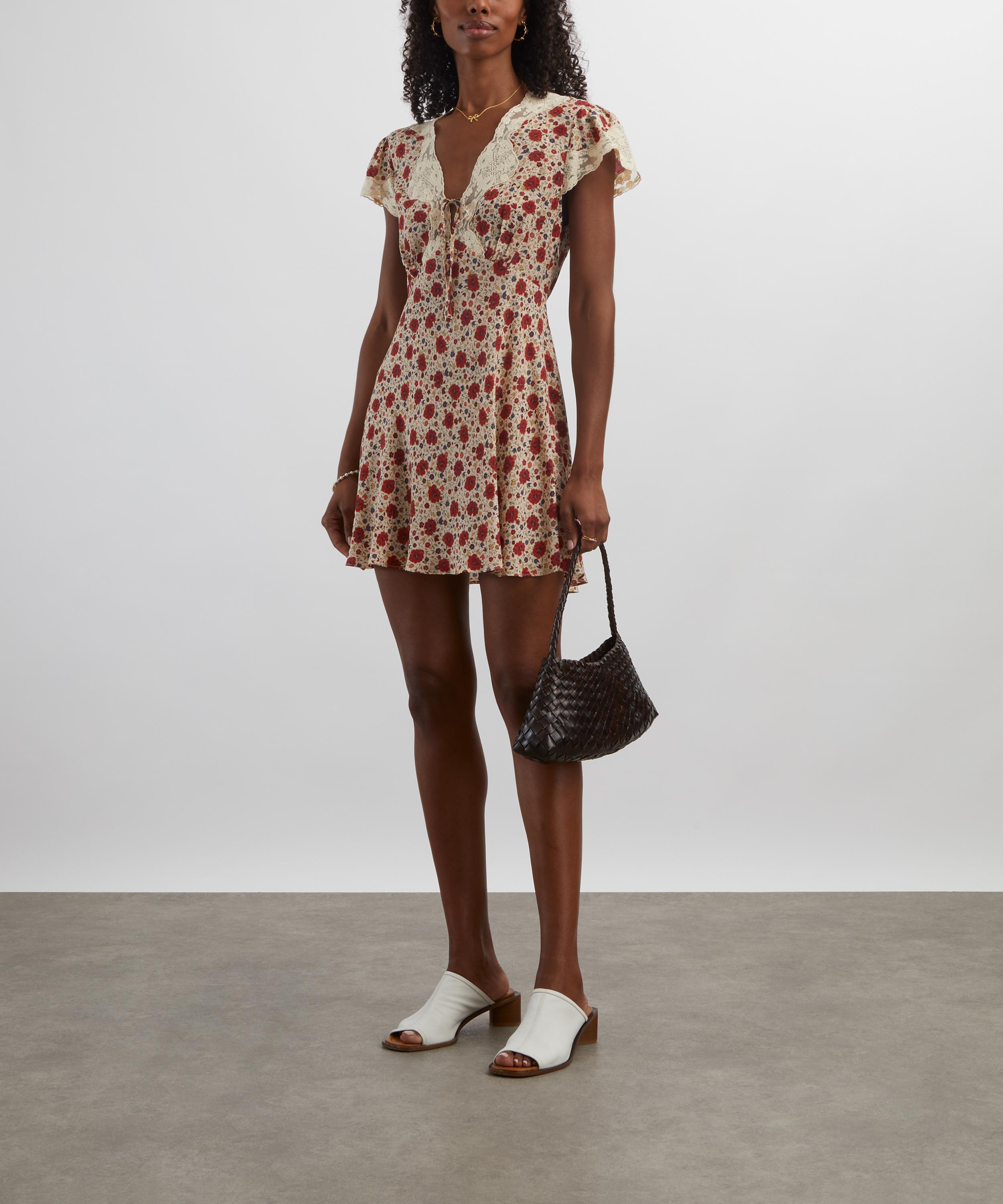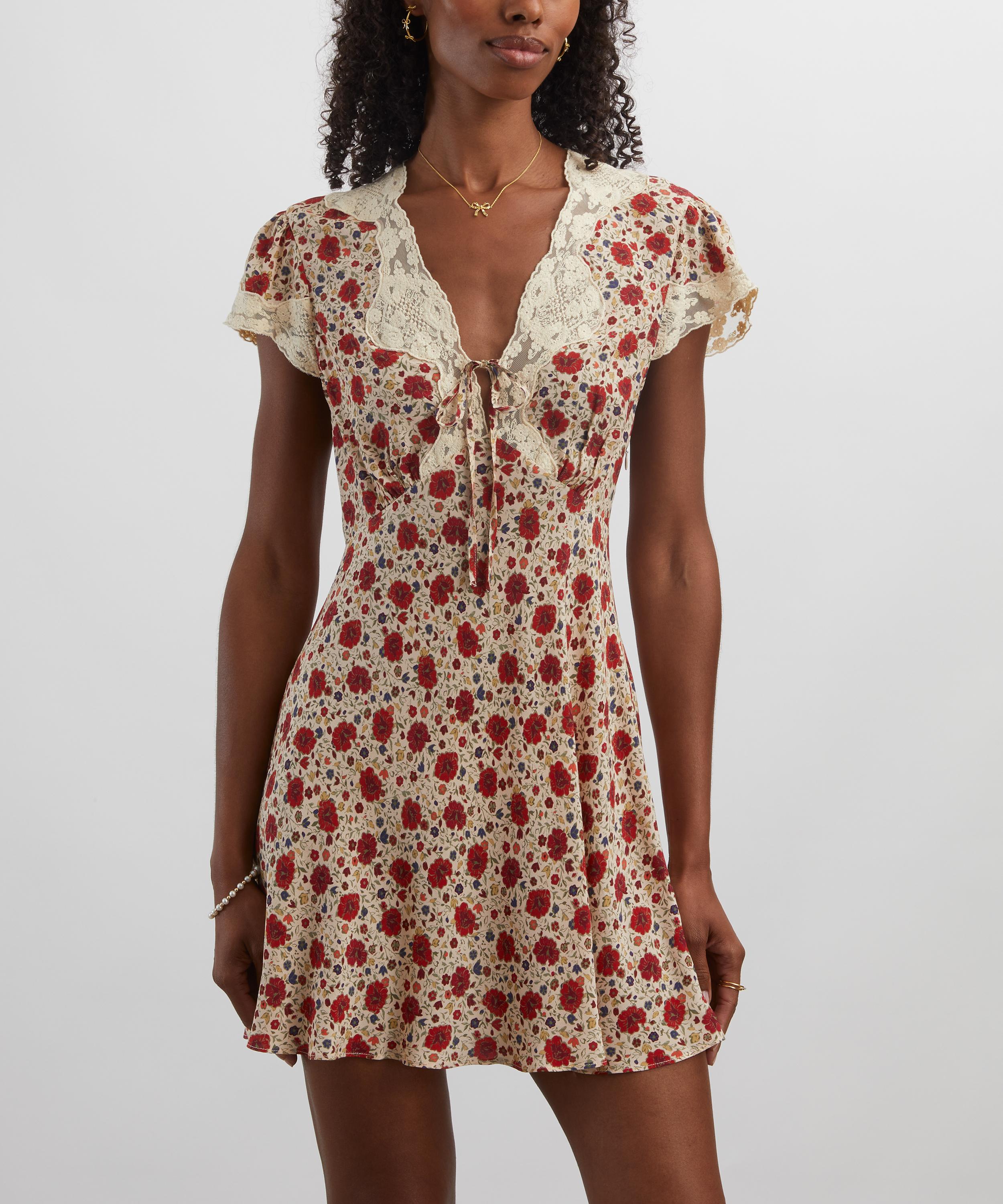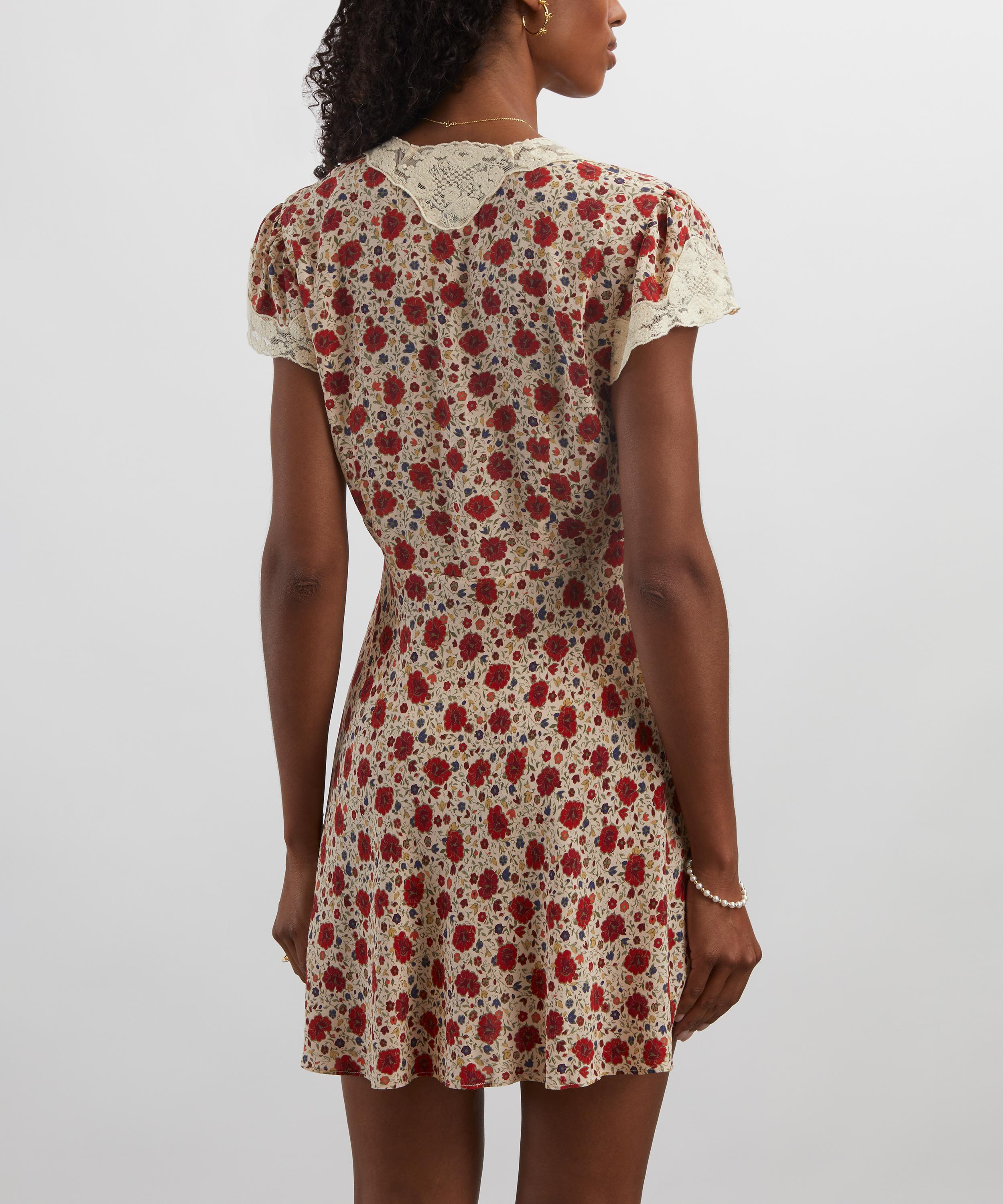 Crafted from lightweight crepe and adorned with a vintage-inspired floral print, this mini dress embodies effortless elegance. A classic V-neckline, short cap sleeves, and delicate lace trims lend a romantic, timeless charm, making it perfect for both sunlit days and graceful evenings.