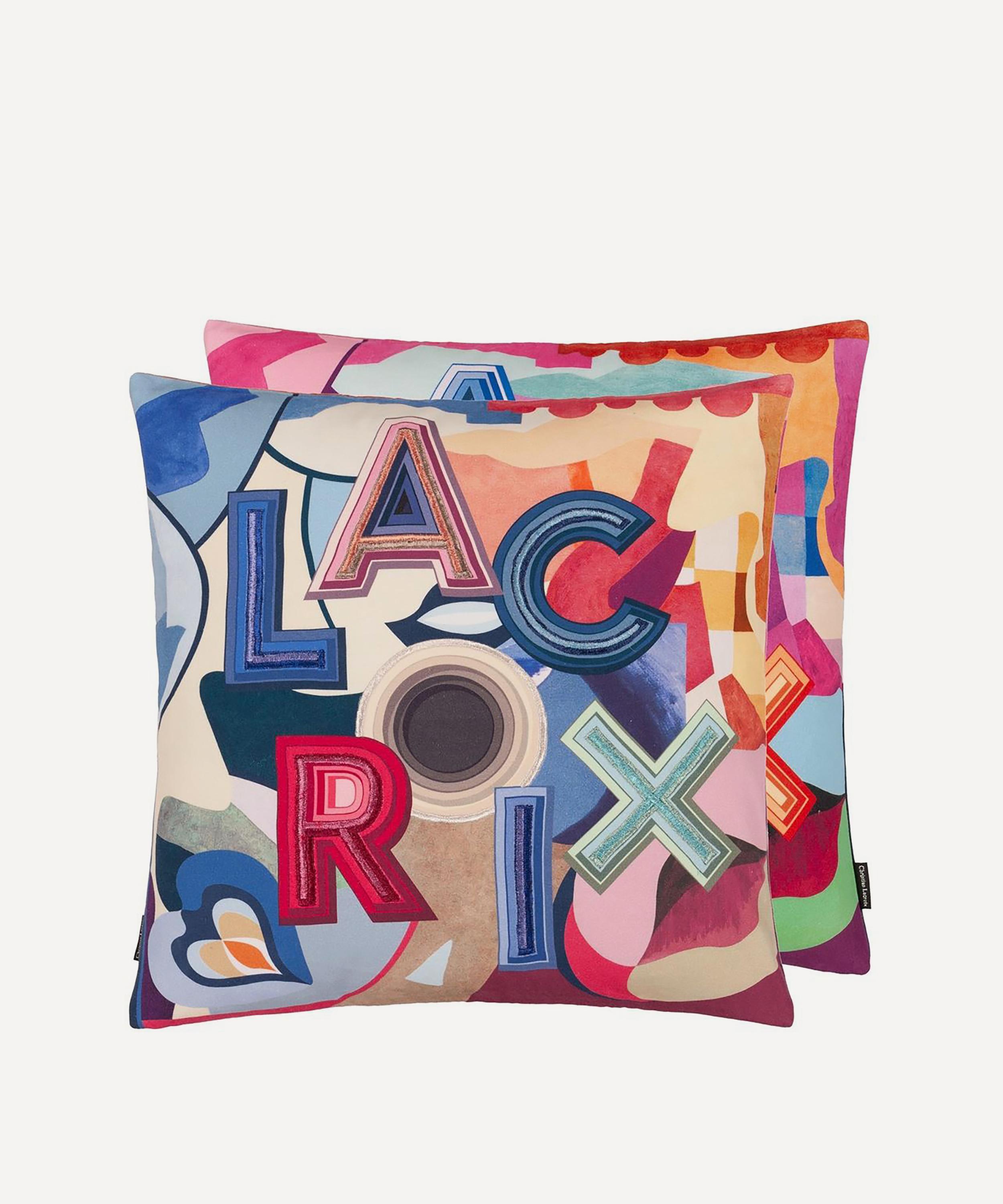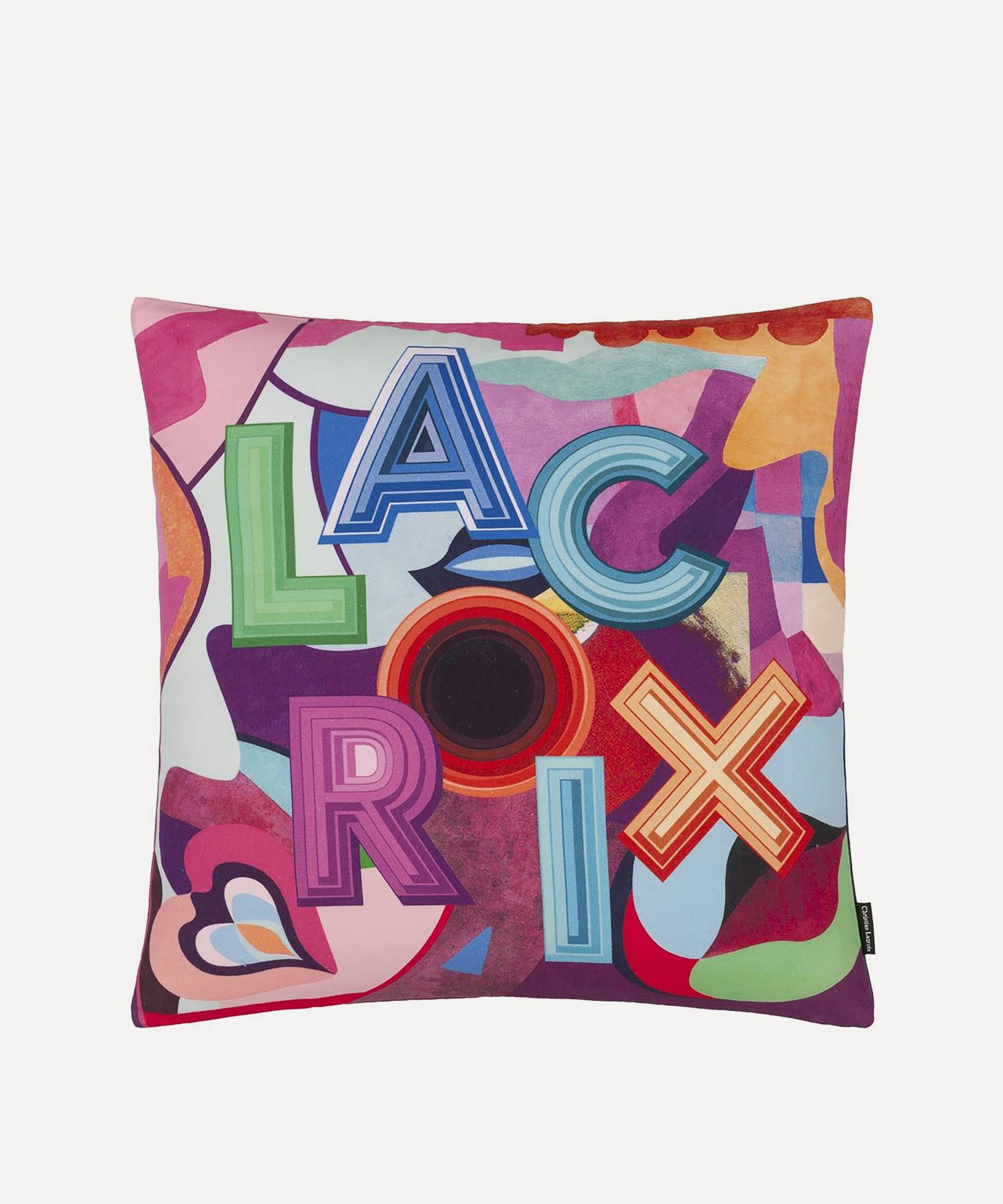 Spotlighting a contemporary geometric pattern to the front, this cushion is digitally printed with bright and bold Lacroix letters enhanced with embroidered detailing. With a softer tones to the reverse, style with block colours to enhance the vibrant design.