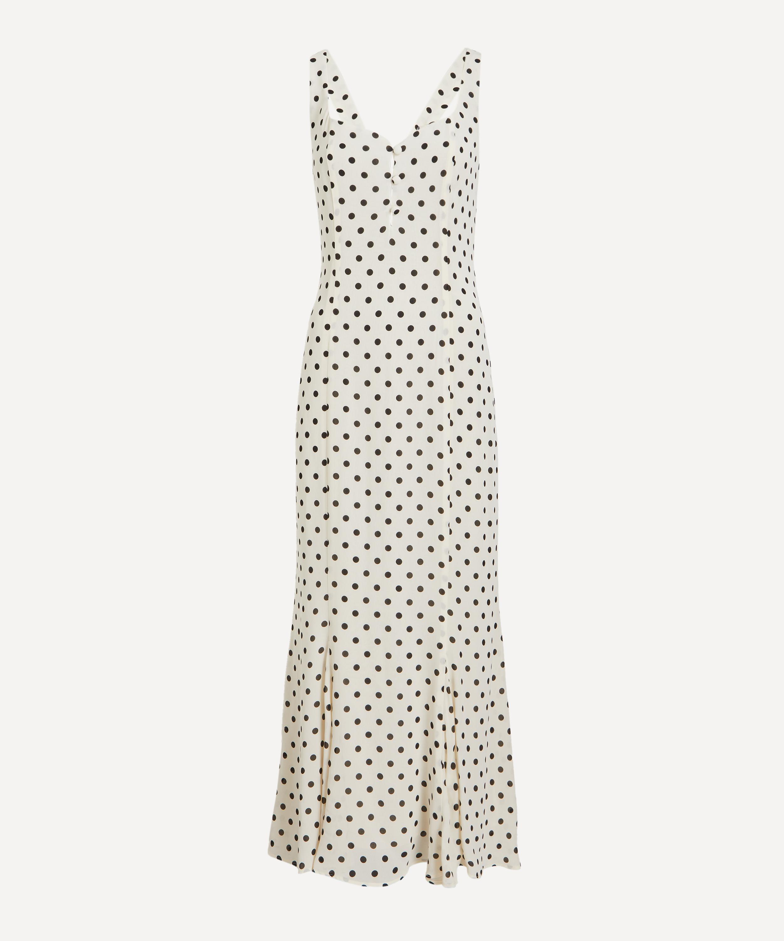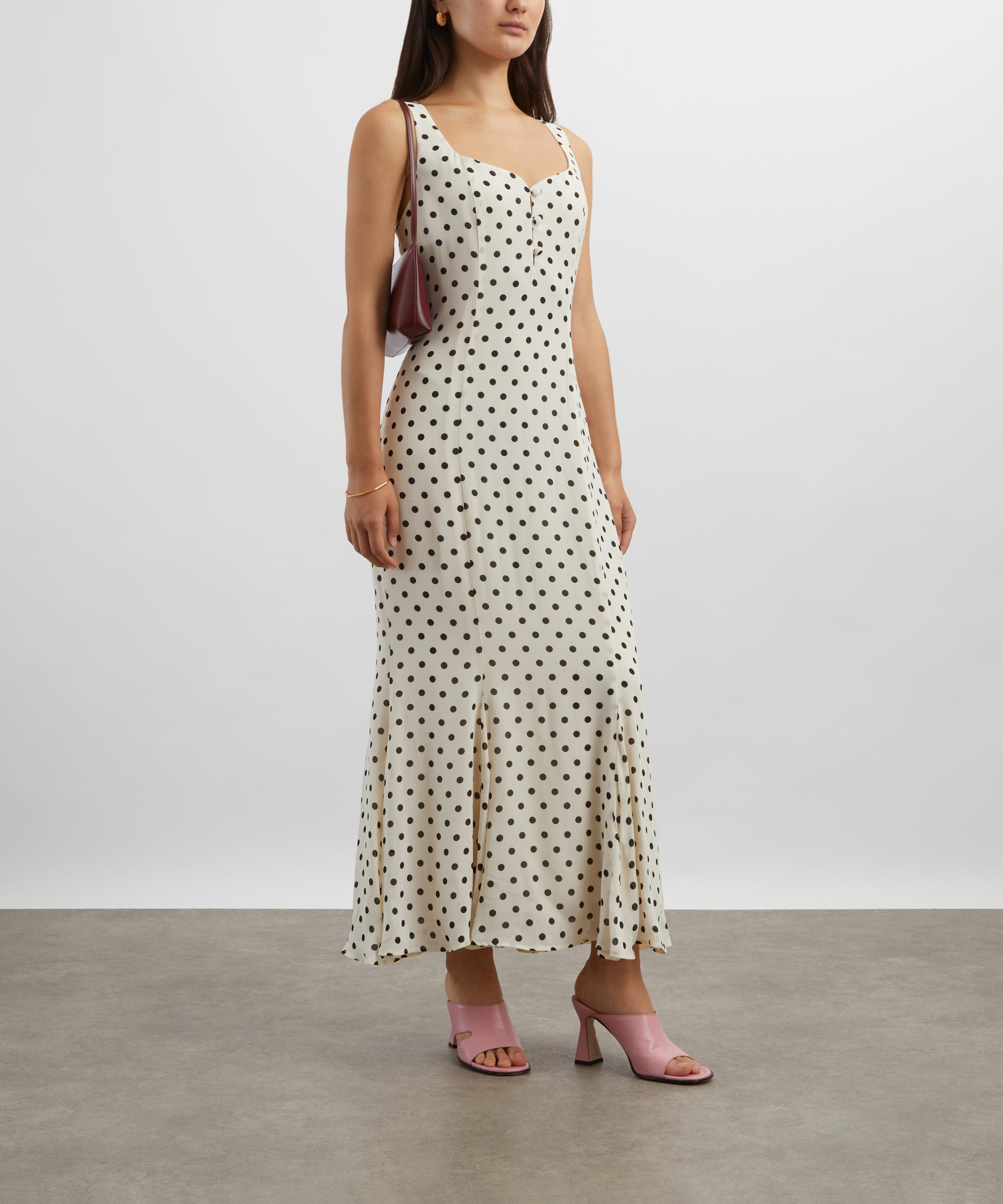 Crafted from a lightweight georgette fabric adorned with a timeless polka-dot print, the Laine dress exudes effortless elegance. Designed with a curved neckline and fitted bodice, its flowing mermaid-shape skirt falls to an ankle-grazing maxi length for a graceful finish.