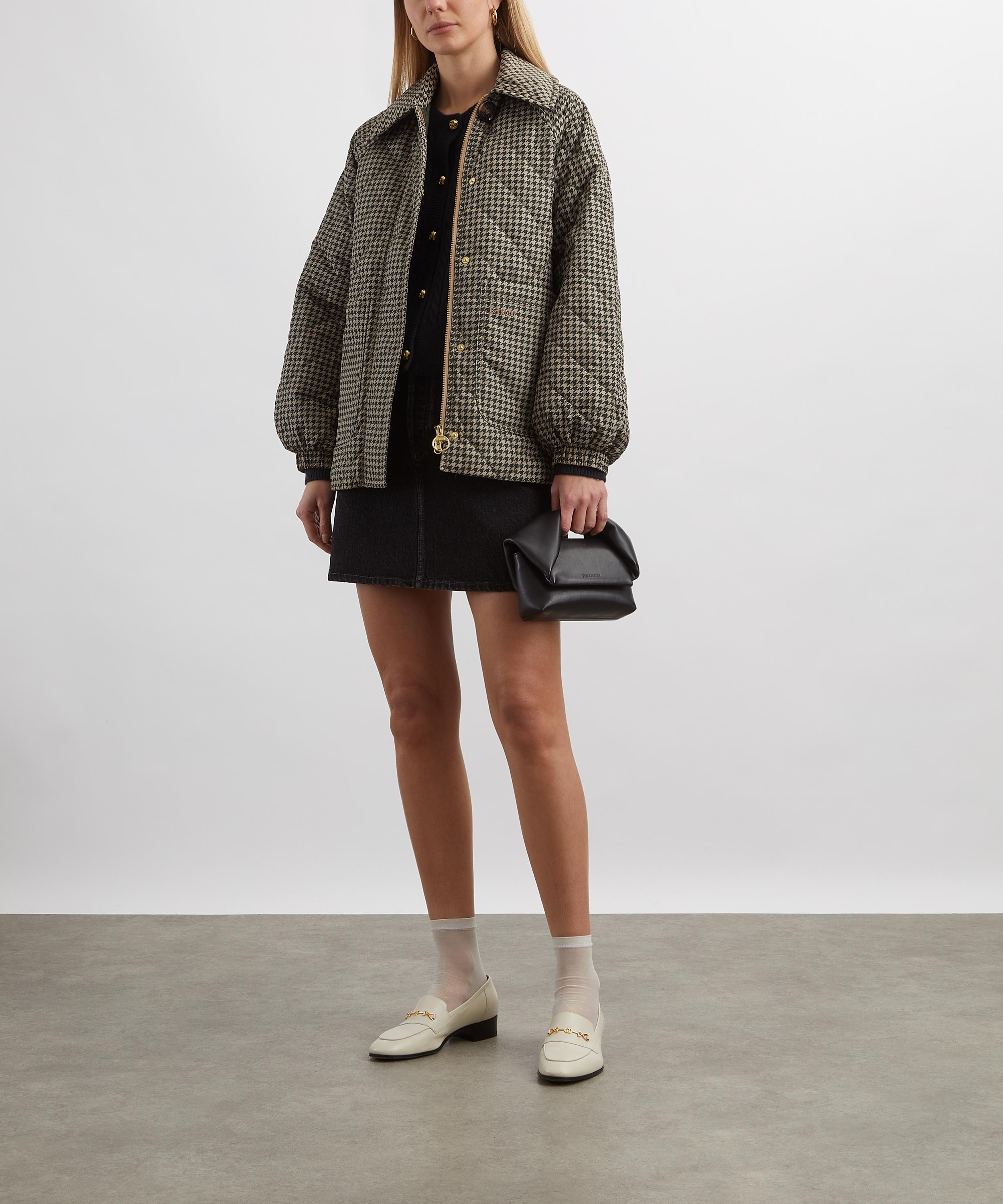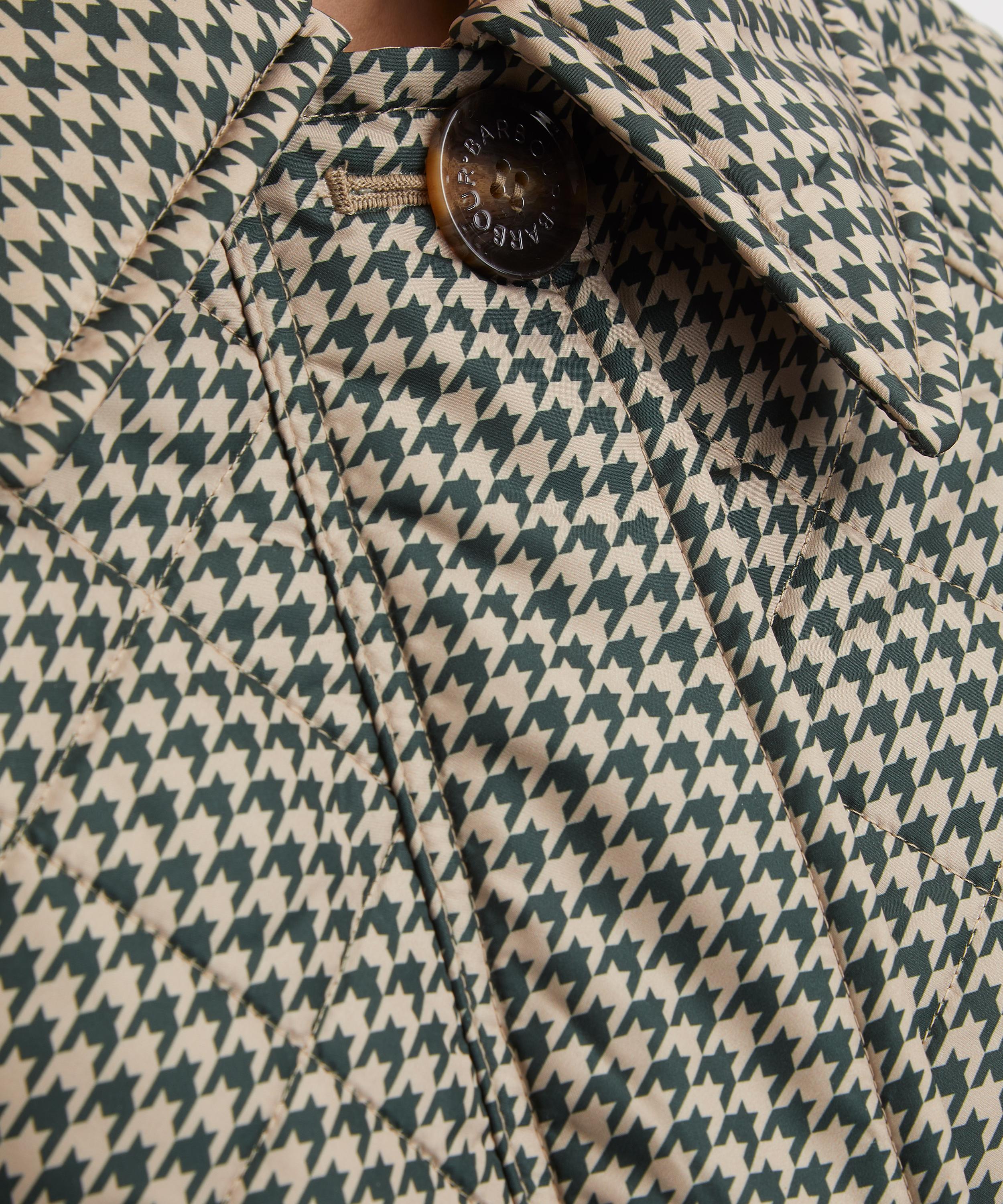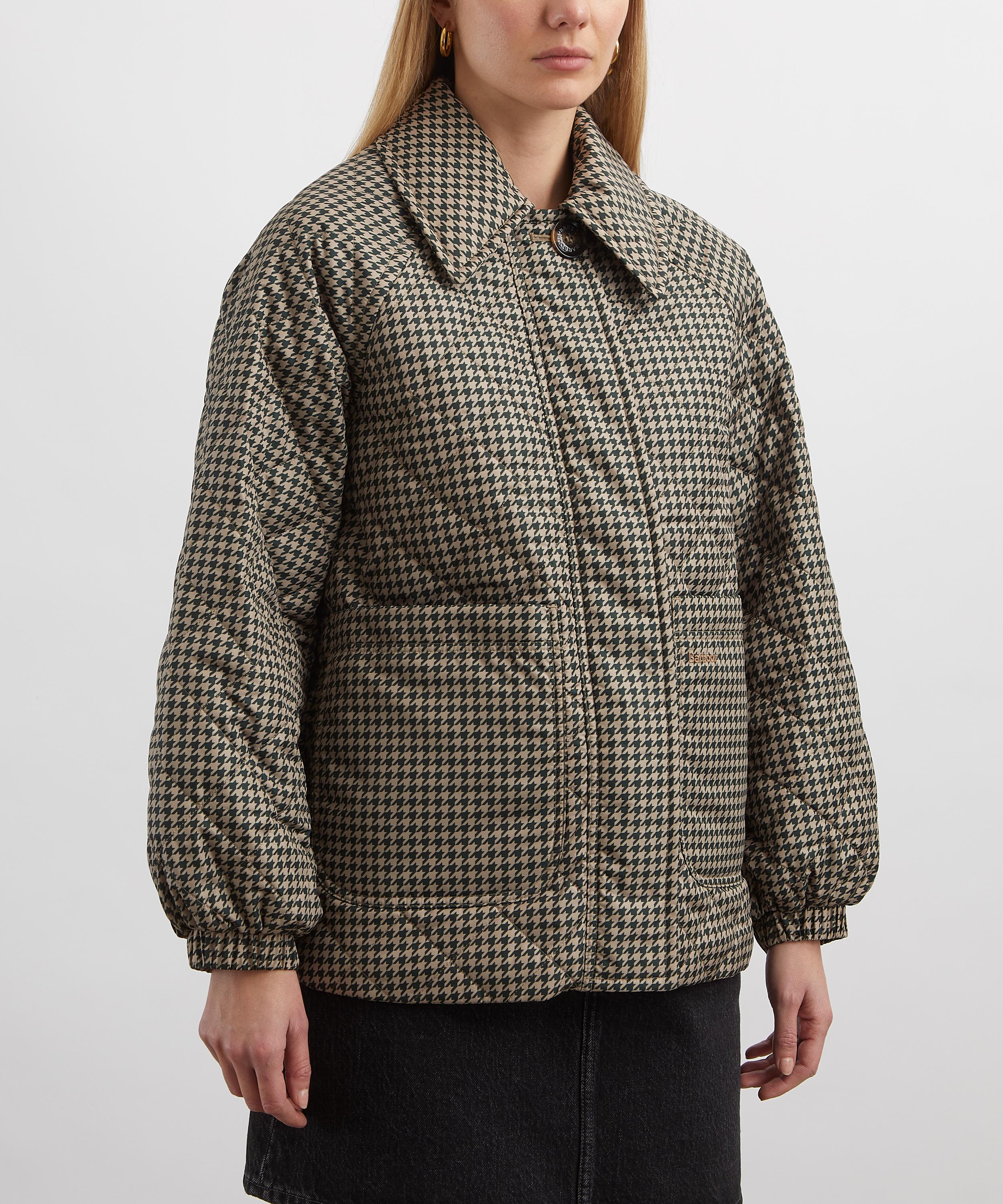 Adorned in a khaki houndstooth check, the Laoise Quilted Jacket updates a classic bomber silhouette with 2-inch box quilting and a relaxed fit. Oversized gathered sleeves with elastic cuffs, a centre-back hem detail, and a concealed stud fastening with a signature 50L button add both style and practicality, while unquilted patch pockets provide a modern finishing touch.