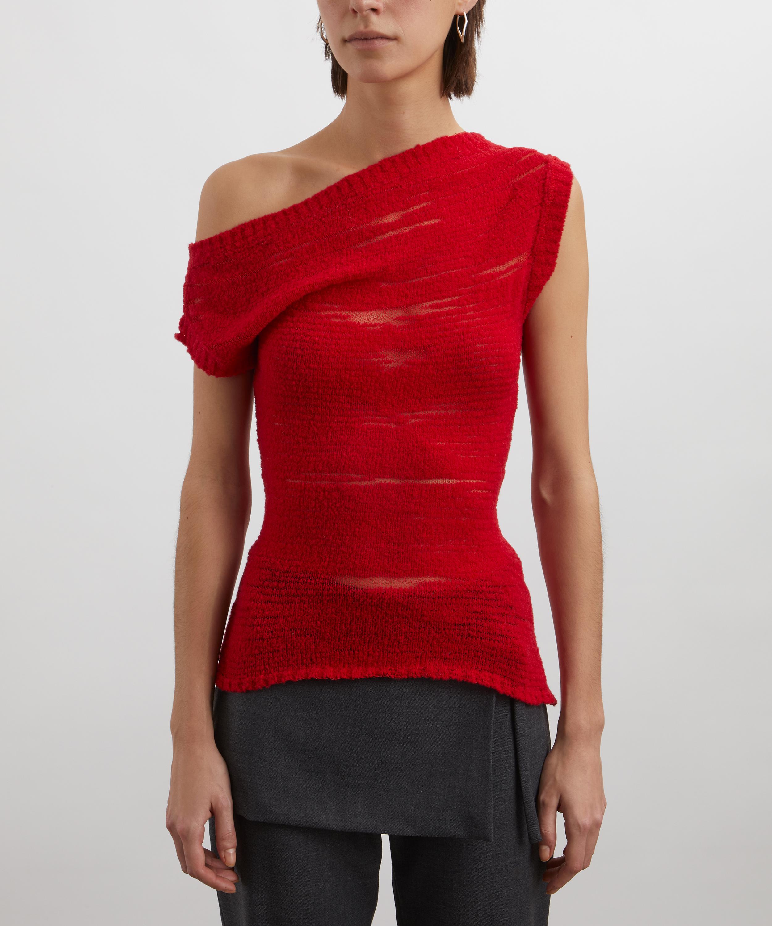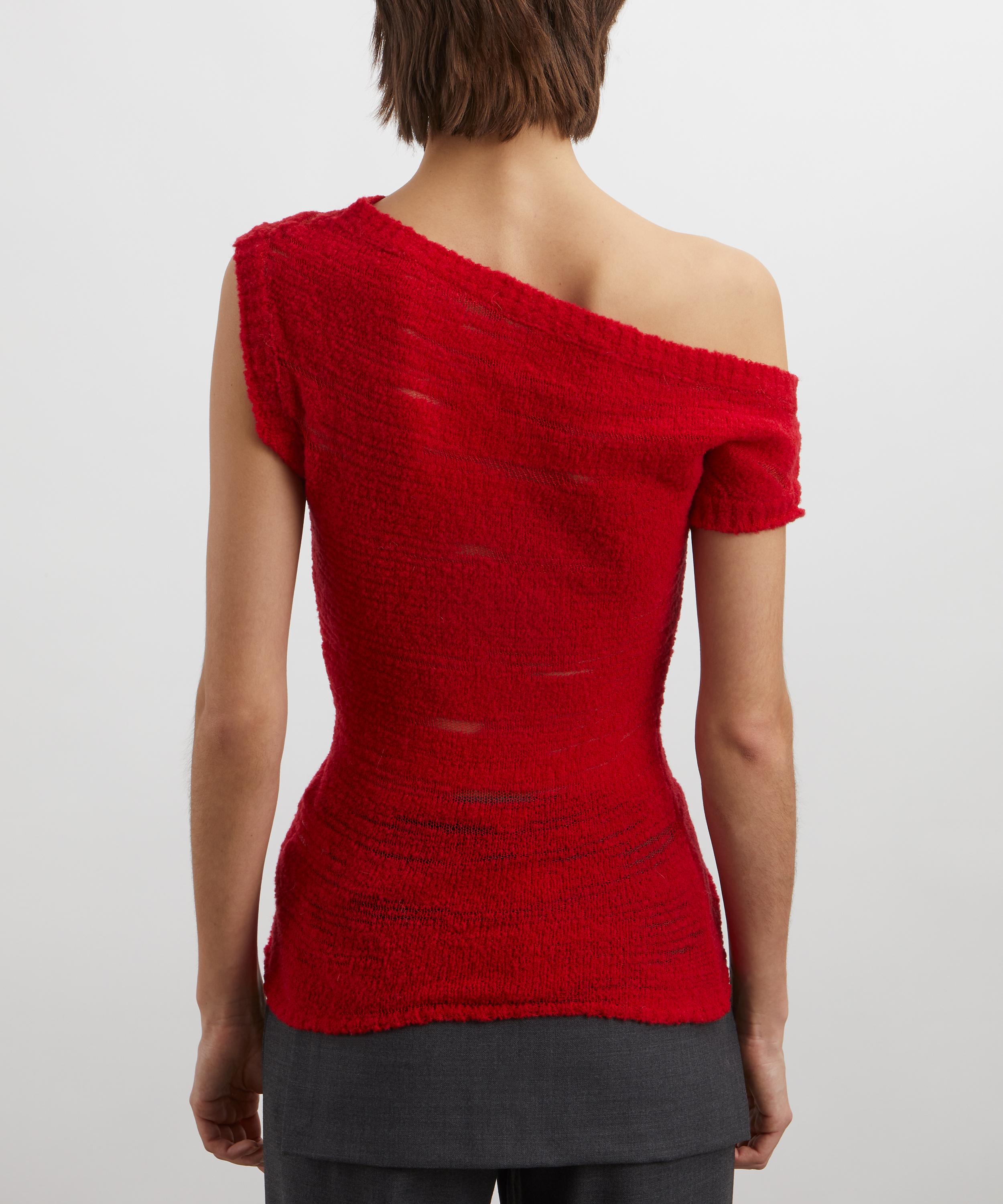 Woven from a soft wool yarn presenting a tactile, streaky texture, this vibrant red top features a form-fitting body and a draped, asymmetric neckline, combining comfort with a unique, abstract silhouette.