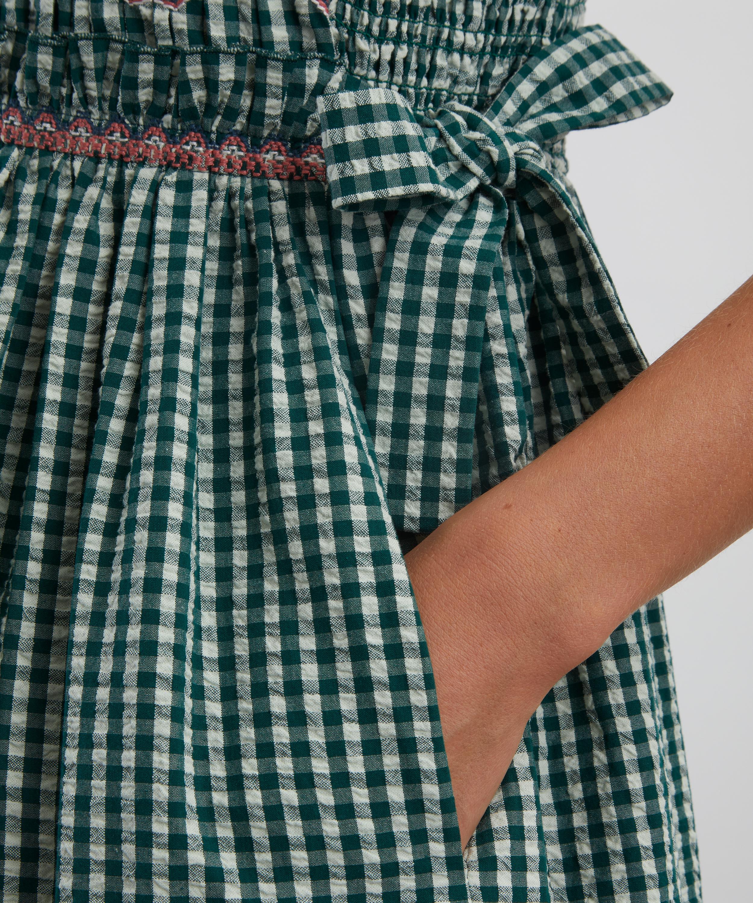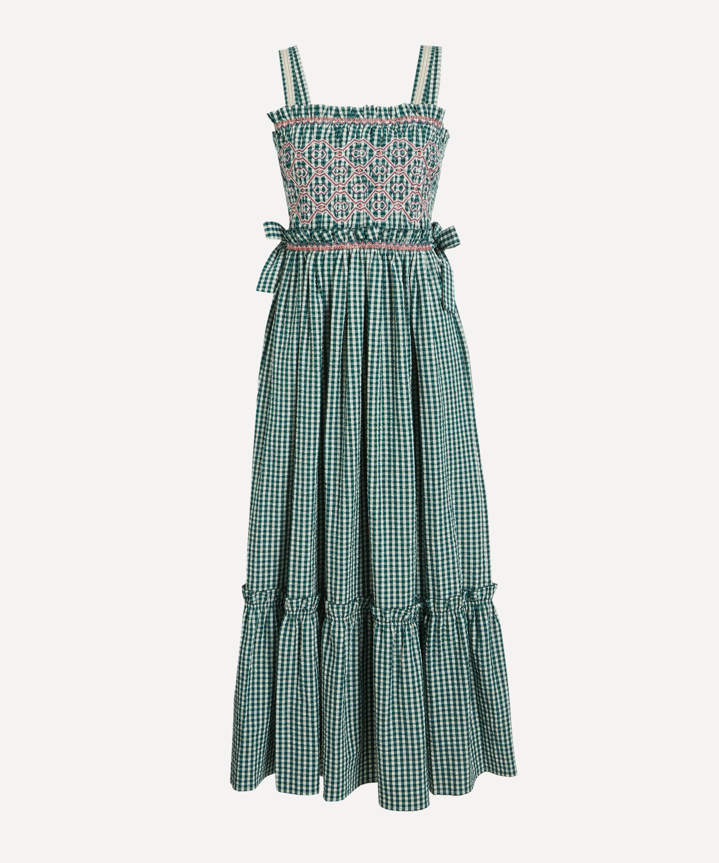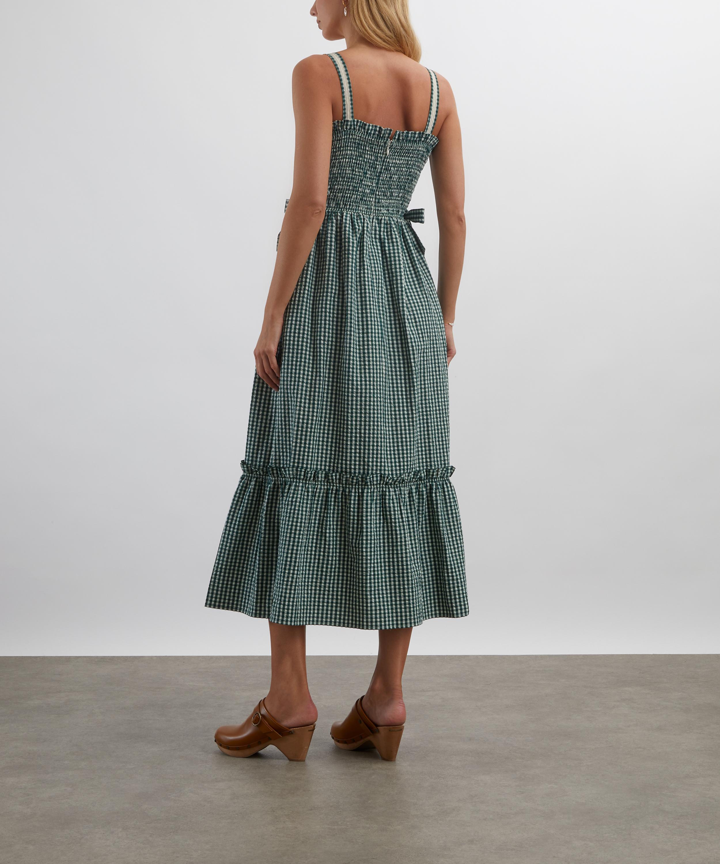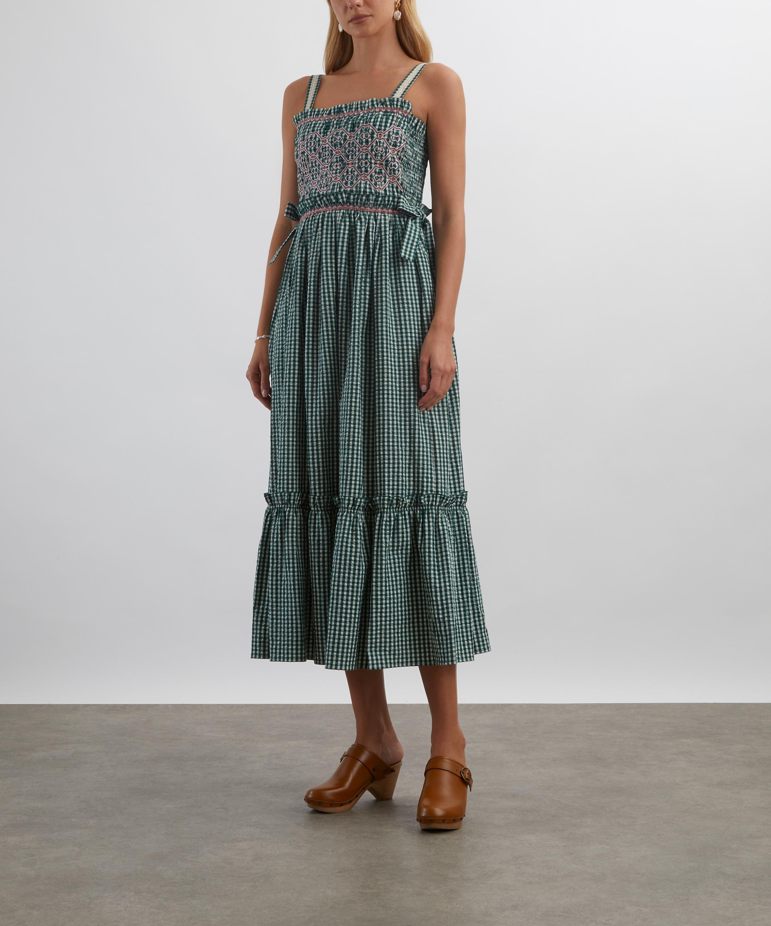 Defined by its intricately embroidered smocked bodice, adjustable grosgrain-detailed straps, and delicate side ties, the Larissa dress embodies thoughtful design. Crafted from cotton seersucker in a classic green and white gingham, it features a breezy tiered skirt that adds playful movement and timeless charm to this standout piece.